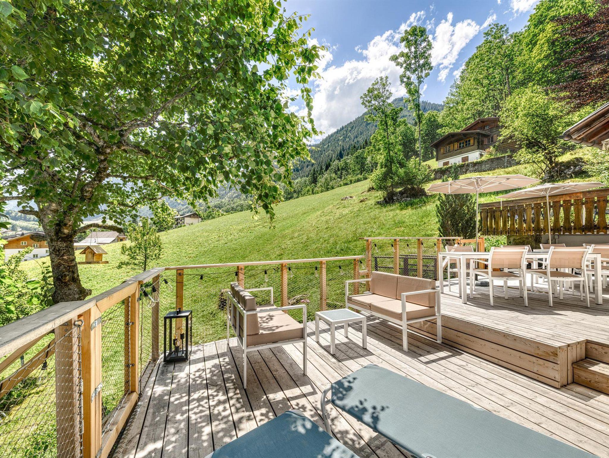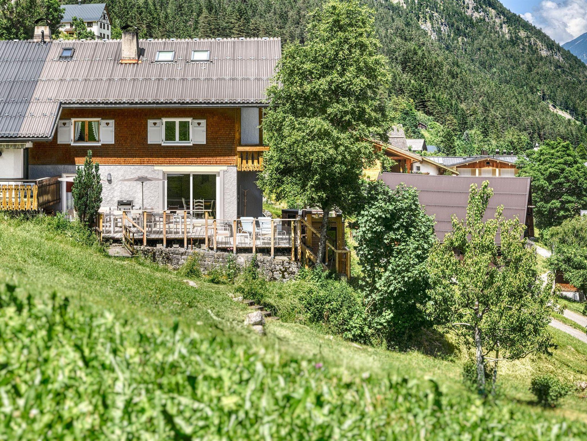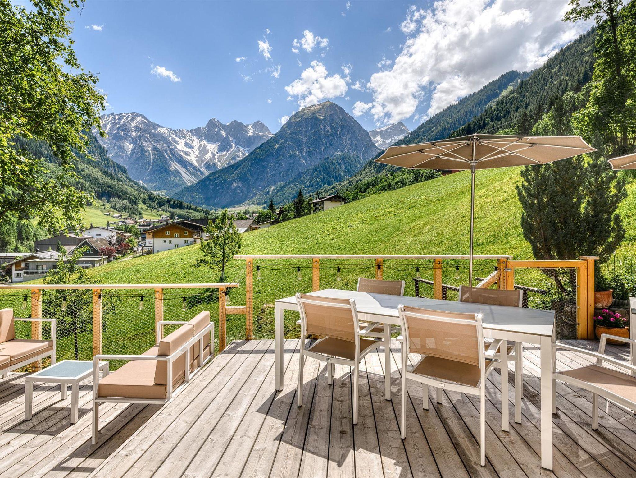 Mit dem unverbauten Panorama-Bergblick und den angrenzenden Wiesen und Wäldern ist das Haus ein echtes Ferienidyll! Eine großzügige Holzterrasse mit circa 100 m² Fläche (ausgerichtet nach SO und SW) laden die Erwachsenen ein, die Sonnenstrahlen des Brandnertals zu genießen.