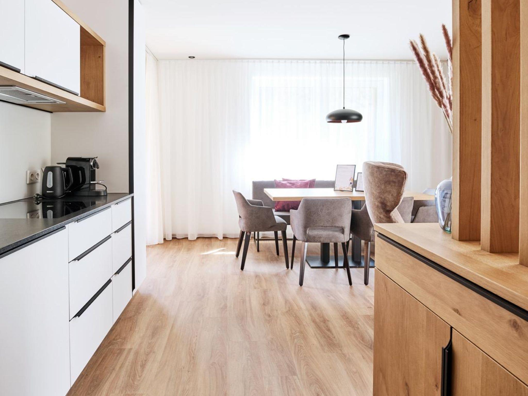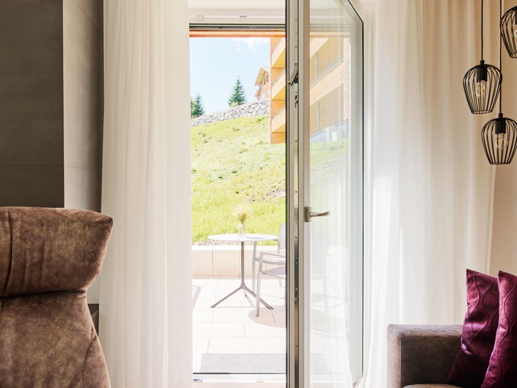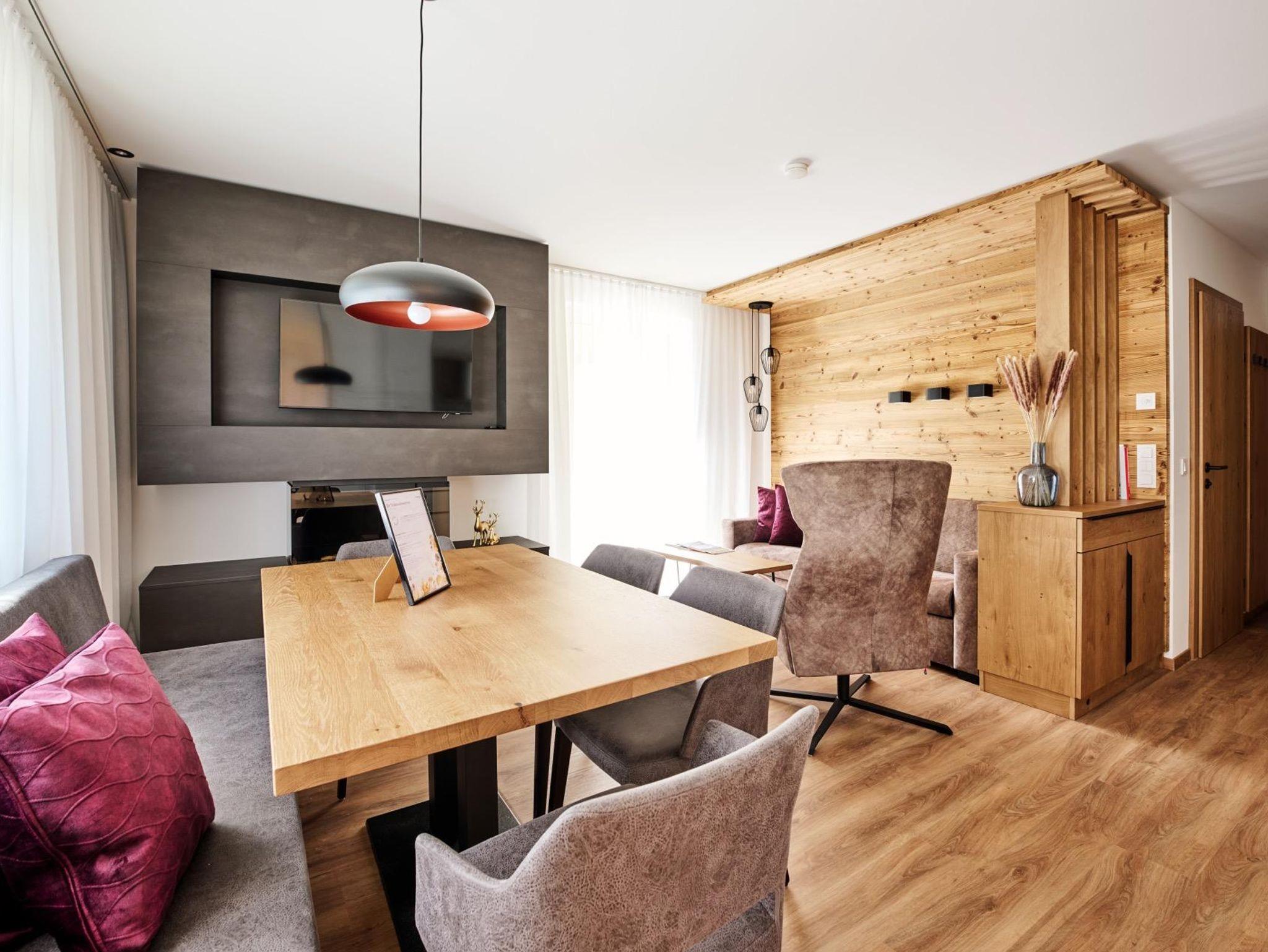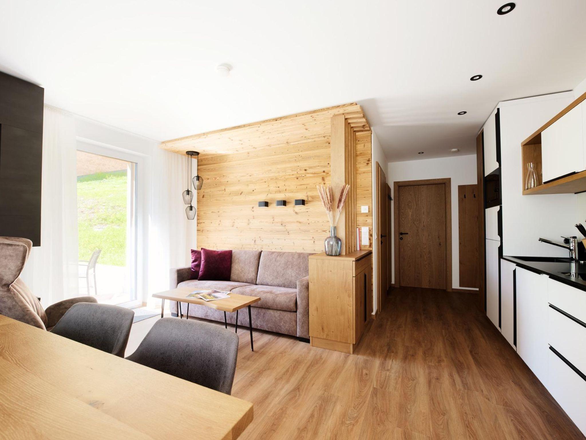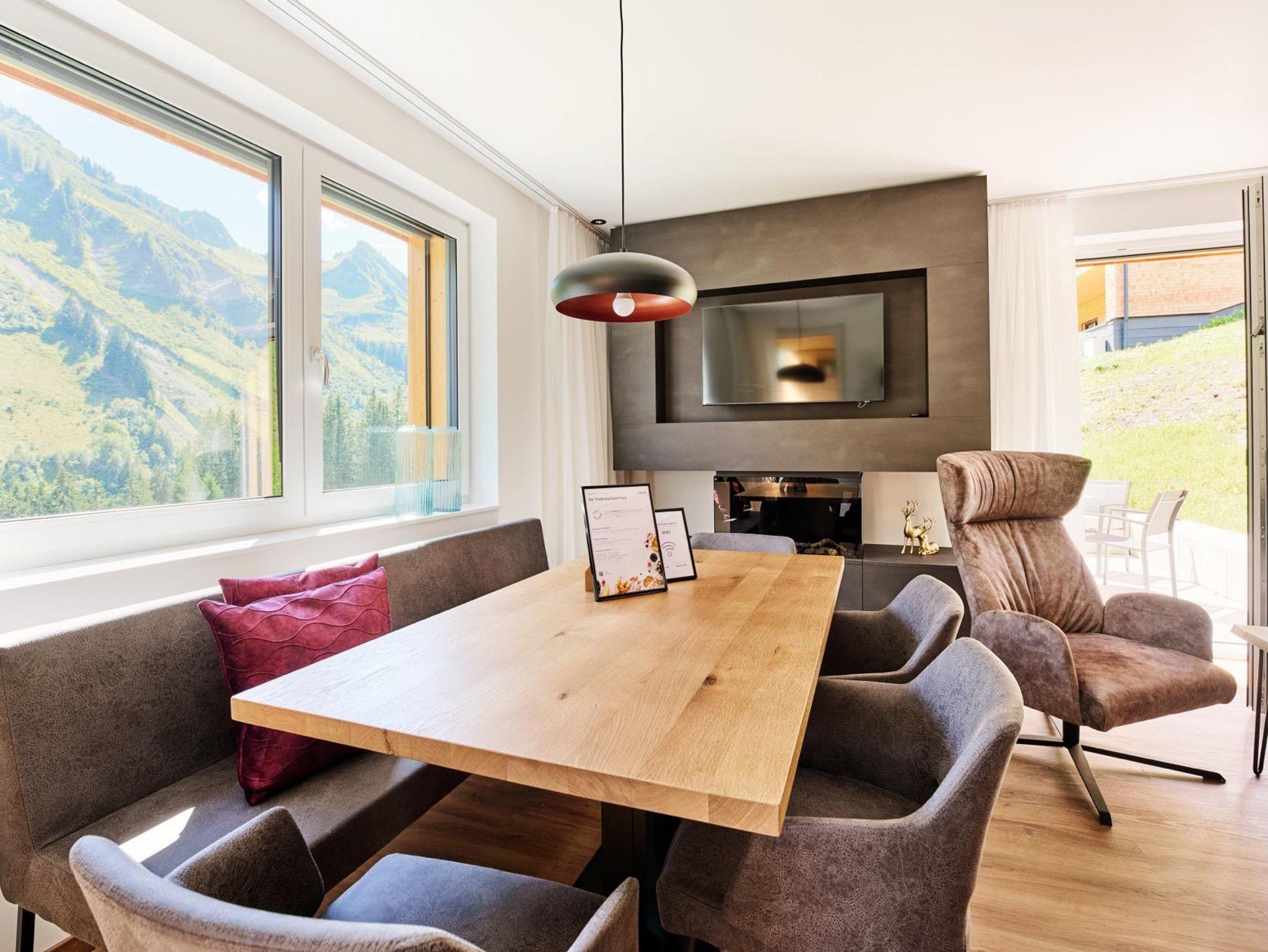 Die offenen, hellen Räume, veredelt mit Täfelungen aus Altholz laden ein zum gemütlichen Verweilen nach erlebnisreichen Urlaubstagen. Durch die südseitige Ausrichtung der Apartments genießen Sie von morgens bis abends einen spektakulären Blick in die Bergwelt rund um Damüls.