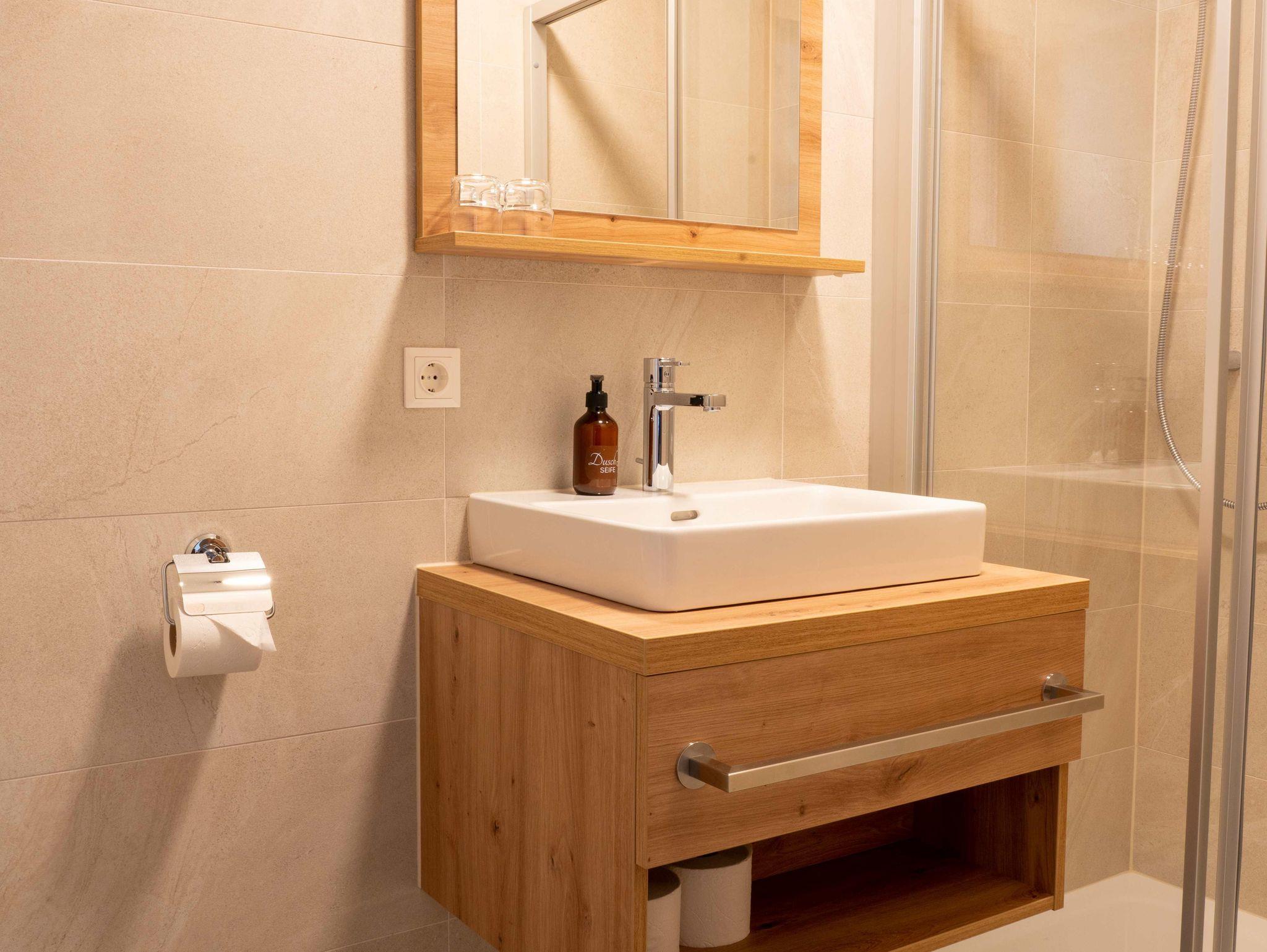 • geräumigen, Vollholz-möblierten Einzel-, Doppel-, Familienzimmern und Studios mit Boxspringbetten in „Treca“ Topqualität, Dusche oder Badewanne, separatem WC