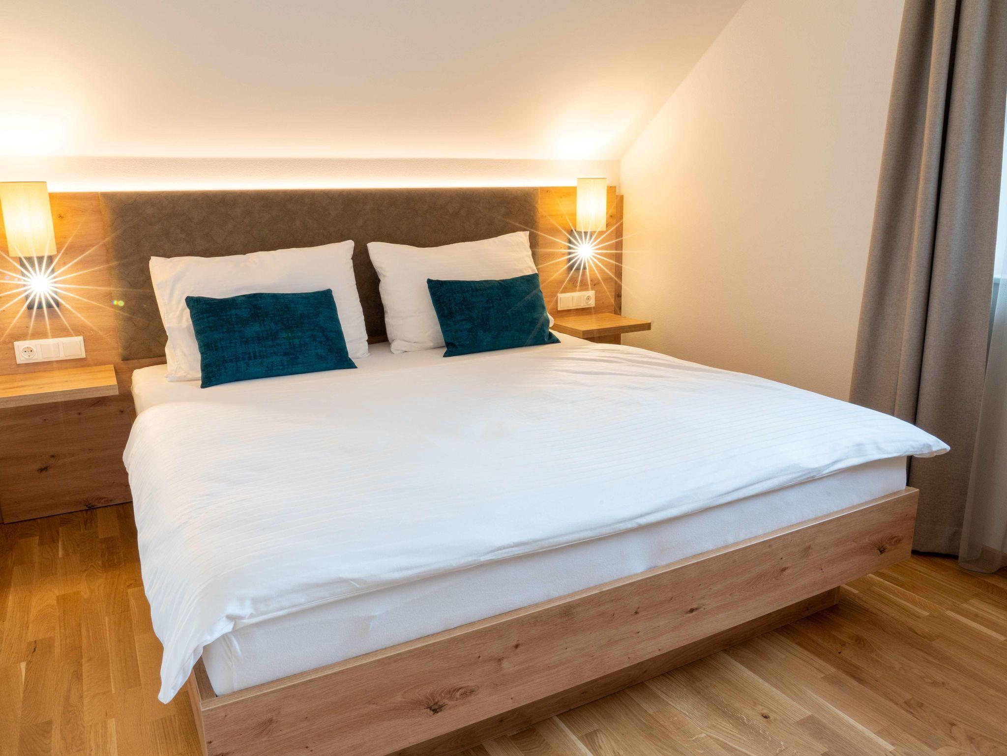 • geräumigen, Vollholz-möblierten Einzel-, Doppel-, Familienzimmern und Studios mit Boxspringbetten in „Treca“ Topqualität, Dusche oder Badewanne, separatem WC