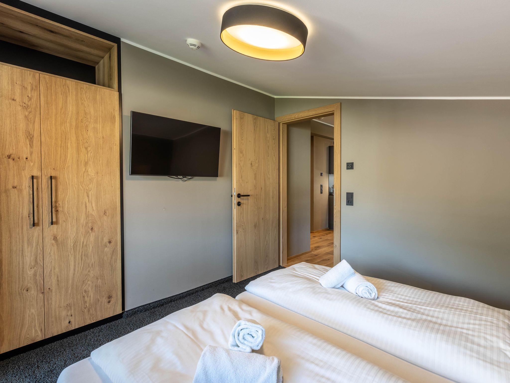 Das Apartment für 6 Personen bietet Wohnküche, 2 Schlafzimmer (Boxspringbetten 1x eigenes Bad, 1x Balkon), 2 Badezimmer und einen Balkon. Der Eingangsbereich, mit Garderobe, führt direkt in den Wohnbereich mit Küche. Die Küche ist mit Küchengeräten, Kühl-Gefrierkombi sowie Nespresso Kaffeemaschine ausgestattet ist. Der Esstisch bietet Platz, um ein selbstgekochtes Mahl zu genießen. Im Wohnbereich befinden sich TV, Kleiderschrank und ein Ausziehsofa.