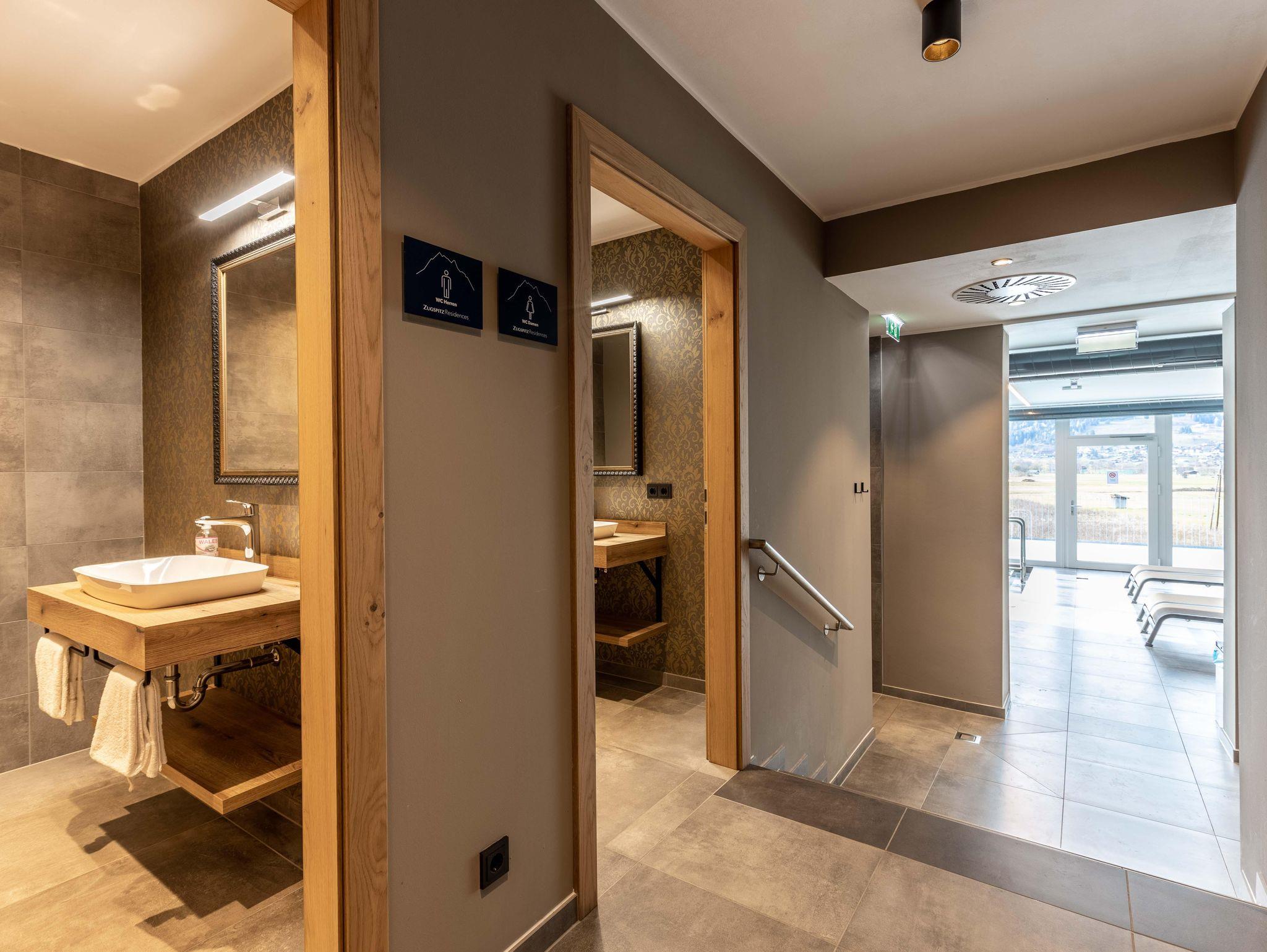 Zugspitz Residences liegt im Herzen von Ehrwald, direkt neben dem Golfplatz und in unmittelbarer Nähe des weit bekannten Ehrwalder Schigebiets. Dieser einzigartige, familienfreundliche Topspot garantiert ganzjährig Sport- und Freizeiterlebnisse der besonderen Art. Die bequem vom Haus aus zu erreichende Zugspitz Arena mit 56 Bergbahnen bietet auf 142 Pistenkilometern abwechslungsreiches Skivergnügen in allen Schwierigkeitsgraden! Des Weiteren sind eine problemlose Anbindung (Flughafen Innsbruck, 75 km - Flughafen München (DE), 147 km - Flughafen Salzburg, 196 km - Flughafen Zürich (CH), 200 km) und diverse Ausflugsziele (Bayrische Königsschlösser, Seefeld, Ötzi Dorf, Swarovski Kristallwelten, Innsbruck uvm.) gegeben. Parkmöglichkeiten sind rund um die Residenz vorhanden. Für Körper und Seele besteht im Erdgeschoß ein exklusiver Wellnessbereich mit Indoor-Infinity-Pool, finnischer Sauna, Bio-Sauna sowie Infrarotkabine, Regenerationsdusche und einem Ruheraum für totale Entspannung. Der Außenbereich animiert im Sommer zum Relaxen in der Sonne und im Winter ist dort Erfrischung nach einem ausgiebigen Saunagang möglich.