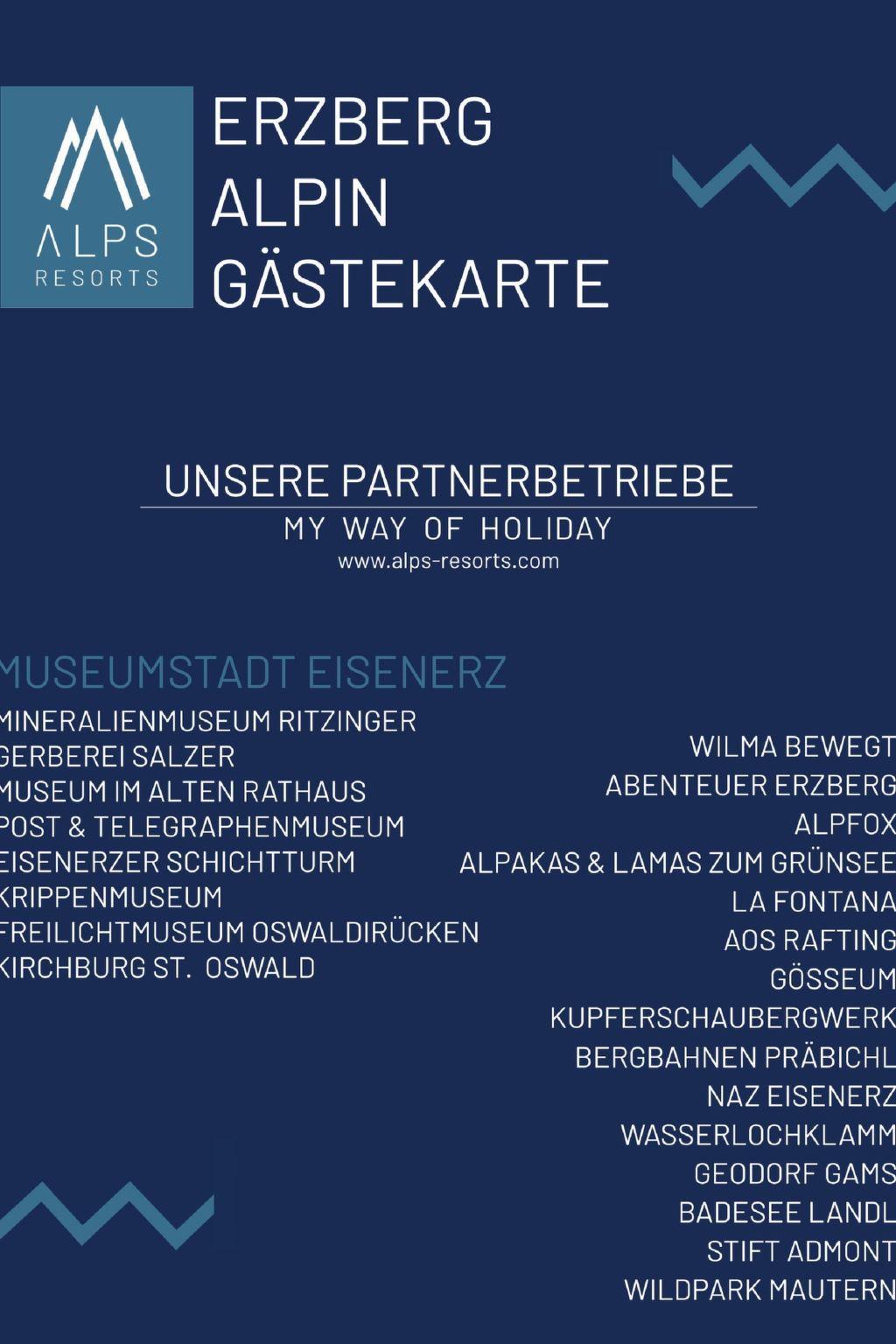 Here, a historic miners' settlement has been carefully adapted for tourism. Modern, comfortable resort "Erzberg Alpin by Alps Resorts". 3 km from the centre, in a sunny, elevated position, 1.5 km from the lake, 11 km from the skiing area. For shared use: large garden with plants and trees, lawn for sunbathing. Children's playground, planted inner courtyard. In the complex: reception, WiFi, central heating system, washing machine (for shared use, extra). Breakfast and half board (extra). Parking at the house. E-charging station. Supermarket 1.5 km, restaurant 200 m, diving center 6 km, indoor swimming pool 3 km, lake Leopoldsteiner See 1.5 km. Sports centre 100 m, skisport facilities 11 km, cross country ski track 6 km, ice rink 1.5 km. Nearby attractions: Abenteuer Erzberg 5 km, Naturpark Gesäuse 12 km, Schaubergwerk Radmer 17 km. Well-known ski regions can easily be reached: Skigebiet Präbichl 12 km. Hiking paths: Hochschwab. Please note: car recommended. The photo is just an example. Admission to the Vitalbad Eisenerz + 1 city tour per stay FREE for all guests! The Vitalbad closed in September for renovation. Erzberg Alpin guest card included.