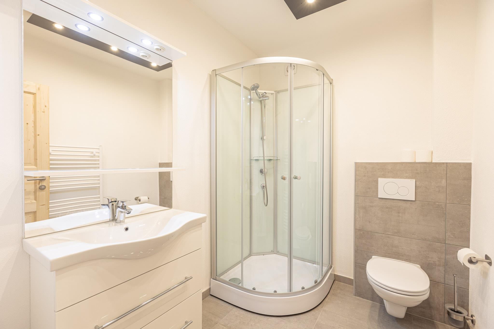 On the 1st floor: (Living room(TV(satellite), dining table, seating area), open kitchen(hob(4 ring stoves, ceramic), toaster, coffee machine(cups, espresso), oven, microwave, dishwasher, fridge(+ freezer)), Internet access) On the 2nd floor: (bedroom(double bed), bedroom(double bed, bunk bed), bedroom(double bed), bedroom(bunk bed, bunk bed), bathroom(shower, washbasin, toilet), bathroom(shower, washbasin, toilet), bathroom(shower, washbasin, toilet), bathroom(shower, washbasin, toilet)) balcony, heating(central), garden furniture, parking, parking, parking, Charging post for electric cars