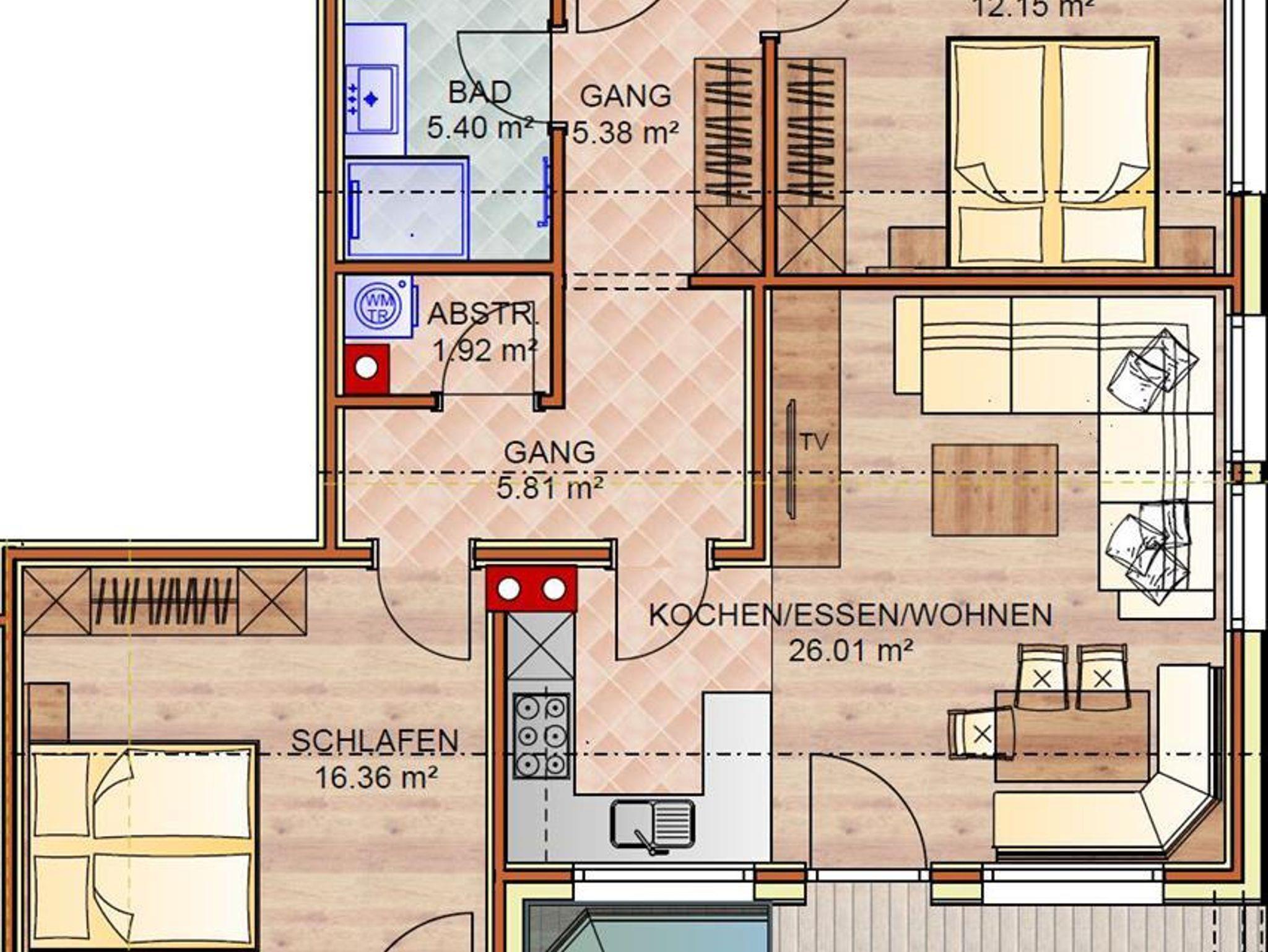 Unser neues Appartement besteht aus einer Küche die zum Wohn- und Essbereich hin offen ist, im Wohnzimmer befindet sich eine Schlafcouch für maximal 2 Personen, zwei große Schlafzimmer mit TV für jeweils zwei Personen und ein schönes Badezimmer mit Dusche und WC.