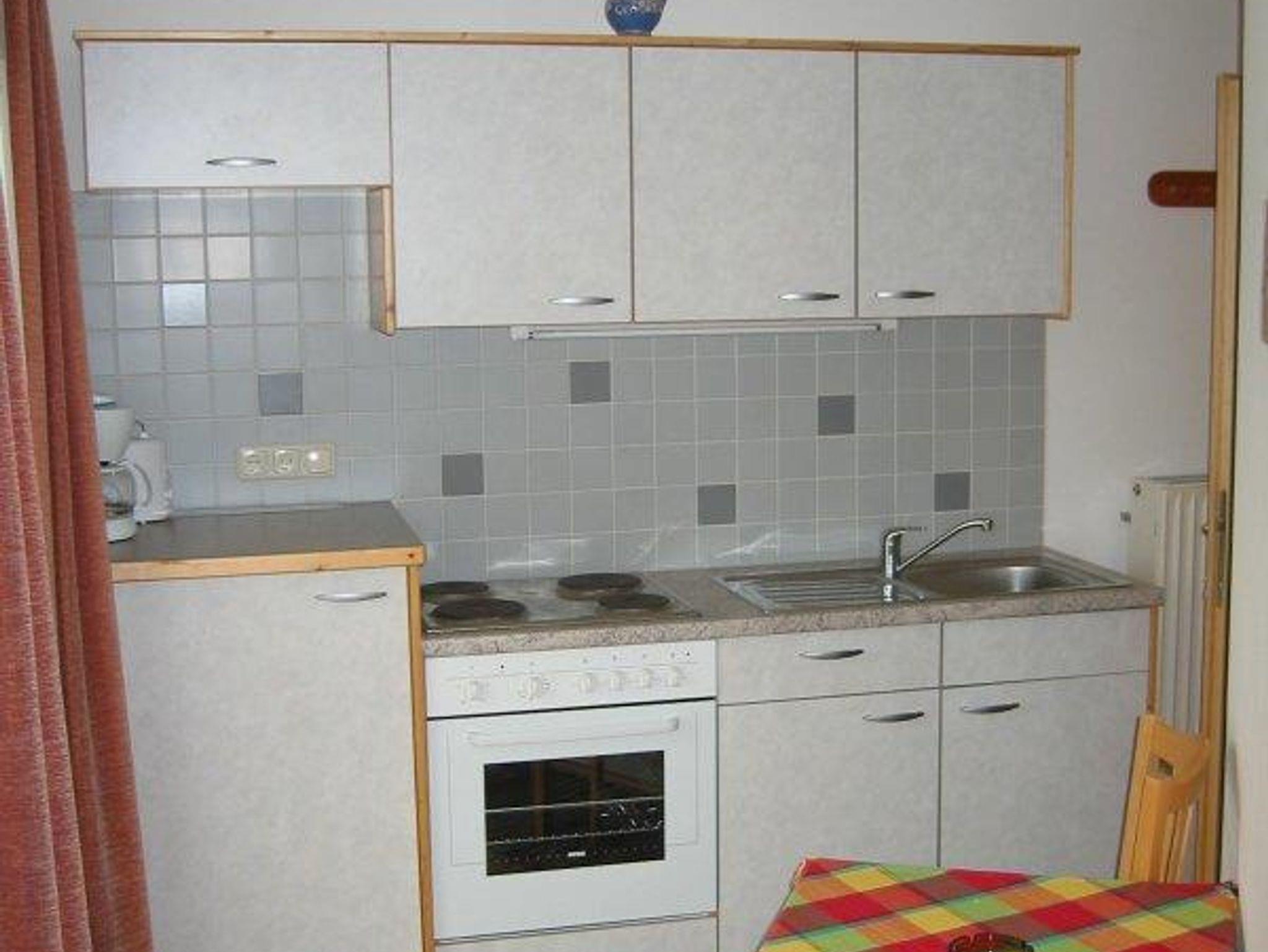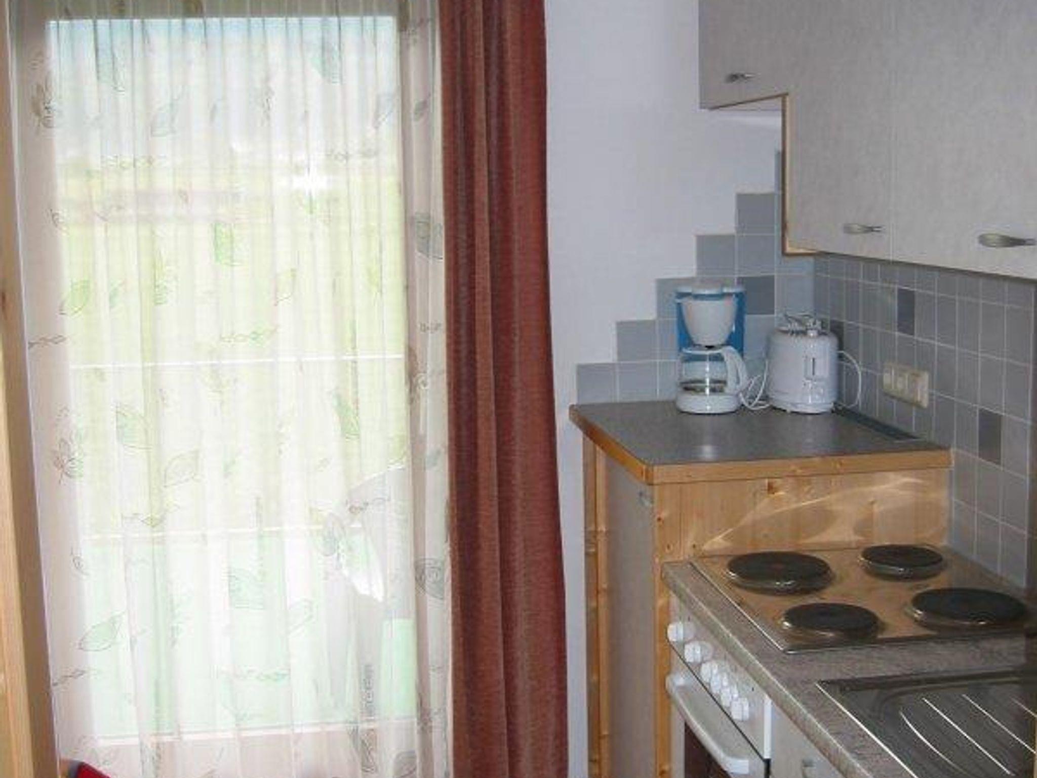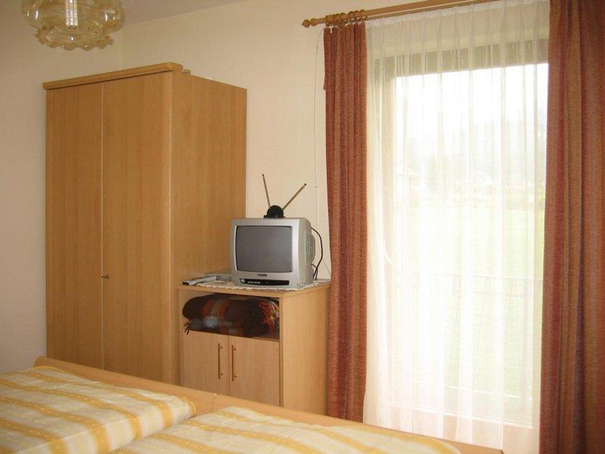 Schöne Wohnung (28m²), 2 Personen mit großem Südbalkon und Mittagskogelblick. Schlafzimmer mit Doppelbett und SAT-TV, Küche mit Esstisch. Dusche/WC, am Balkon befinden sich ein Tisch, Stühle und Kippliegen.