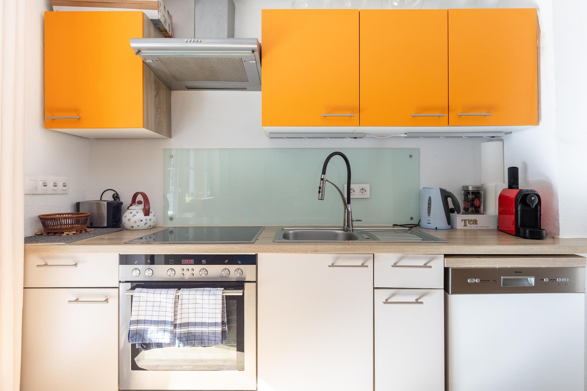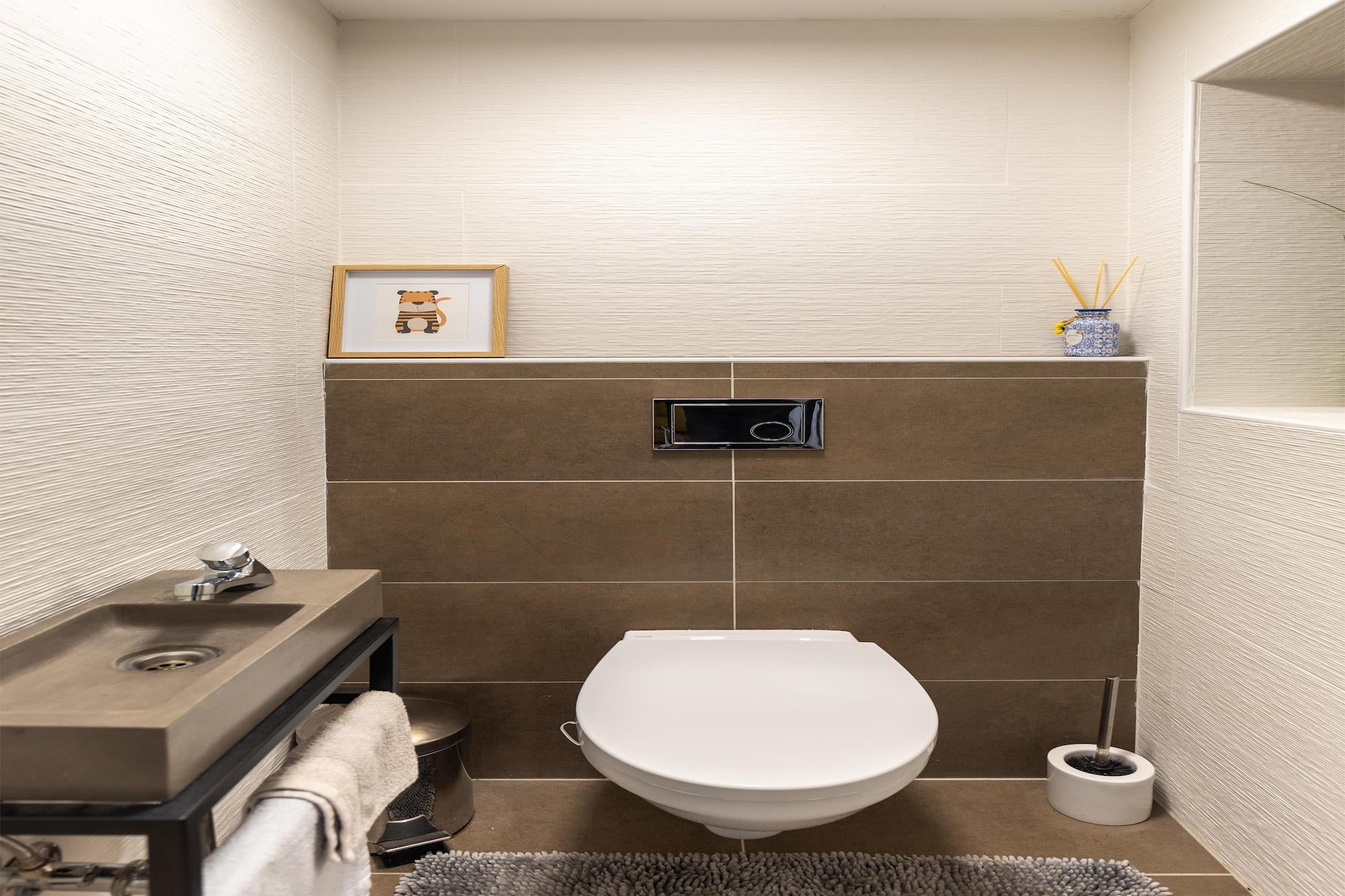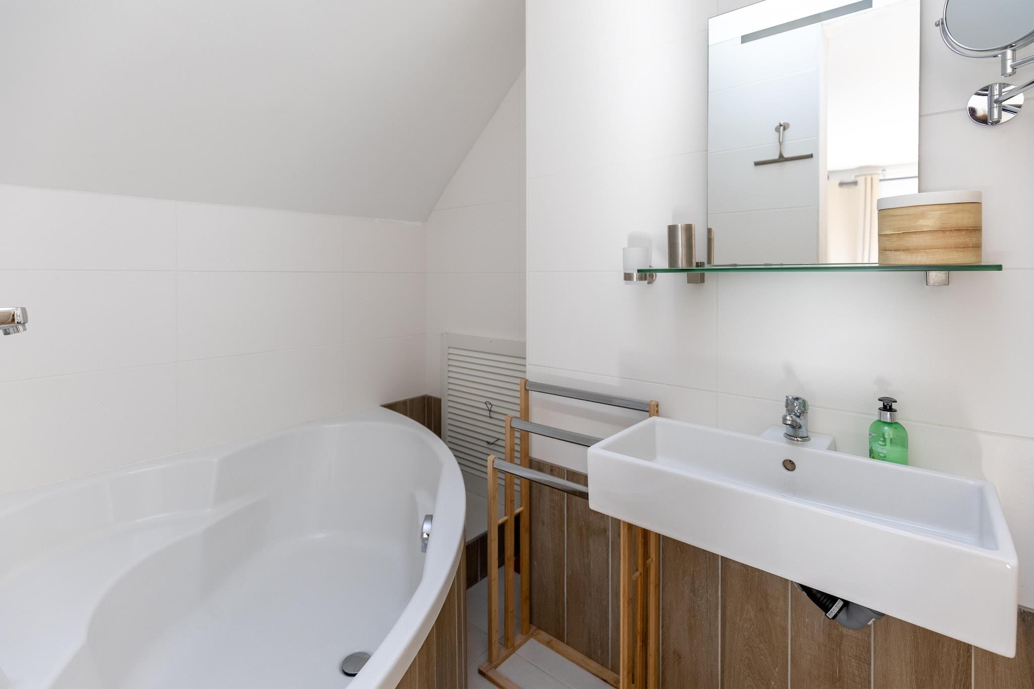 On the 1st floor: (Living room(double sofa bed, TV, seating area), Kitchen(dining table, electric kettle, coffee machine, microwave, dishwasher, fridge-freezer), Bedroom with bathroom(double bed, shower), Bedroom with bathroom(double bed, bath tub), toilet(toilet), toilet(toilet), balcony) toilet, terrace, garden, BBQ, parking