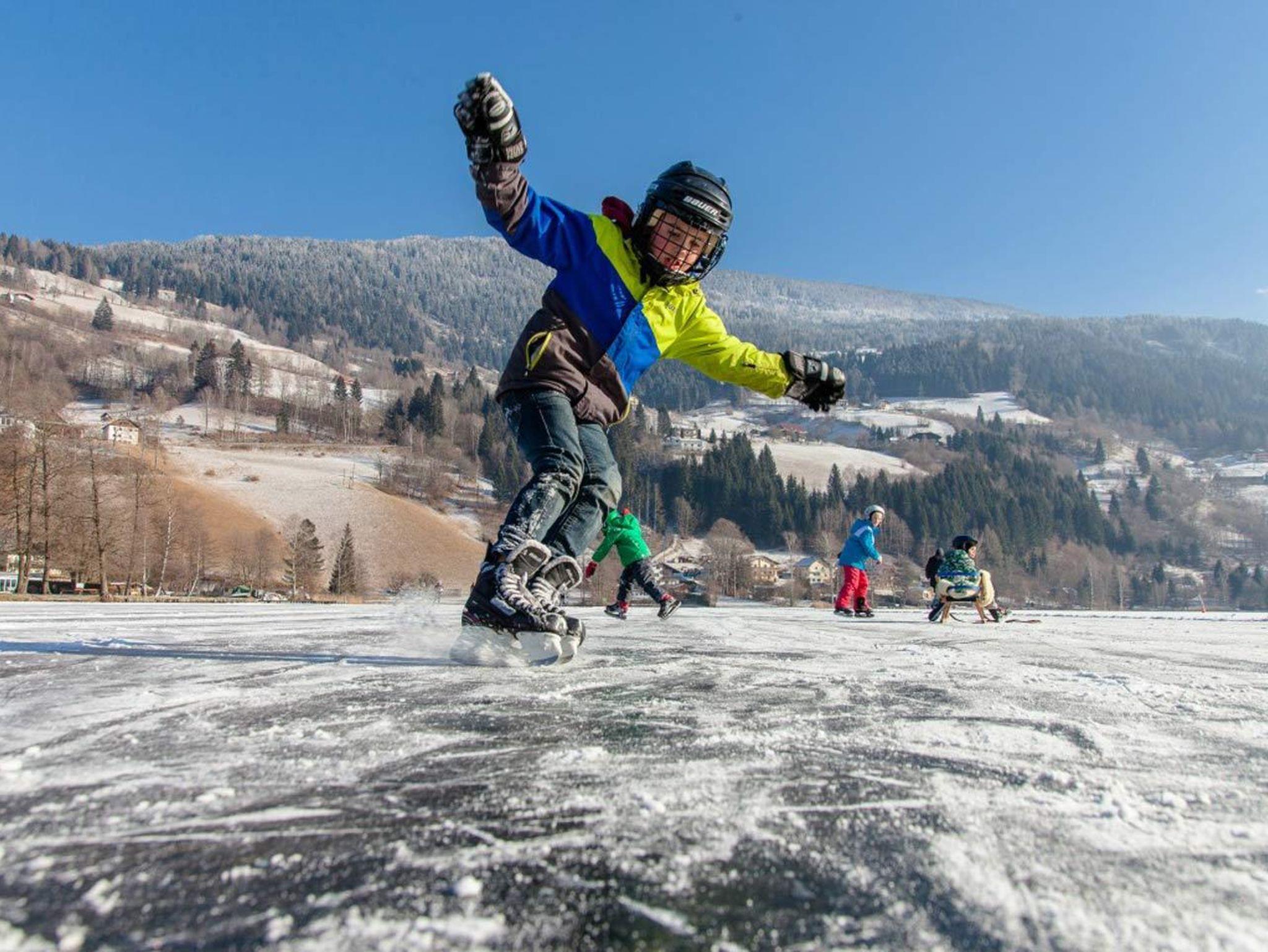 All diese Destinationen erreichen Sie innerhalb von nur 45 Minuten, die genauen Verkehrsverbindungen finden Sie auf der Website des Tourismusverbandes Bad Kleinkirchheim. Und wenn uns das Glück gewogen ist und die Temperaturen passen können Sie sogar auf dem See, an dem das Haus liegt, eislaufen und ein ganz besonderes Ambiente direkt vor der Haustür genießen.