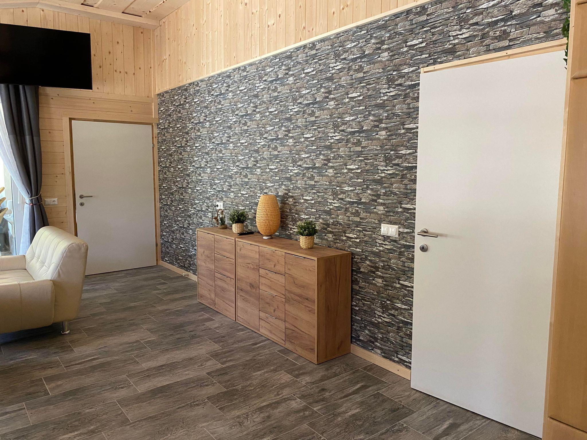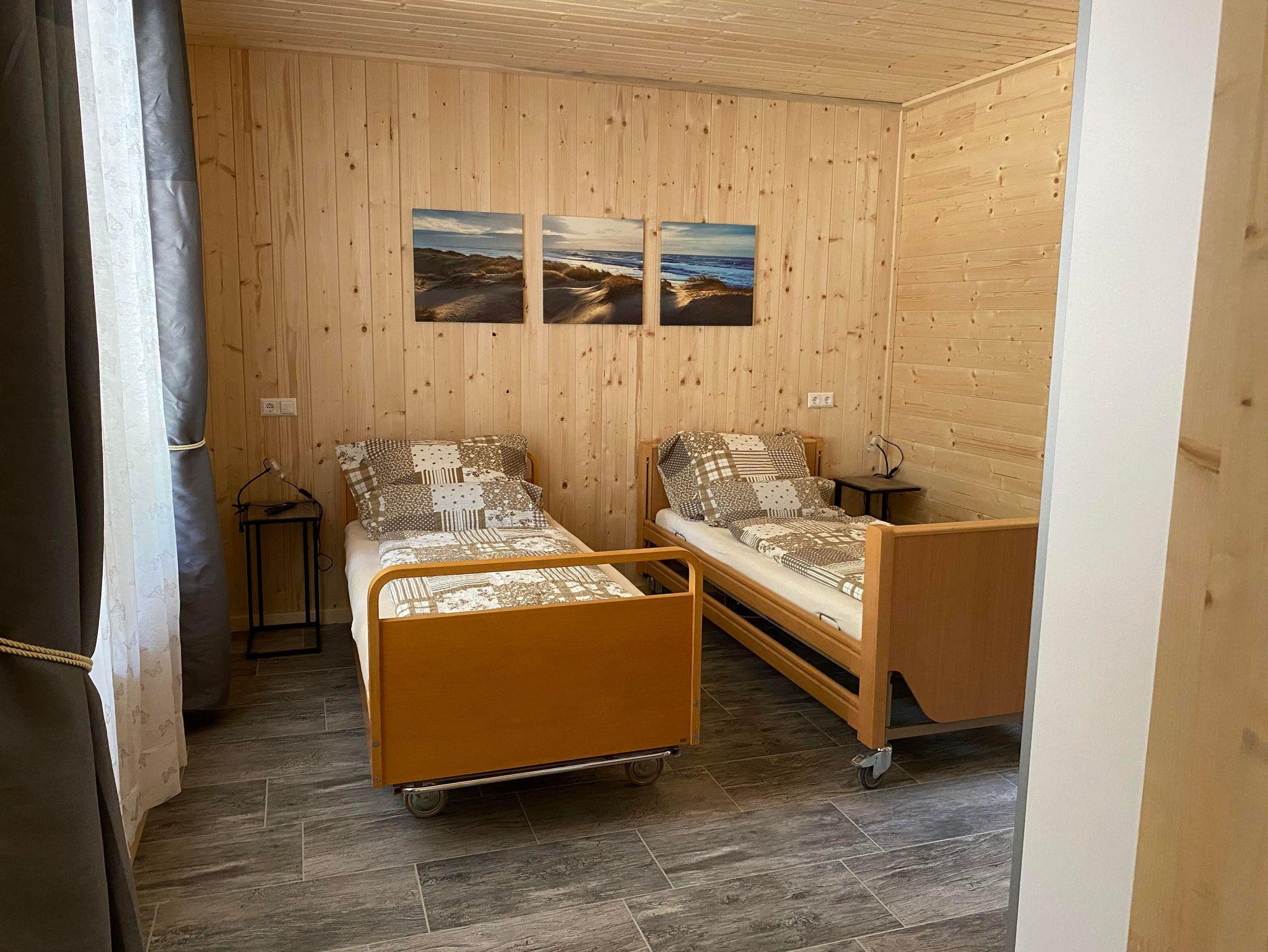 Behindertengerechte Barrierefreie Bungalow unter 1 Dach mit Bungalow 3. Diese können auf Wunsch mit einander verbunden werden mittels Türen und bieten somit dann statt an 6 Personen, an 12 Personen unterkunft. In diese beide Bungalows sind die Räumlichkeiten gespiegeld von einander. Beide sind gleich groß. Beide haben ein Behindertengerechtes Schlafzimmer mit Badezimmer. Weiters gibt es jeweils ein Stockbettzimmer und ein Doppelzimmer (eventuell mit extra Schlafcouch). Auch sind jeweils noch ein extra Badezimmer und extra WC im gebäude. Bungalow 2 hat eine offene überdachte Terrasse und Bungalow 3 hat ein geschlossene Terrasse. Geeignet für Sommer und Winter.