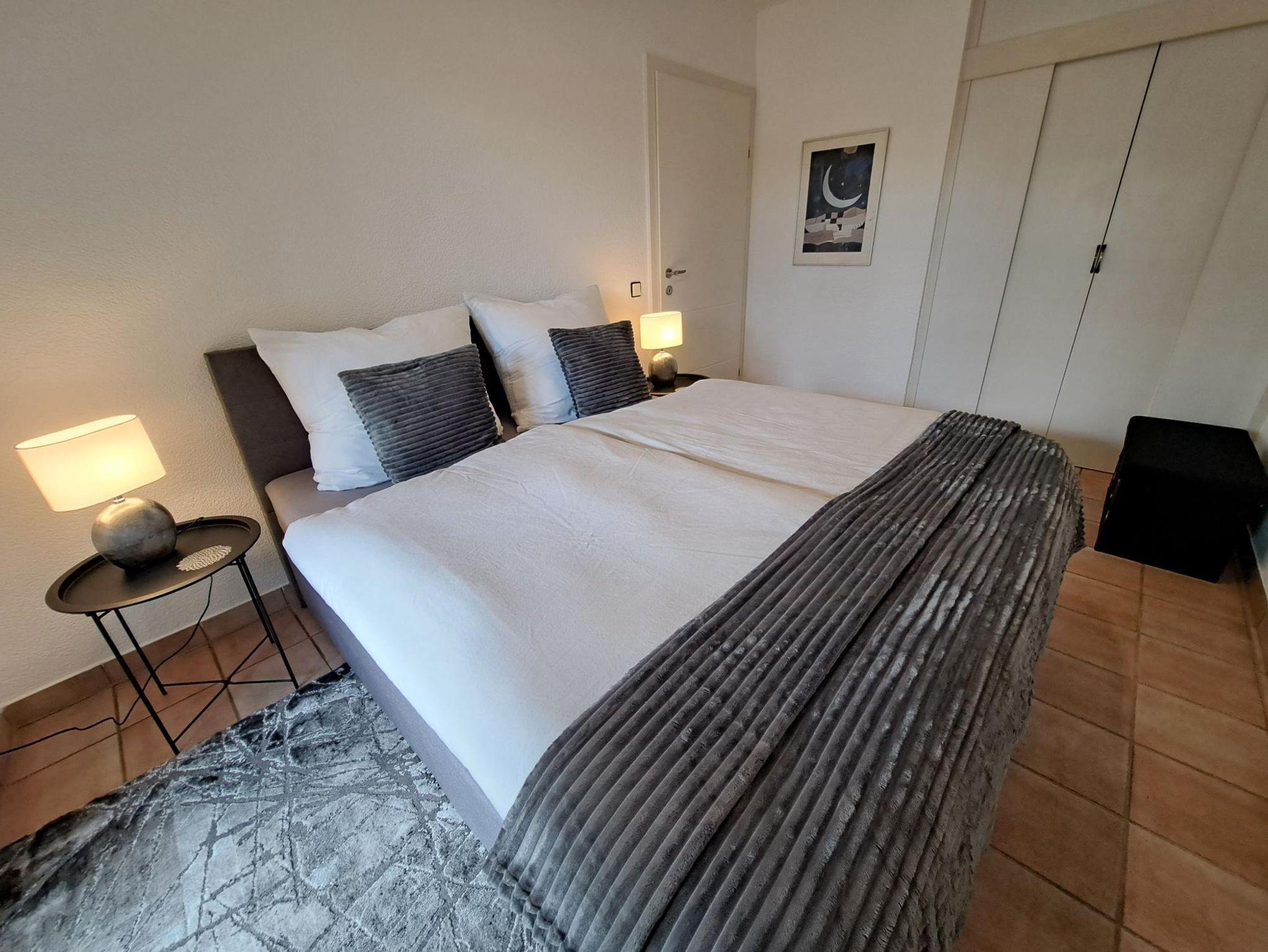 • ein Schlafzimmer mit Boxspringbett 1.60m breit, begehbarem Kleiderschrank und Platz für ein Kinderbett
