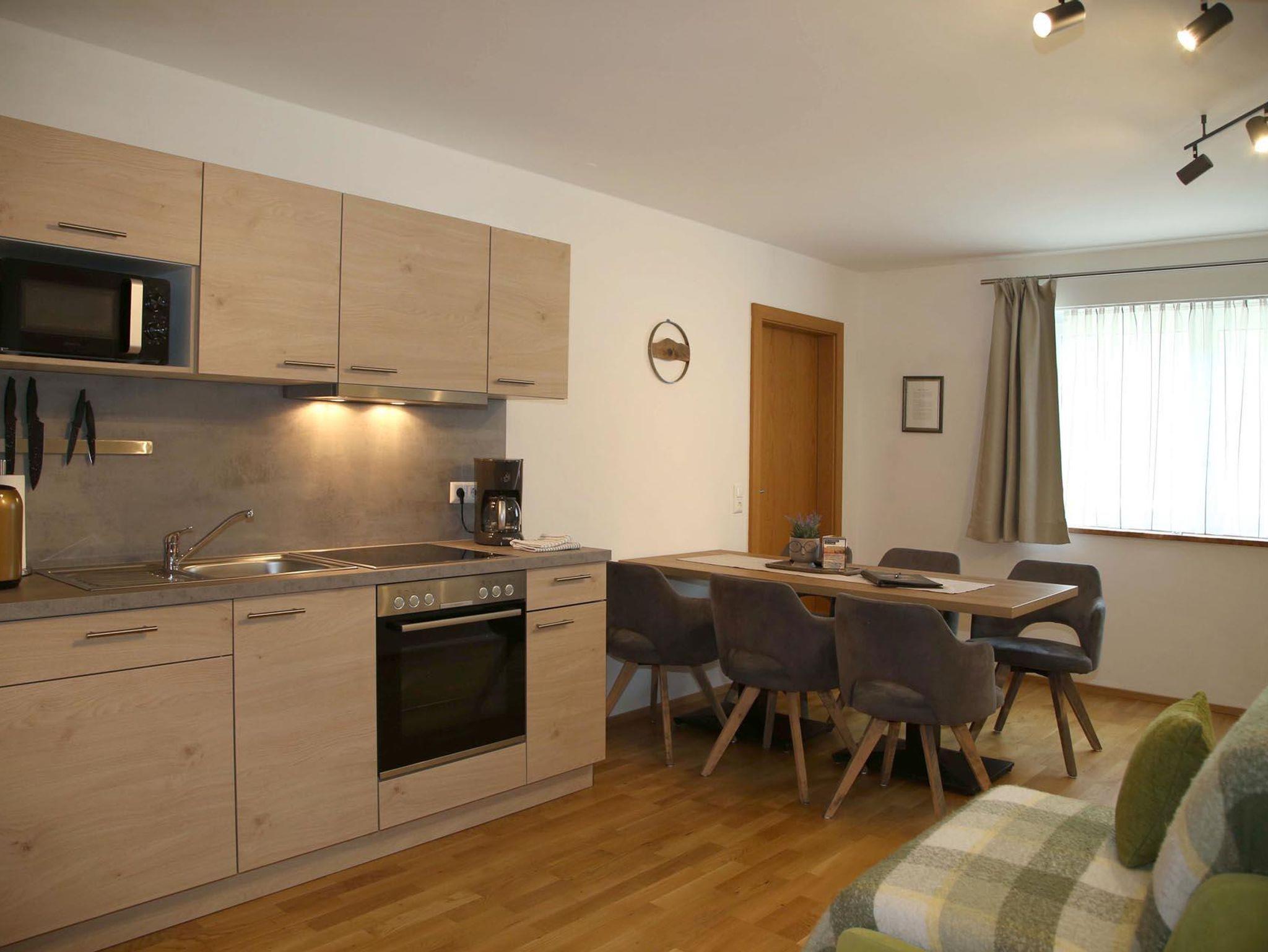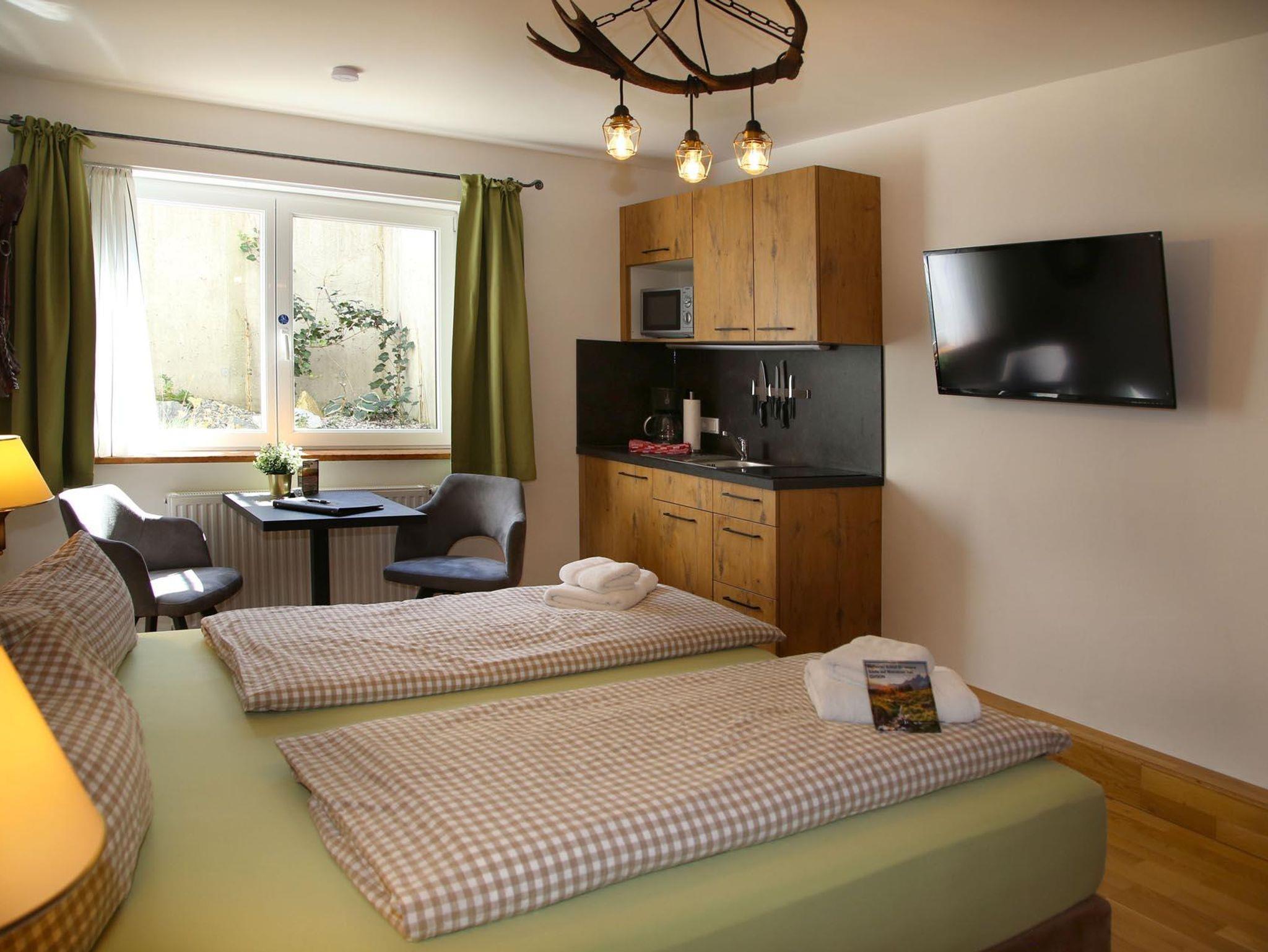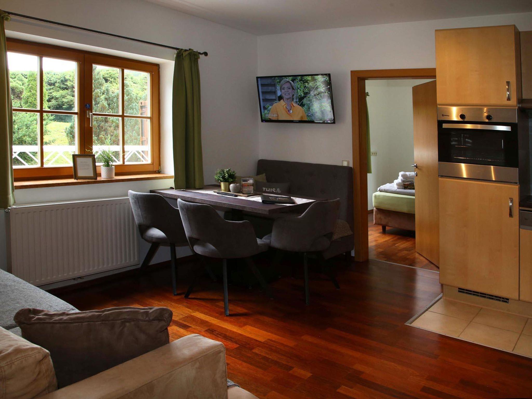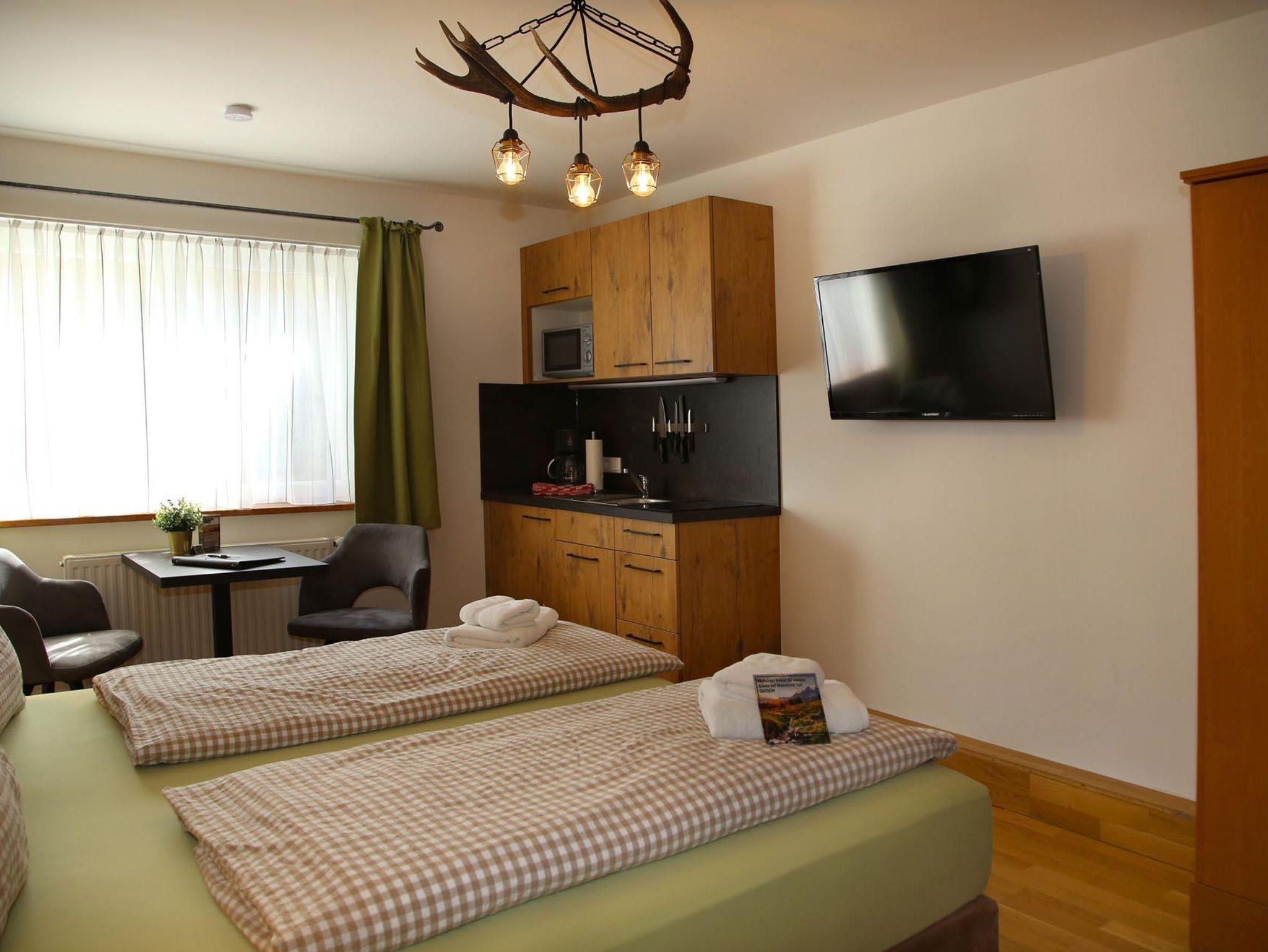 Im Untergeschoß befindet sich das Apartment Kraftplatz Almsee mit Platz für 5 Personen. Ein Schlafzimmer, Badezimmer und großzügige Wohnküche (ohne direkte Aussicht).