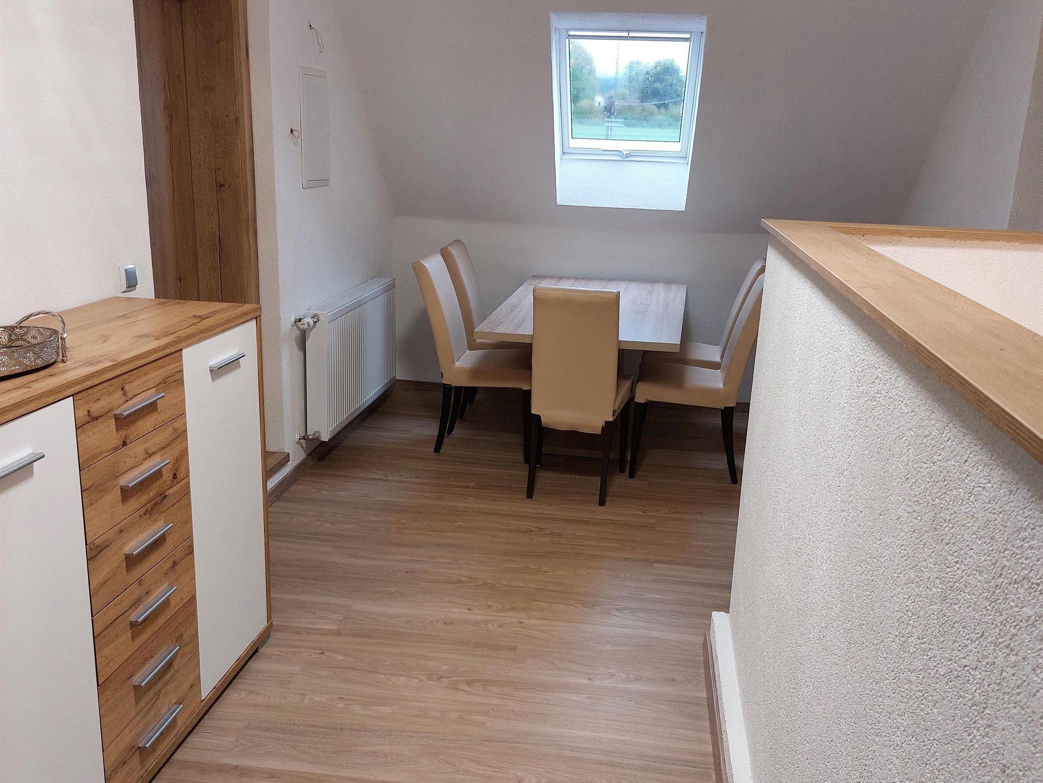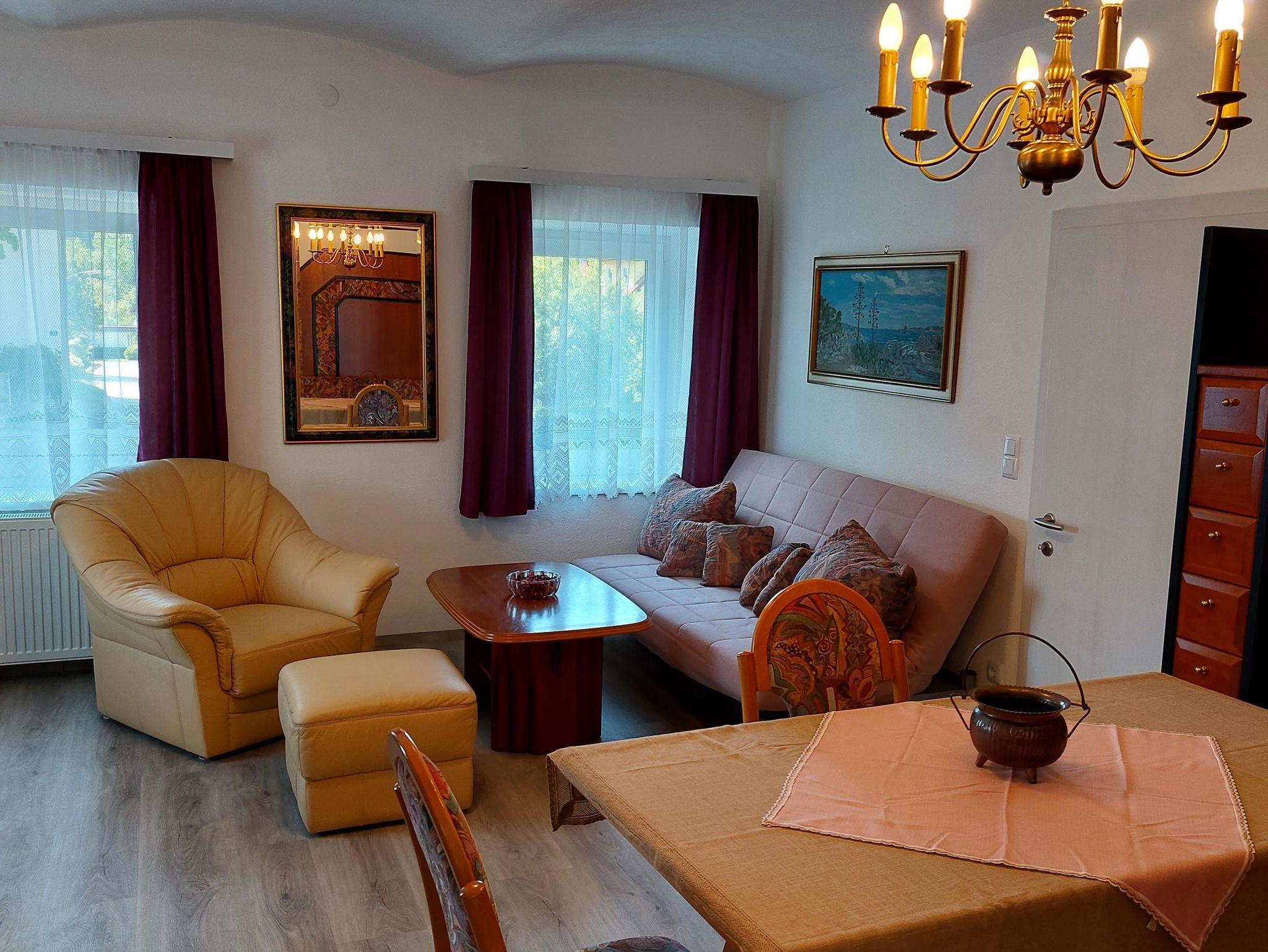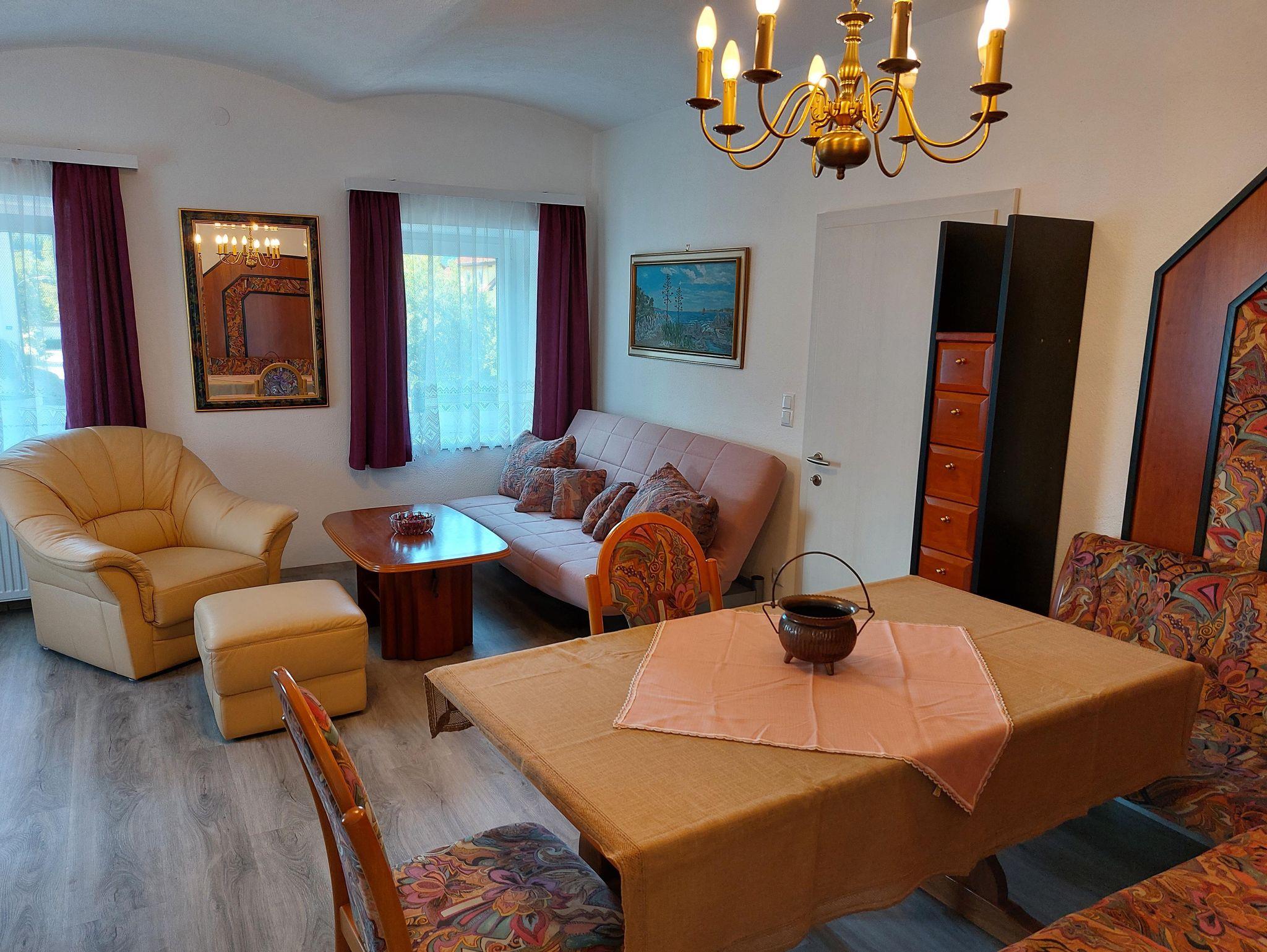 Die Ferienwohnung 1 mit 95 m² befindet sich im zweiten Stock mit separaten Zugang (Außenstiege) und hat einen kleinen Balkon mit Tisch und Sessel.