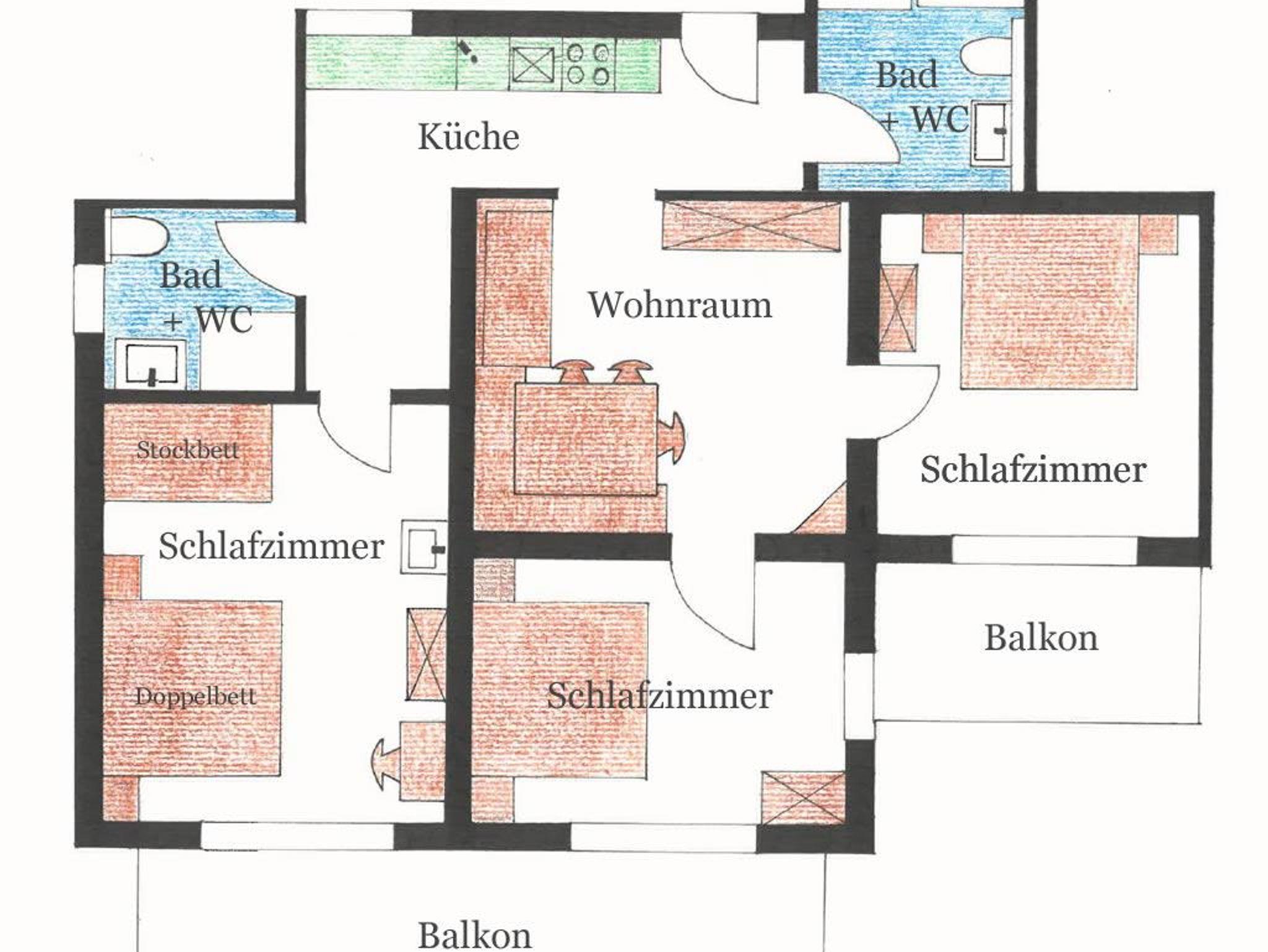 • 3 Schlafzimmer (2 Doppelzimmer, 1 Vierbettzimmer)