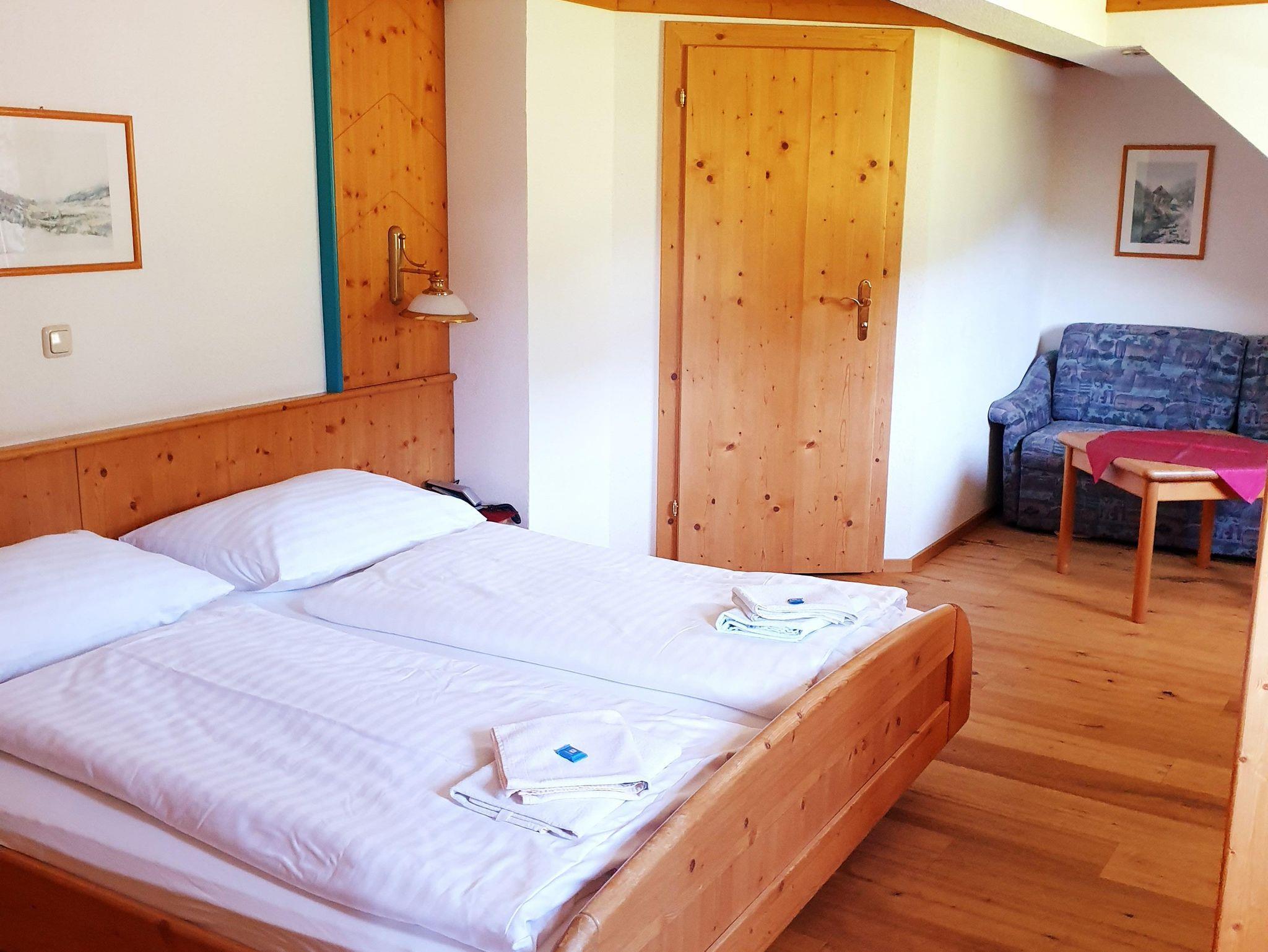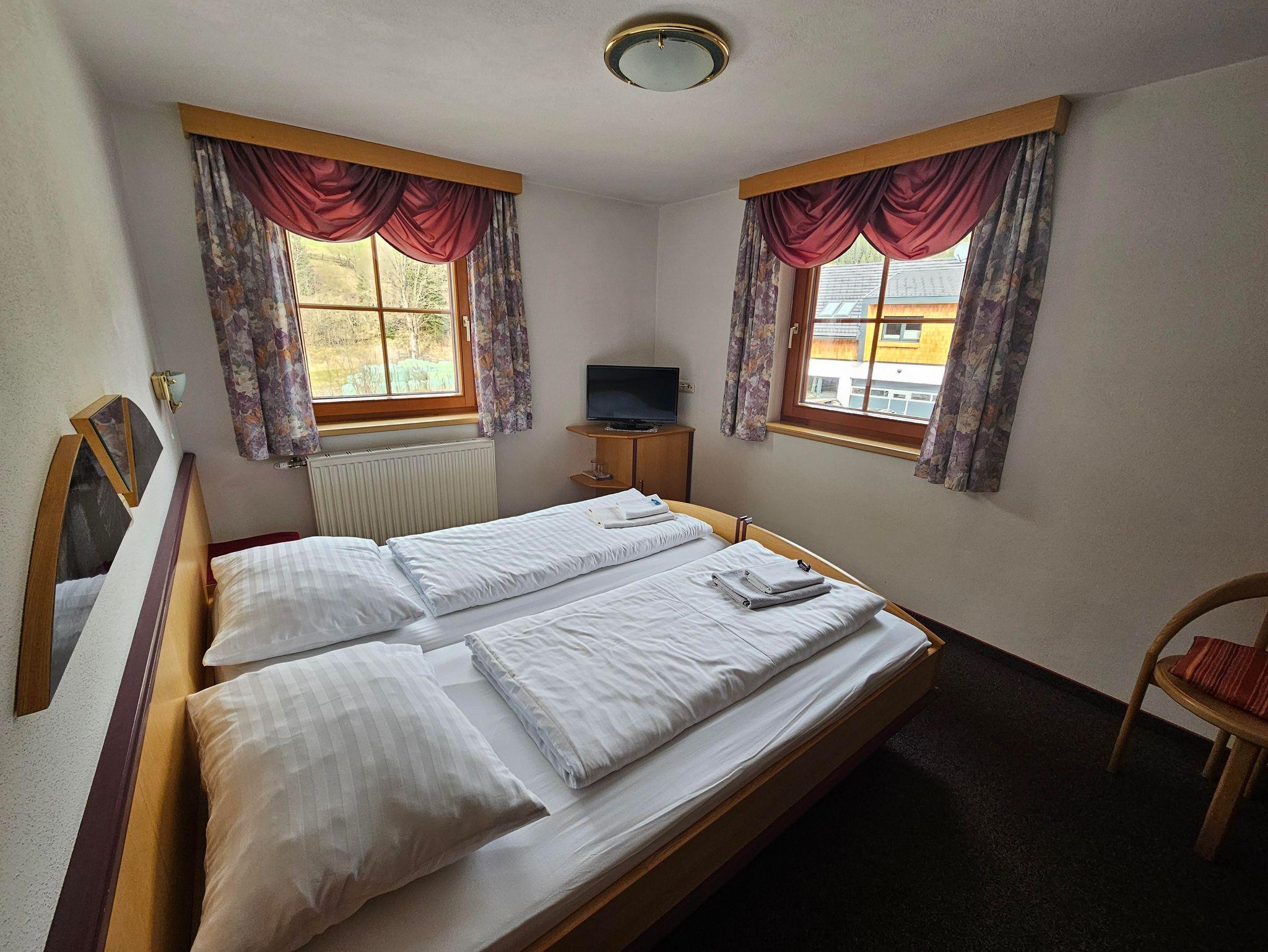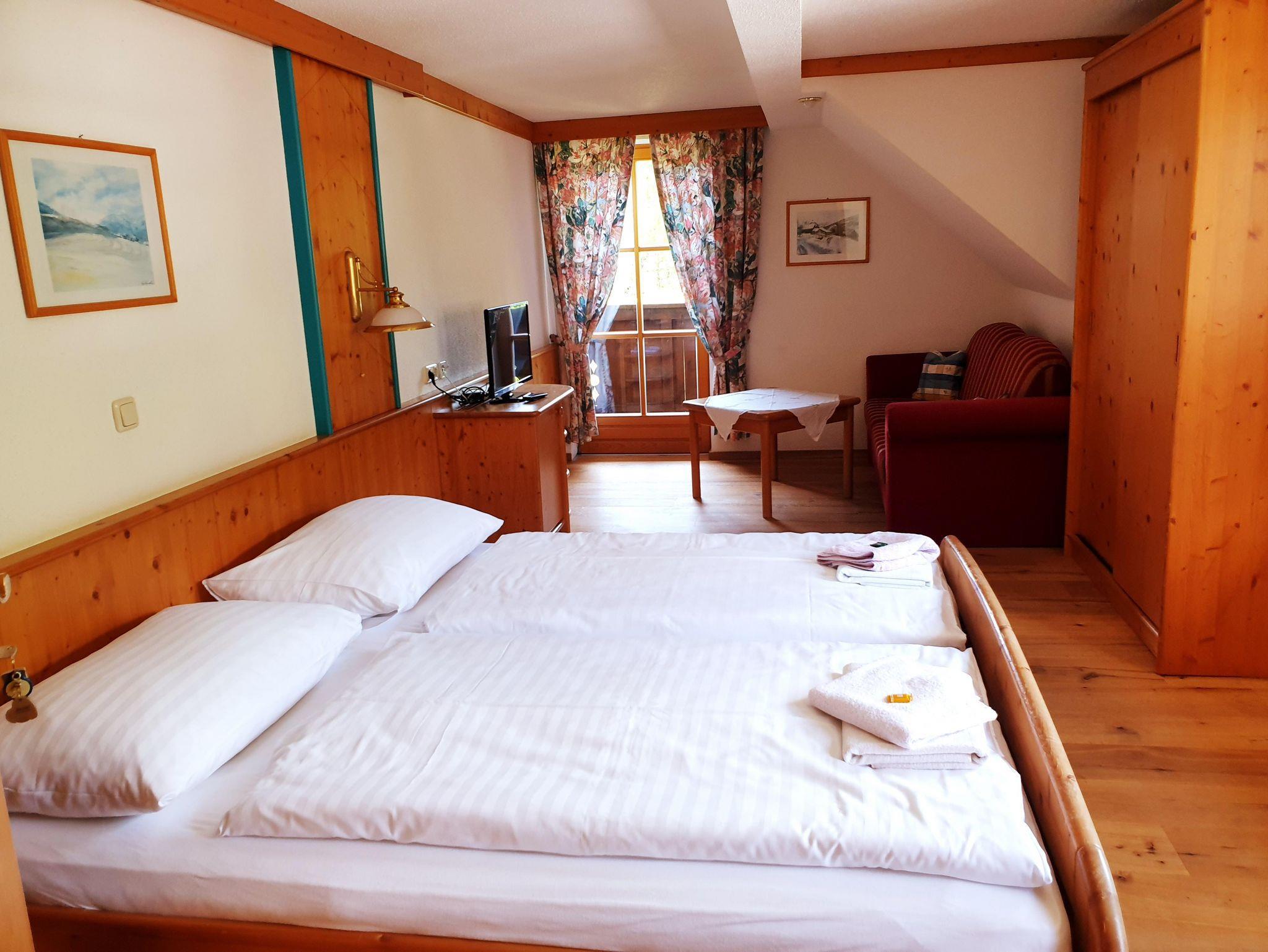 Komfortzimmer Sonnenblume (104/105) Komfortables ruhiges Doppelzimmer mit DU/WC, Flatscreen-Sat-TV, Kühlschrank, Telefon, gratis W-Lan im Zimmer, Haartrockner und Hotelsafe, Blick in das westliche Göriachtal. Auf Wunsch Halbpension mit Menüwahl.