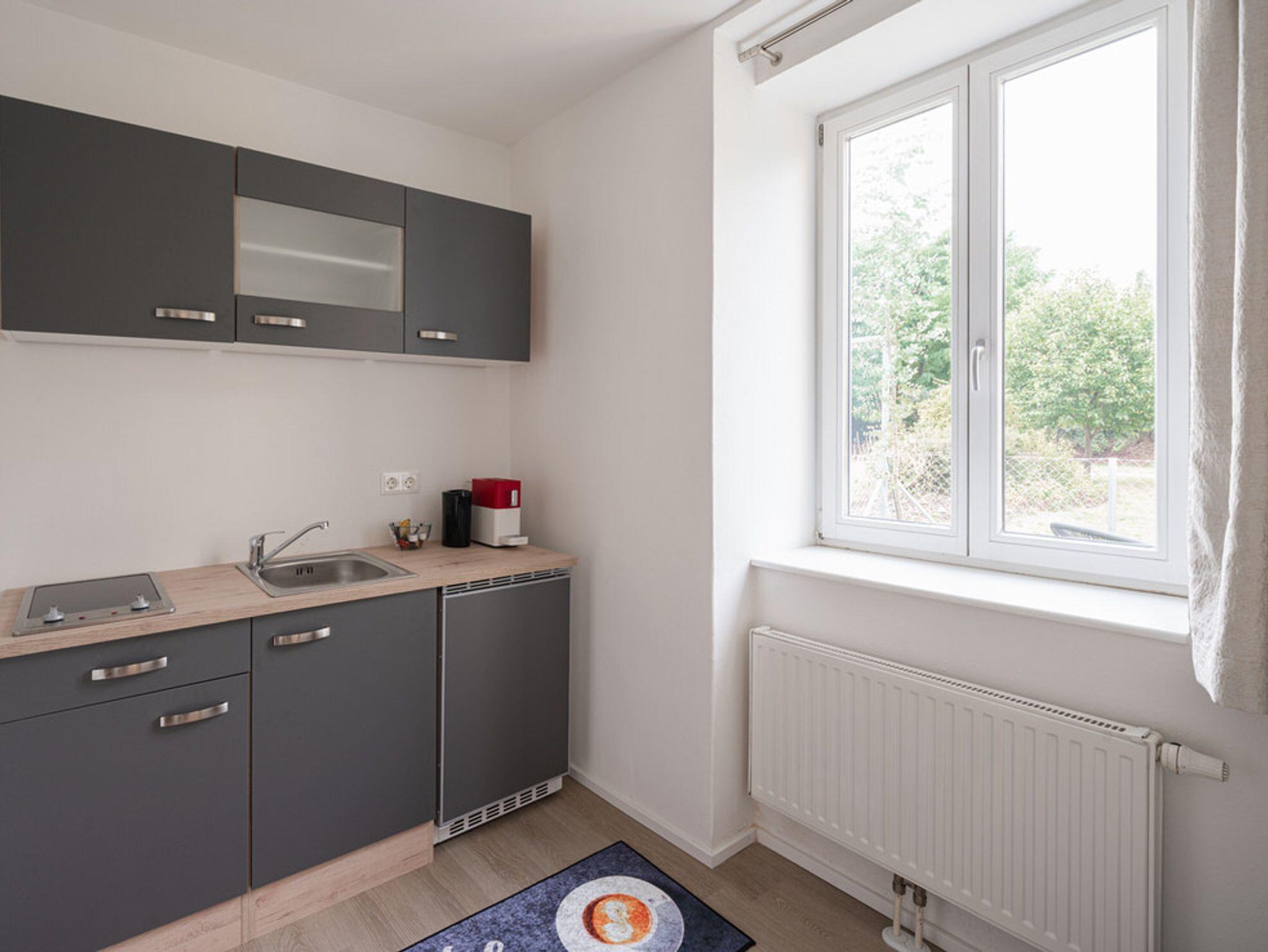 Das Wohn- Schlafzimmer mit modernem Polsterbett und gemütlicher Wohnsitzlounge bietet Ihnen ein angenehmes Urlaubsgefühl. Die Küchenzeile beinhaltet eine Grundausstattung an allen Annehmlichkeiten und auch das Badezimmer mit Dusche und WC großzügig Platz.