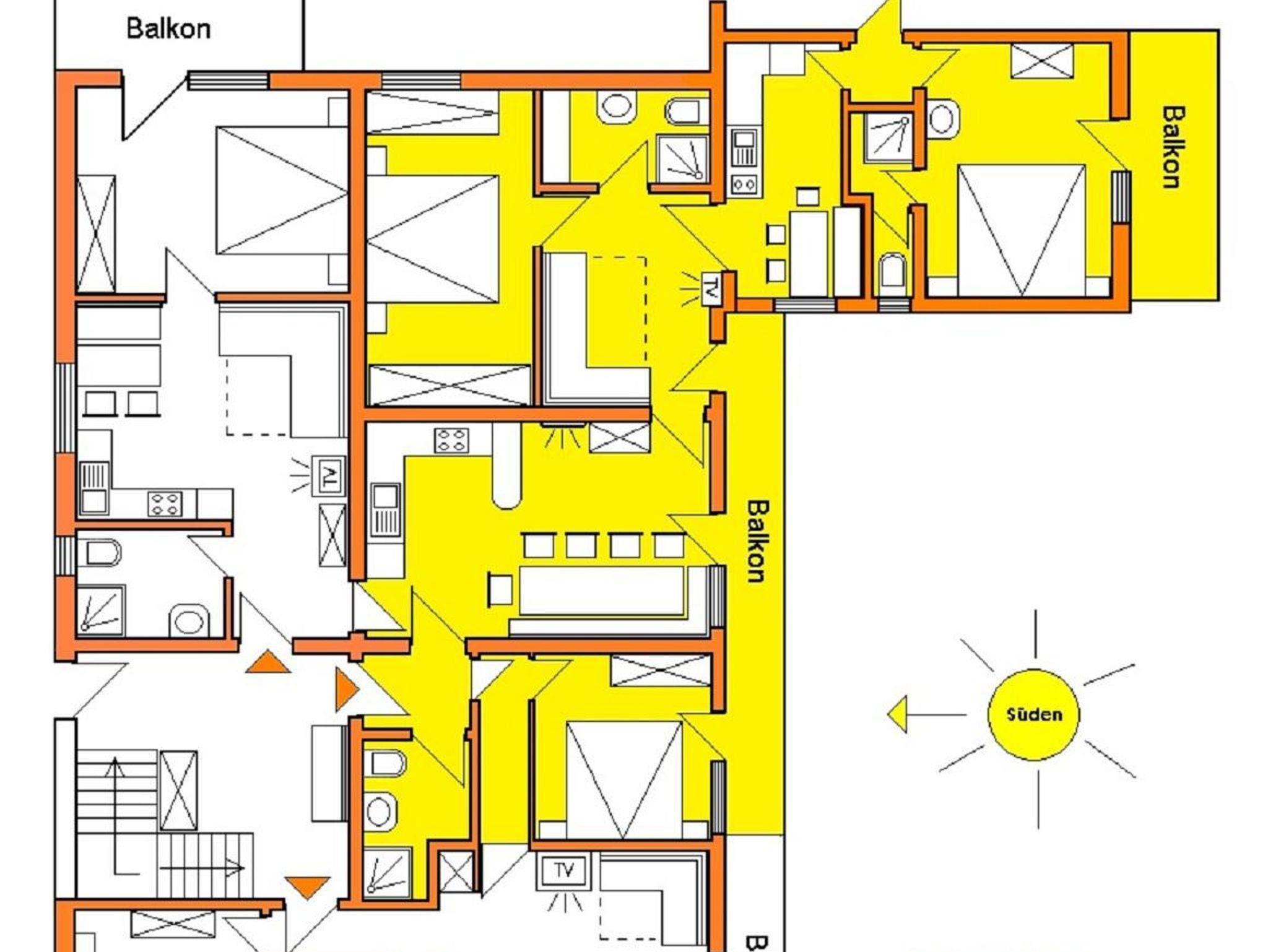 (106m2) 3 Schlafzimmer (1DZ + 2DBZ) , 1 Wohnschlafraum (2 Betten), Kaffeemaschine, Mikro, Kühl-Gefrierschrank, Elektroherd mit 4 Platten (Ceran), Backofen, Geschirrspüler, Toaster, Mixer, Wasserkocher, KABEL-TV, WIFI-EMPFANG, 3 Dusche/WC, 1Wohnküche, 1 Küche und Wohnzimmer, 2 Süd-Balkone