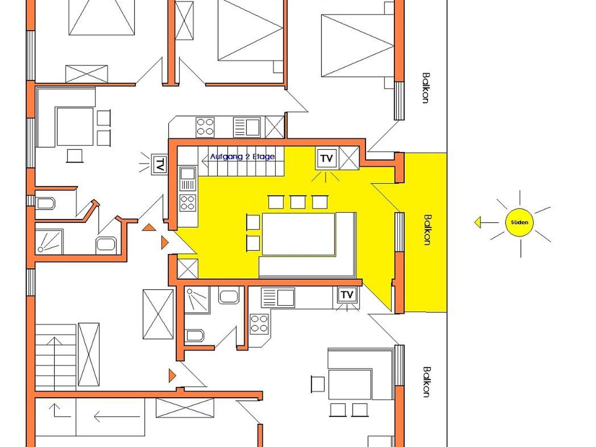 (70m²) 2 Schlafzimmer ( 2 DBZ) 1 Wohnküche, Wohnung über 2 Etagen, Elektroherd mit 4 Platten (Ceran), Backofen, Mikro, Geschirrspüler, Kühl/Gefrierschrank, Kaffeemaschine, Toaster, Mixer, Wasserkocher, KABEL-TV, WIFI-EMPFANG, 1 Dusche/WC, Küche, Süd-Balkon