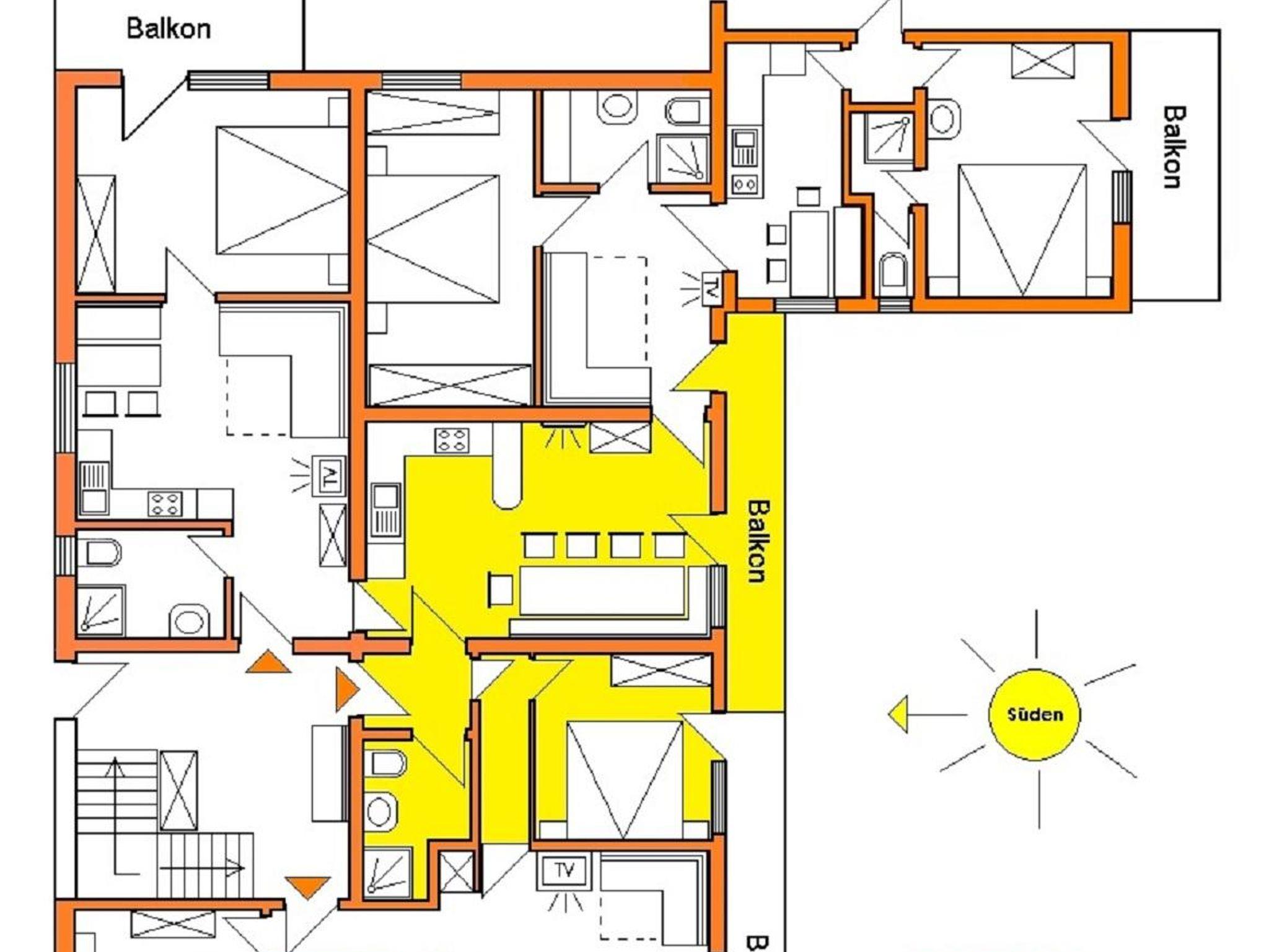 (50m²) 1 Schlafzimmer (DZ) / 1 Wohnschlafraum (2 Betten), Elektroherd mit 4 Platten (Ceran), Backofen, Mikro, Geschirrspüler, Kühl/Gefrierschrank, Kaffeemaschine, Toaster, Mixer, Wasserkocher, KABEL-TV, WIFI-EMPFANG, 1 Dusche / WC, Wohnküche, Süd-Balkon