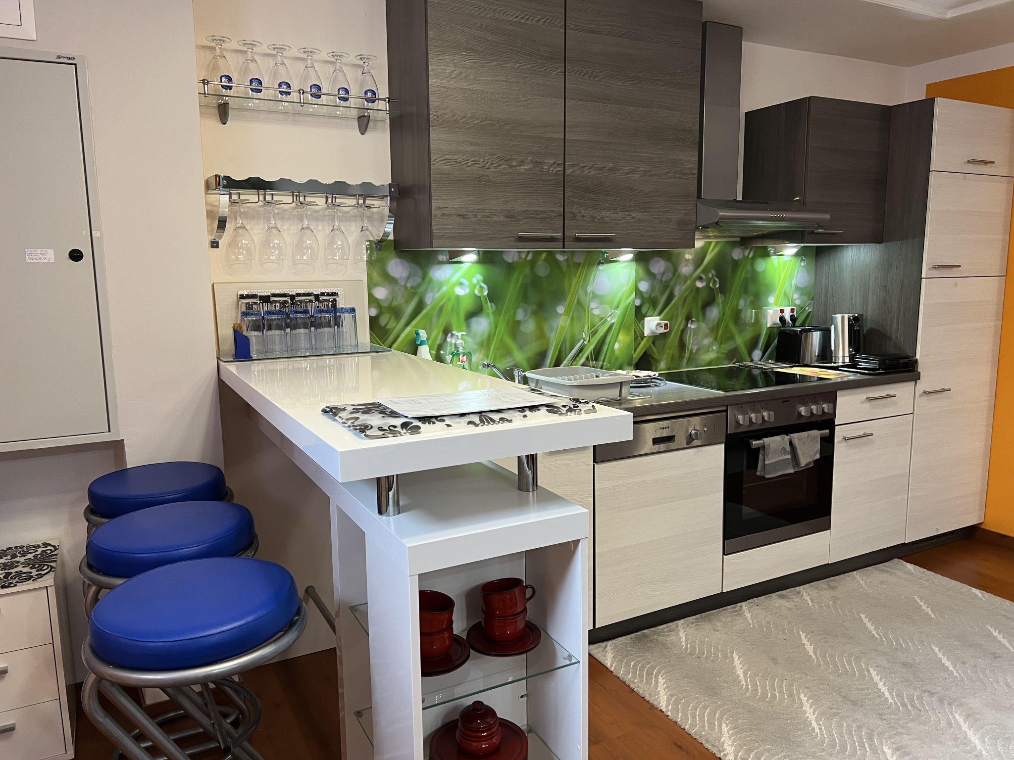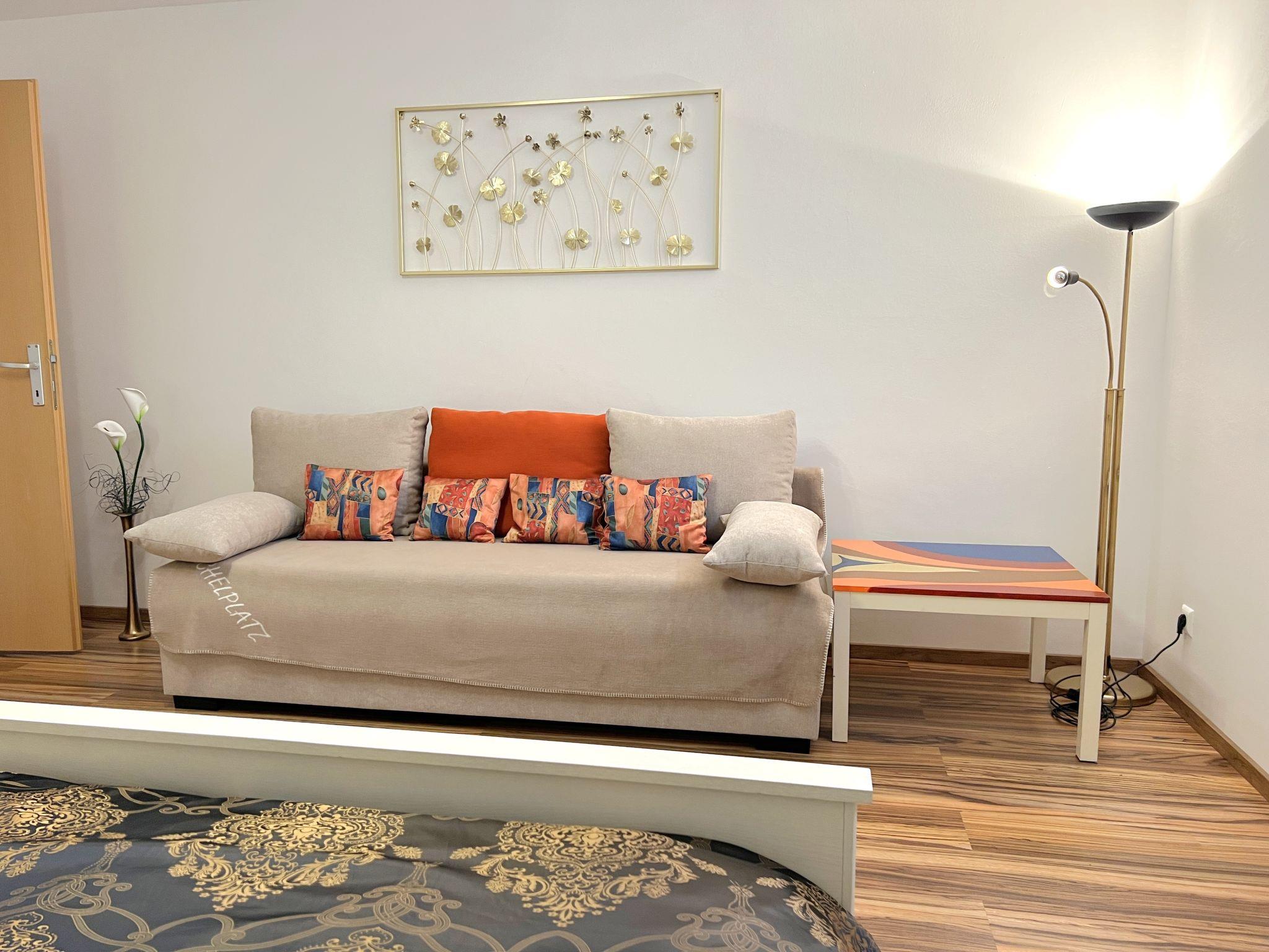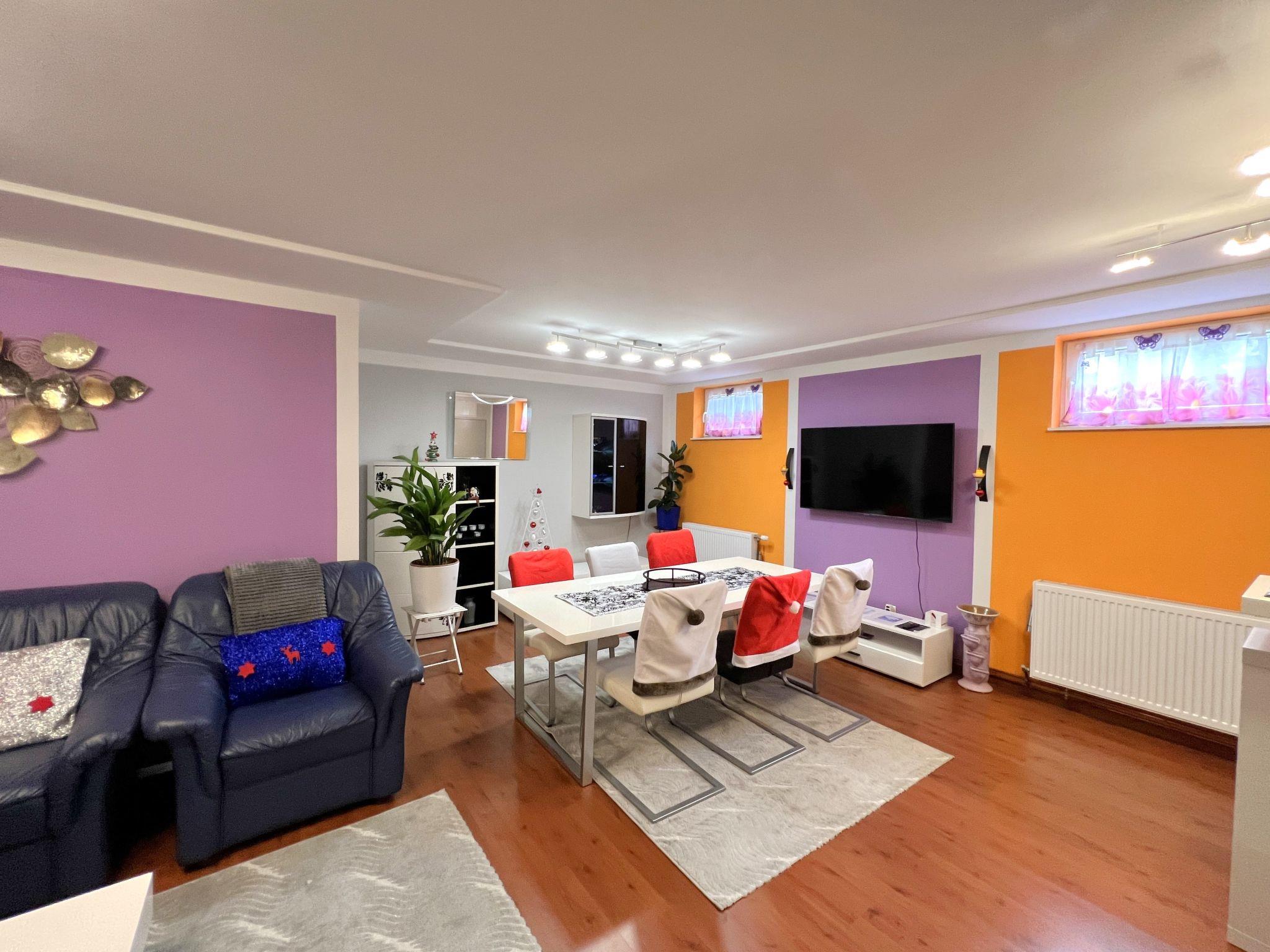 3-room apartment 100 m2, on the lower ground floor. Comfortable and modern furnishings: entrance hall. Large living/dining room with 1 sleeping facility, dining table, international TV channels and flat screen. 1 large double bedroom with 1 double bed and 1 sleeping facility. 1 small double bedroom with 1 double bed and 1 pull-out bed (1 pers. length 180 cm), bath/shower. Open kitchen (4 hot plates, oven, dishwasher, toaster, kettle, microwave, freezer, electric coffee machine). Sep. WC. Heating. Facilities: washing machine, dryer (extra). Internet (WiFi, free). Please note: suitable for families. Non-smokers only. Smoke alarm.