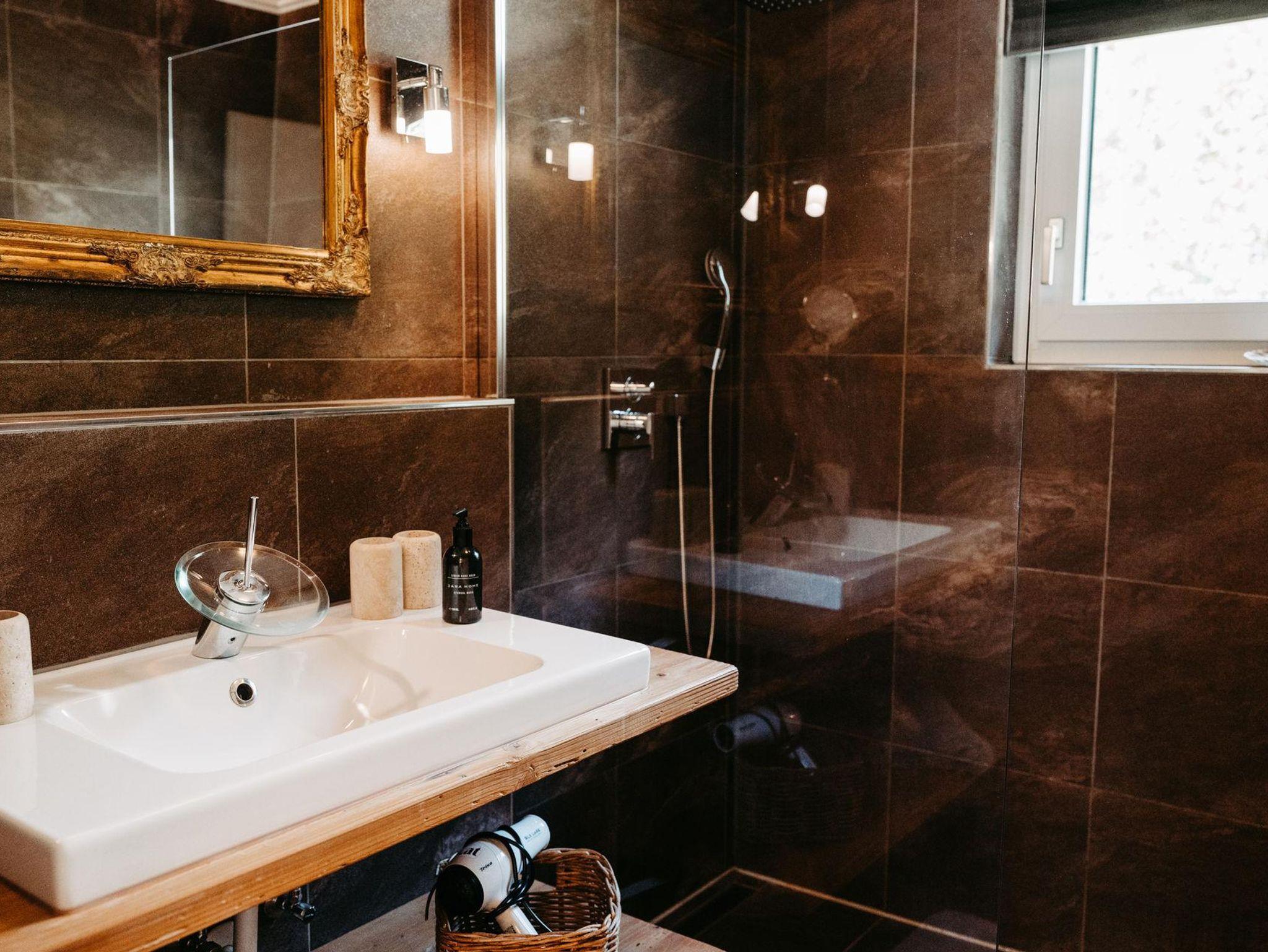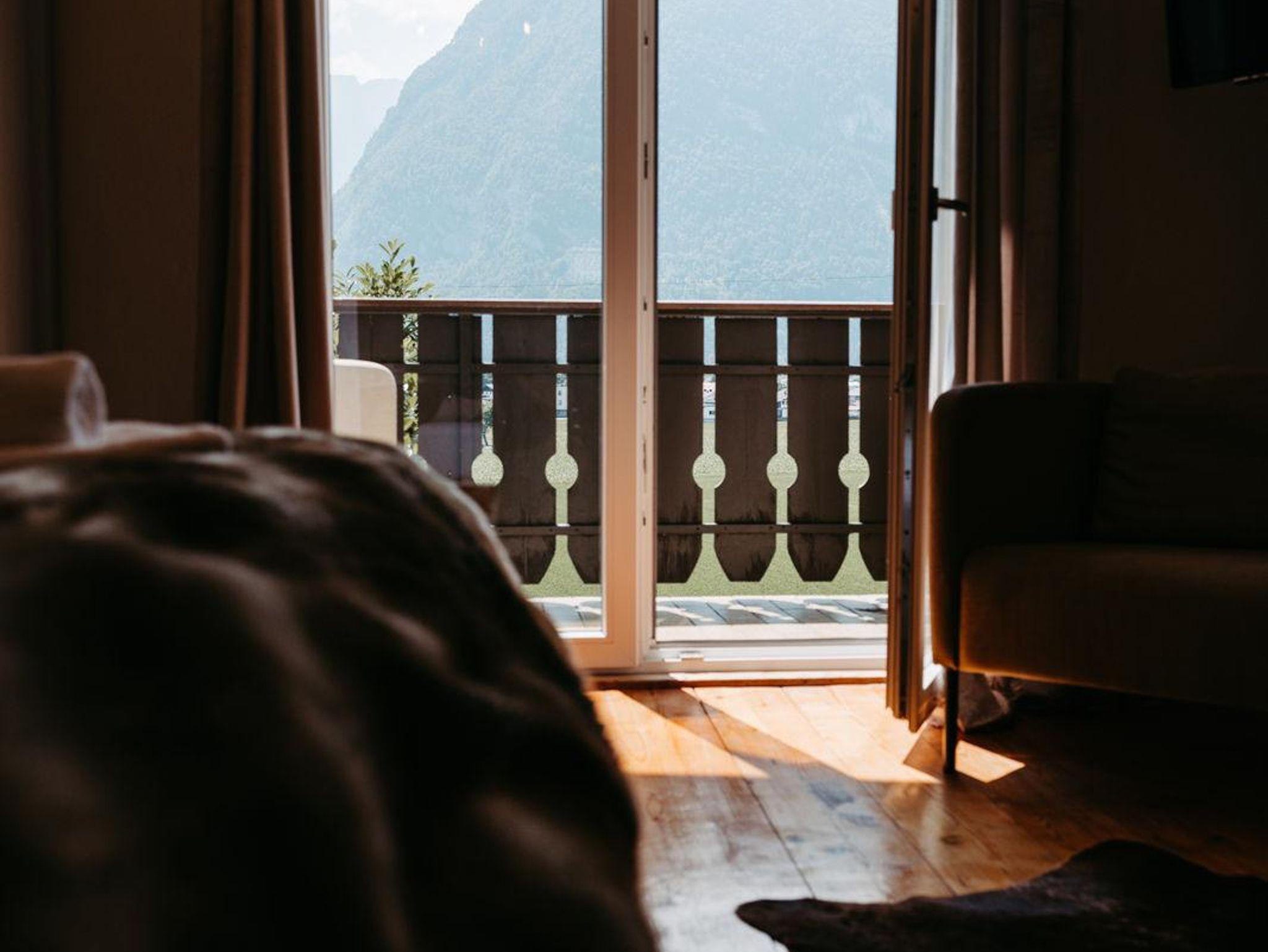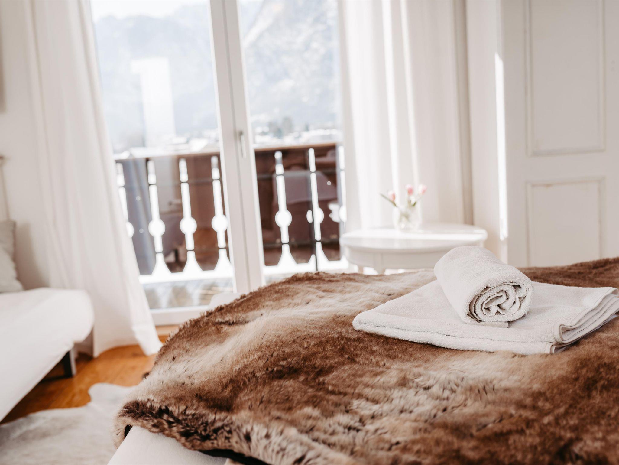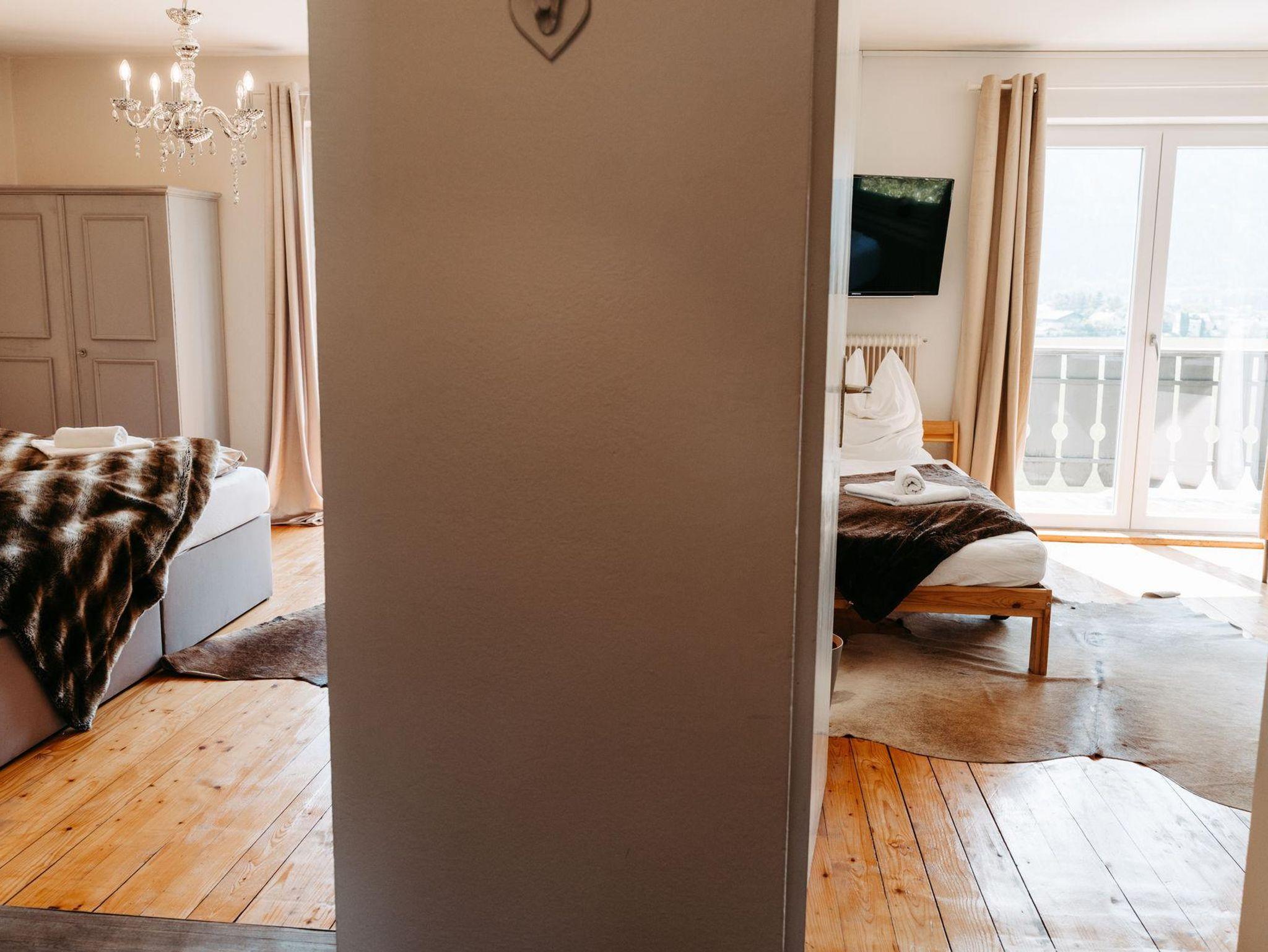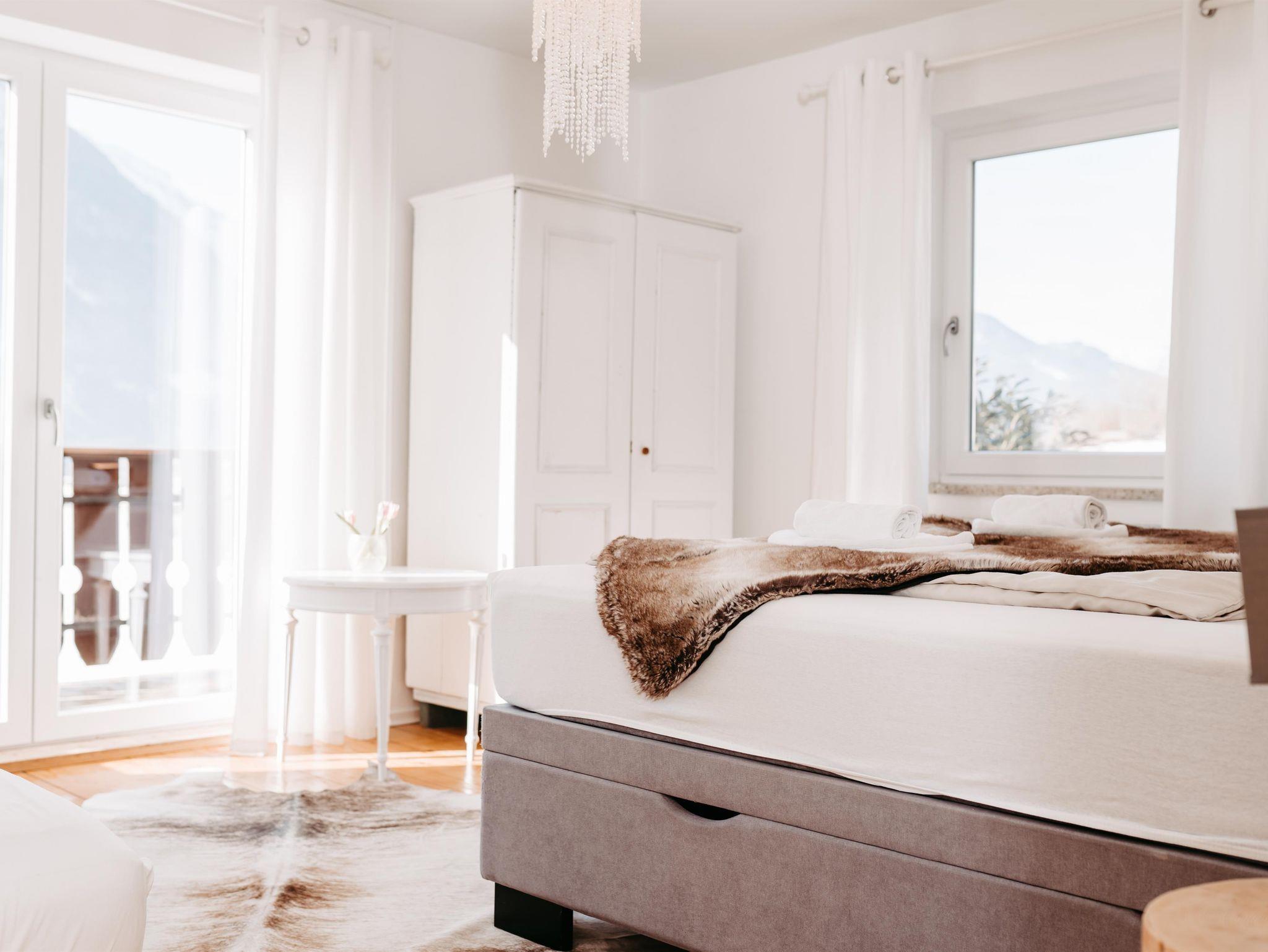 Über eine Treppe erreichen Sie das Obergeschoß. Die drei stilvoll eingerichteten und mit Flat TV ausgestatteten Schlafzimmer verfügen über direkte Zugänge zu den Balkonen – zwei von ihnen verzaubern mit einem einzigartigen Bergblick. Um Engpässe am Morgen und Abend zu vermeiden, befindet sich im Obergeschoß ein weiteres Badezimmer mit Regendusche und einem separaten WC.