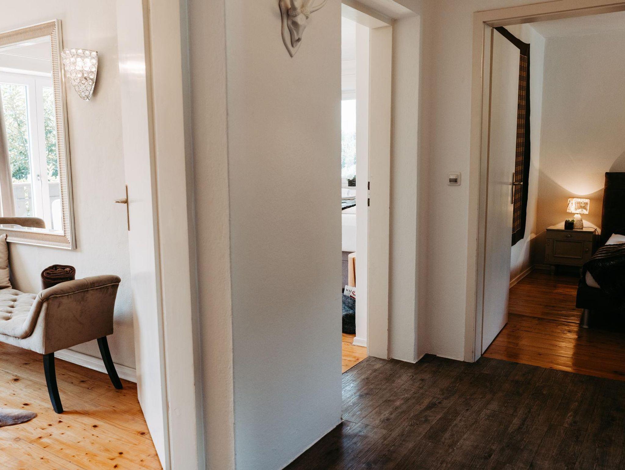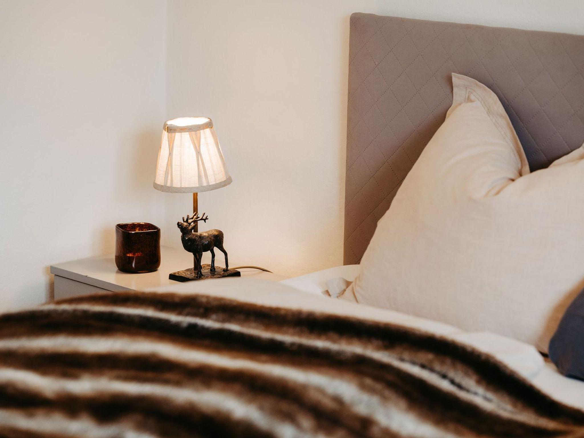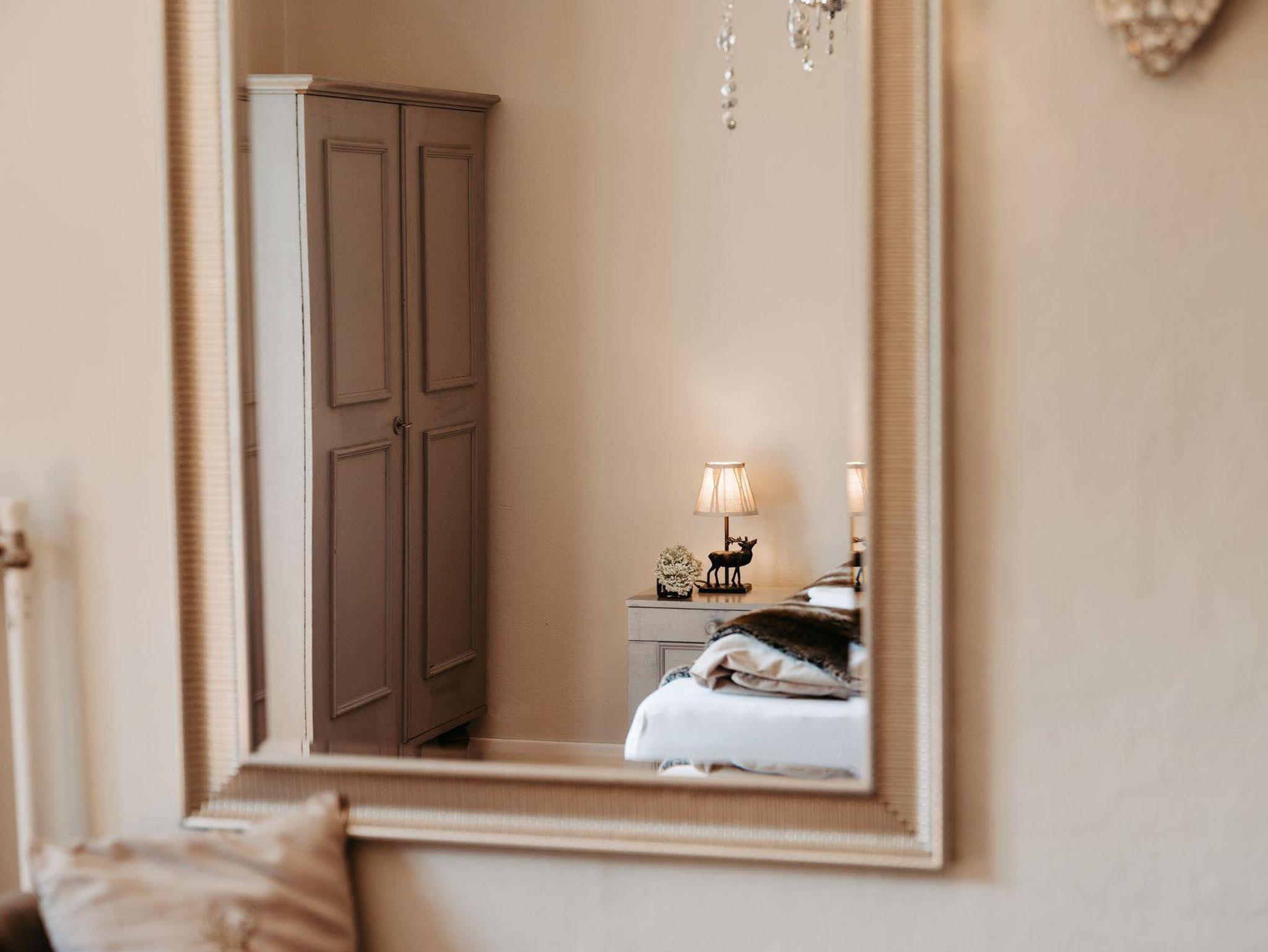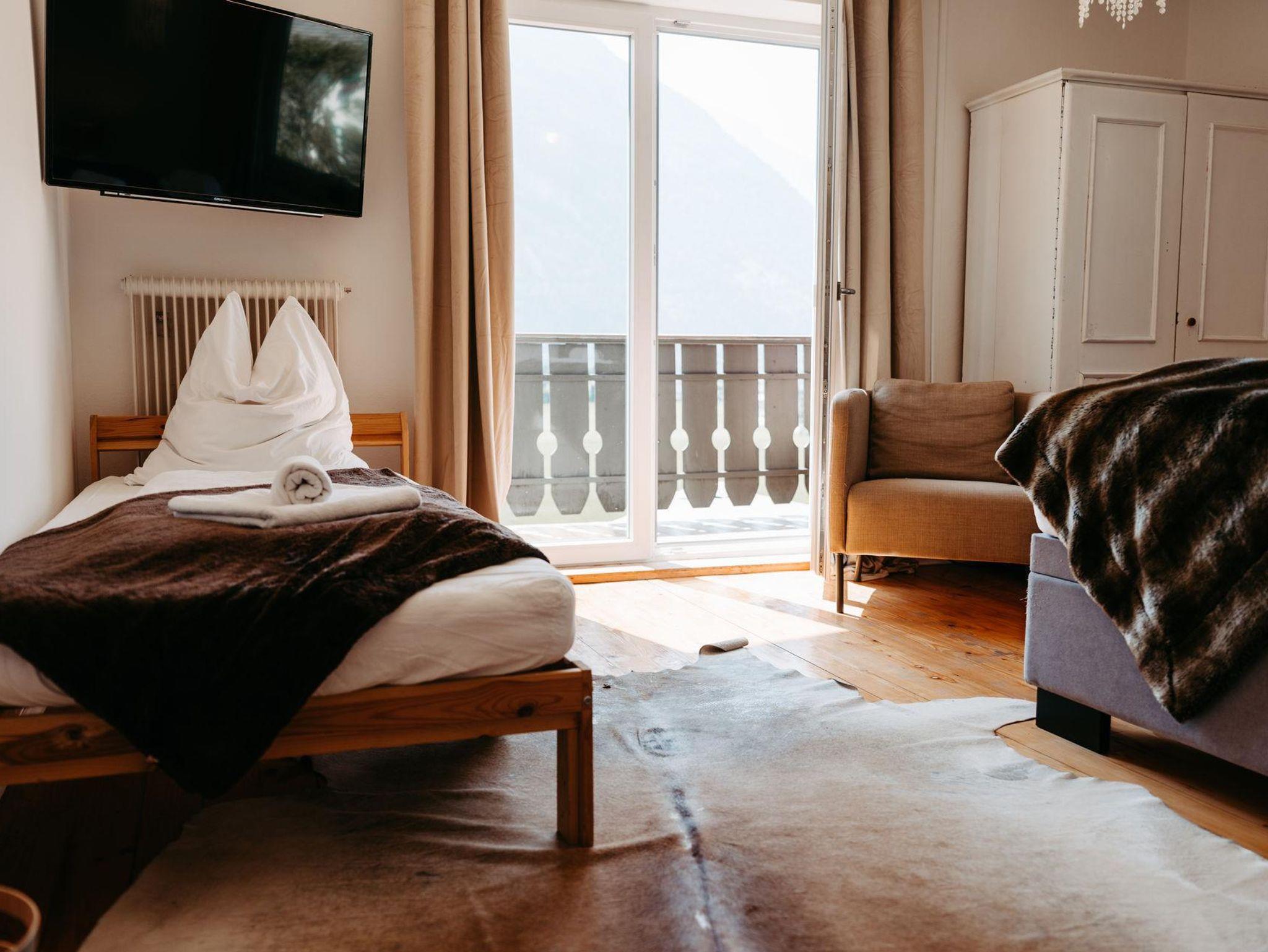Über eine Treppe erreichen Sie das Obergeschoß. Die drei stilvoll eingerichteten und mit Flat TV ausgestatteten Schlafzimmer verfügen über direkte Zugänge zu den Balkonen – zwei von ihnen verzaubern mit einem einzigartigen Bergblick. Um Engpässe am Morgen und Abend zu vermeiden, befindet sich im Obergeschoß ein weiteres Badezimmer mit Regendusche und einem separaten WC.