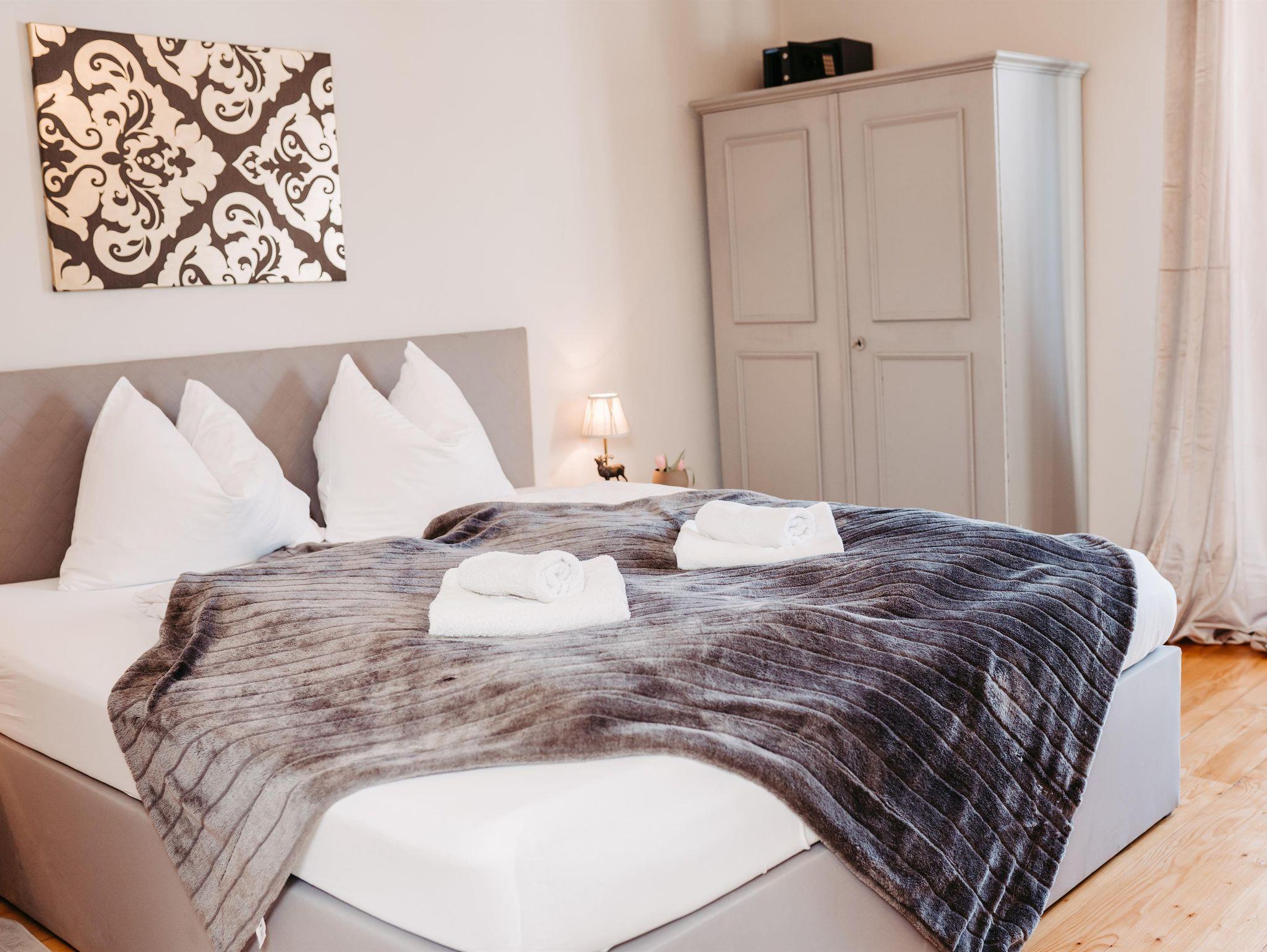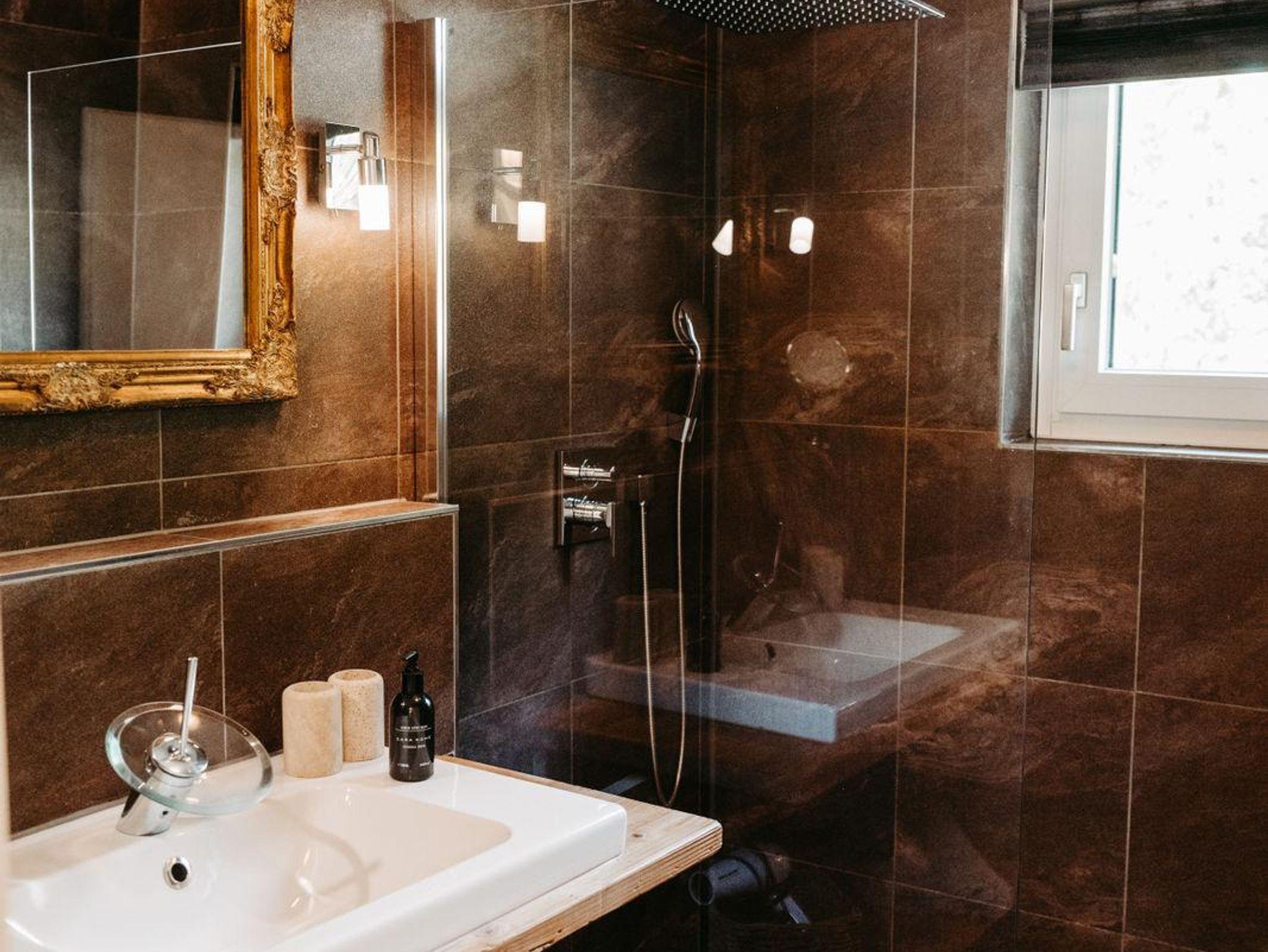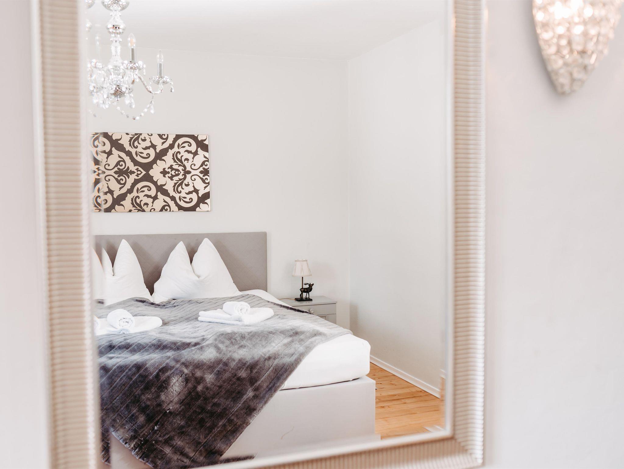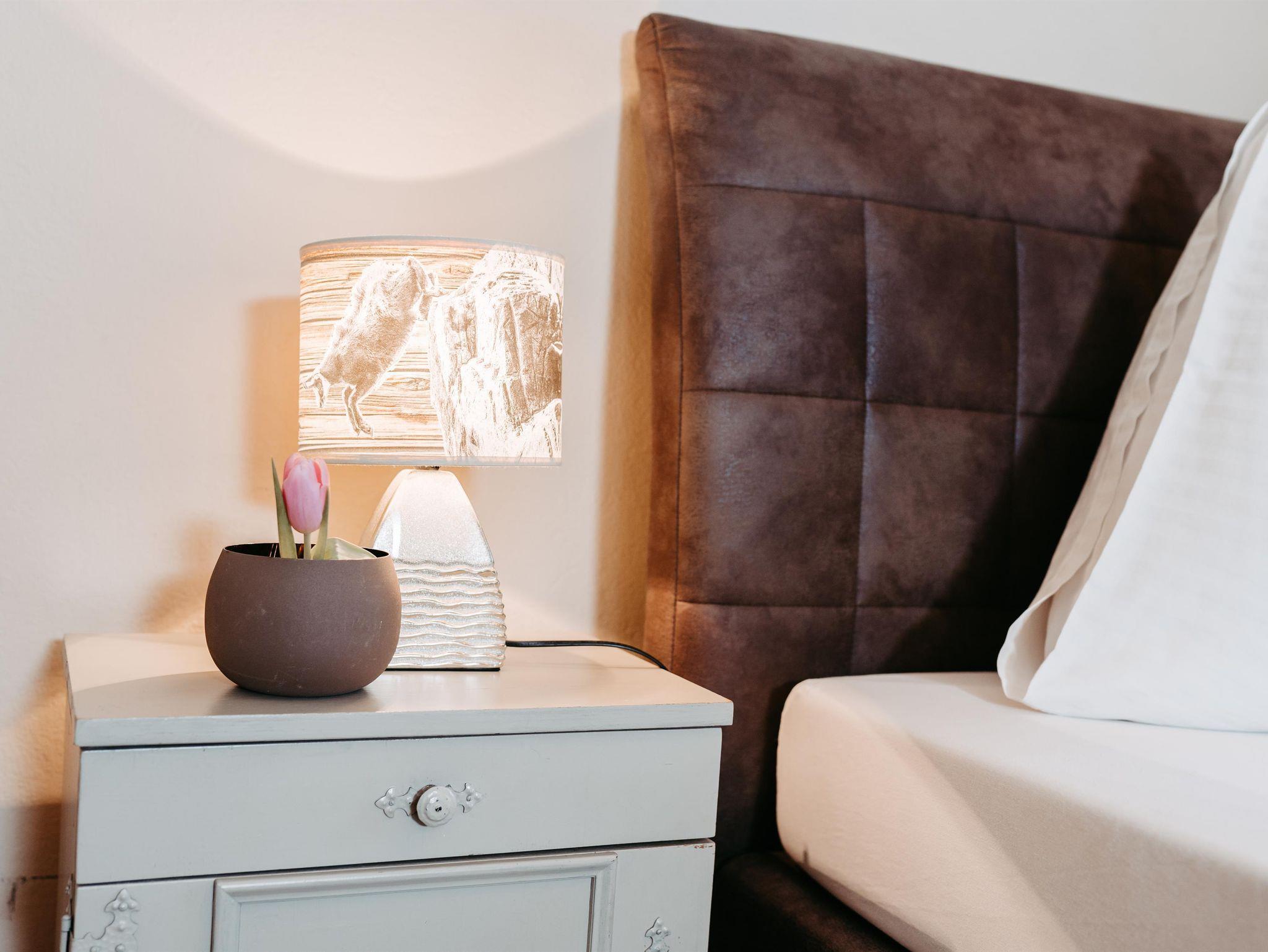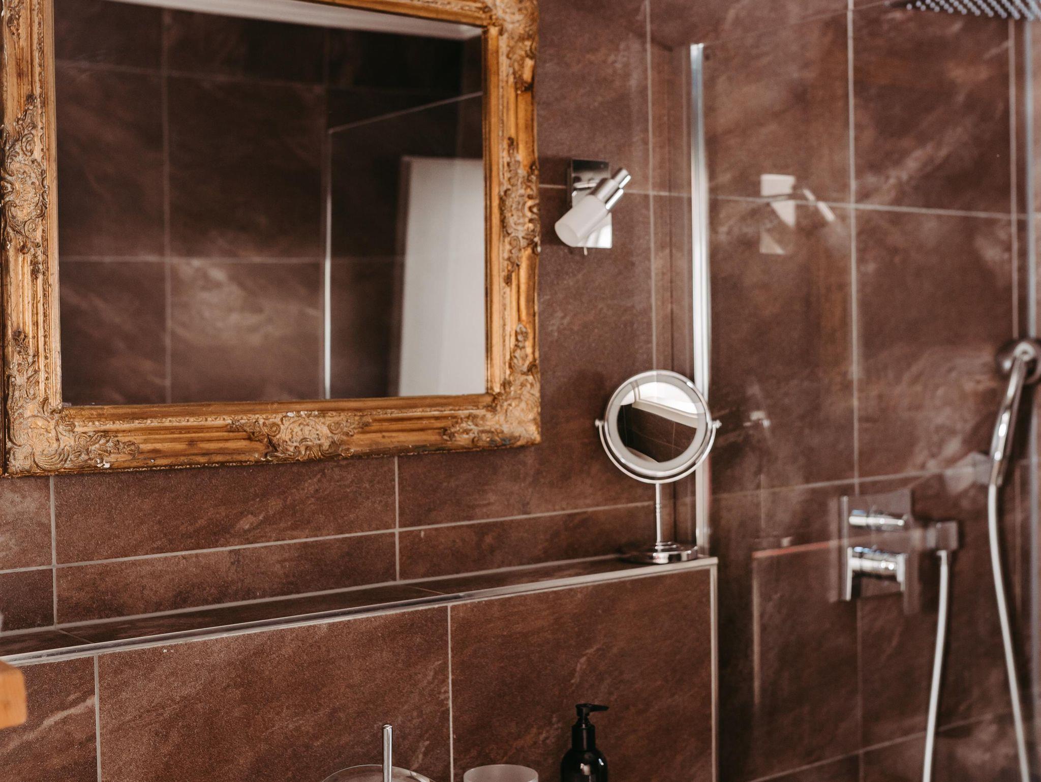 Über eine Treppe erreichen Sie das Obergeschoß. Die drei stilvoll eingerichteten und mit Flat TV ausgestatteten Schlafzimmer verfügen über direkte Zugänge zu den Balkonen – zwei von ihnen verzaubern mit einem einzigartigen Bergblick. Um Engpässe am Morgen und Abend zu vermeiden, befindet sich im Obergeschoß ein weiteres Badezimmer mit Regendusche und einem separaten WC.