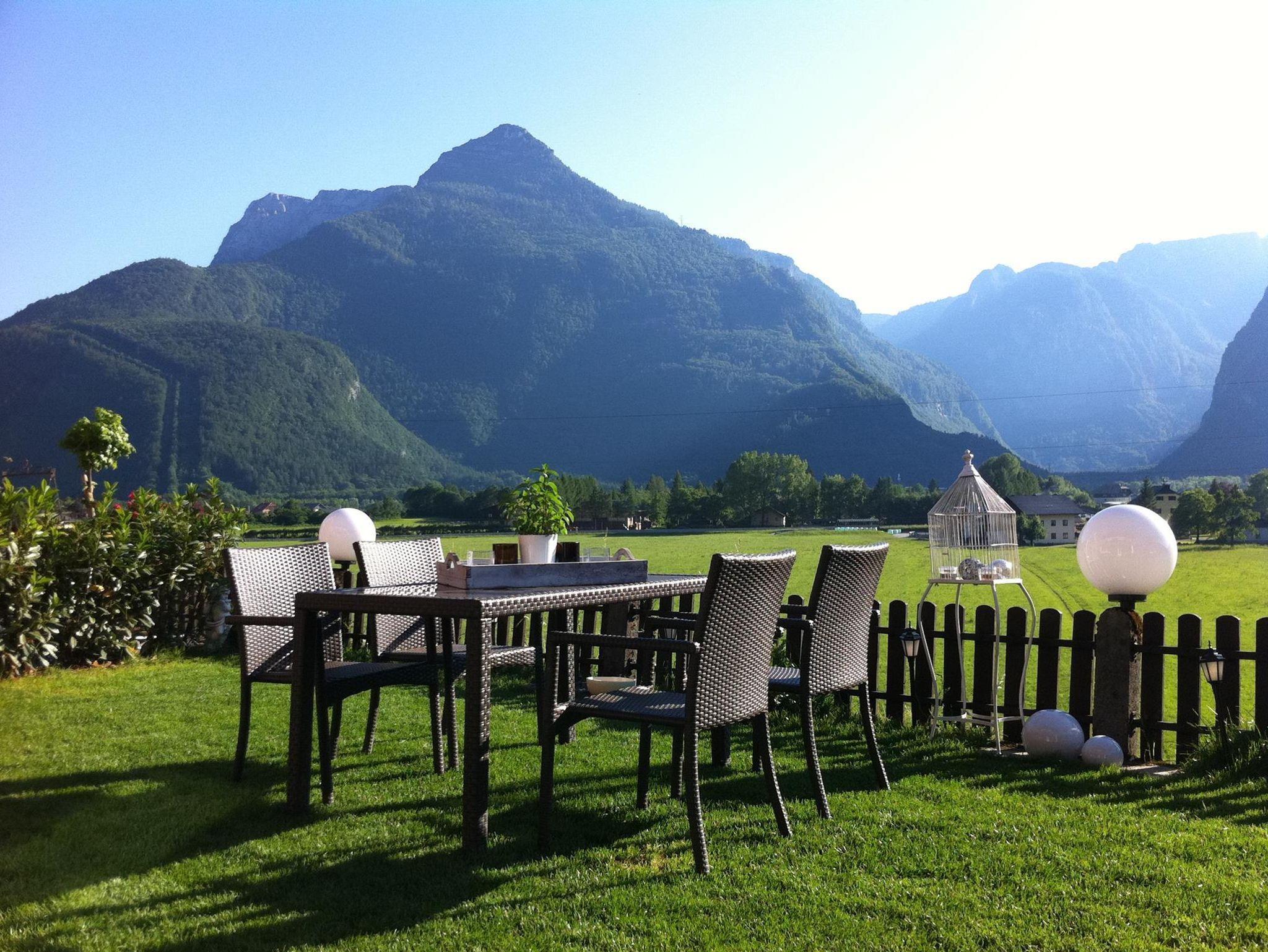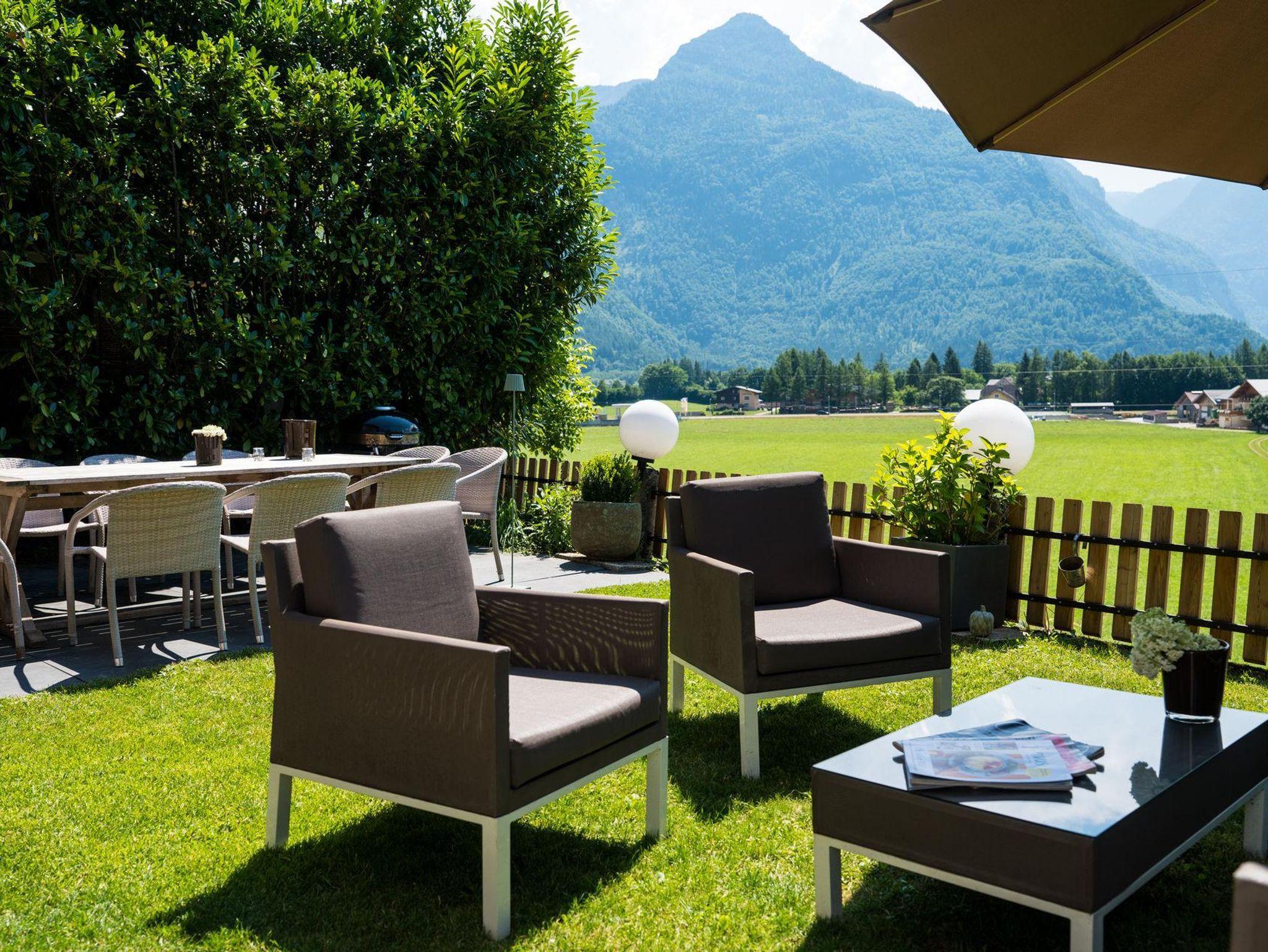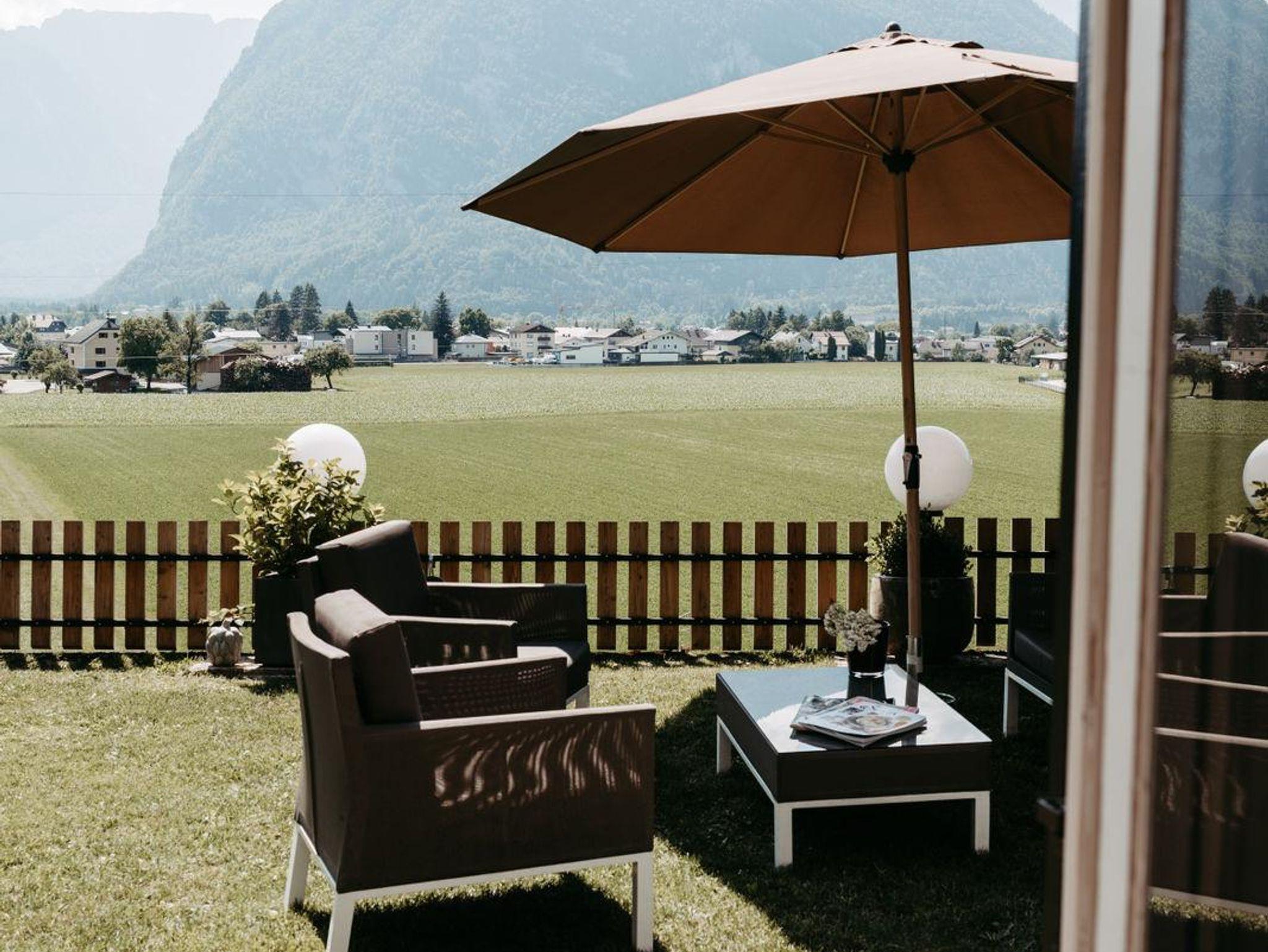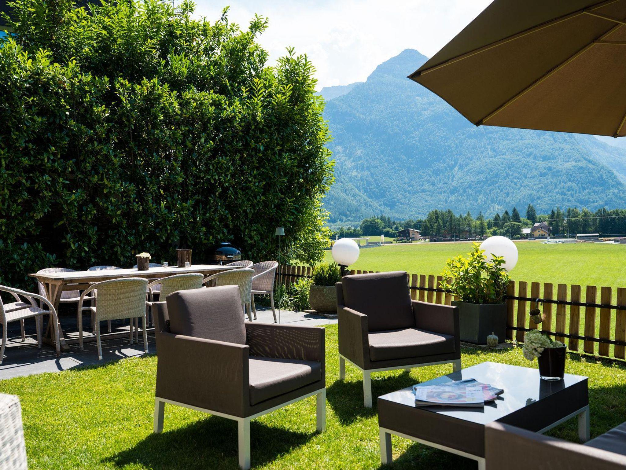 Der Garten und die Terrasse überzeugt mit einem einzigartigen Blick auf die Bergwelt des Göllmassivs, des Hagengebirges und des Tennengebirges. Ihnen vorgelagert sind die saftig grünen Wiesen des Salzachtales. Loungemöbel, ein großer Gartentisch mit Stühlen, Beschattungsmöglichkeiten oder ein Sonnenbett schaffen in dieser idyllischen Umgebung eine Oase, die nach einem erlebnisreichen Urlaubstag absolute Erholung bietet.