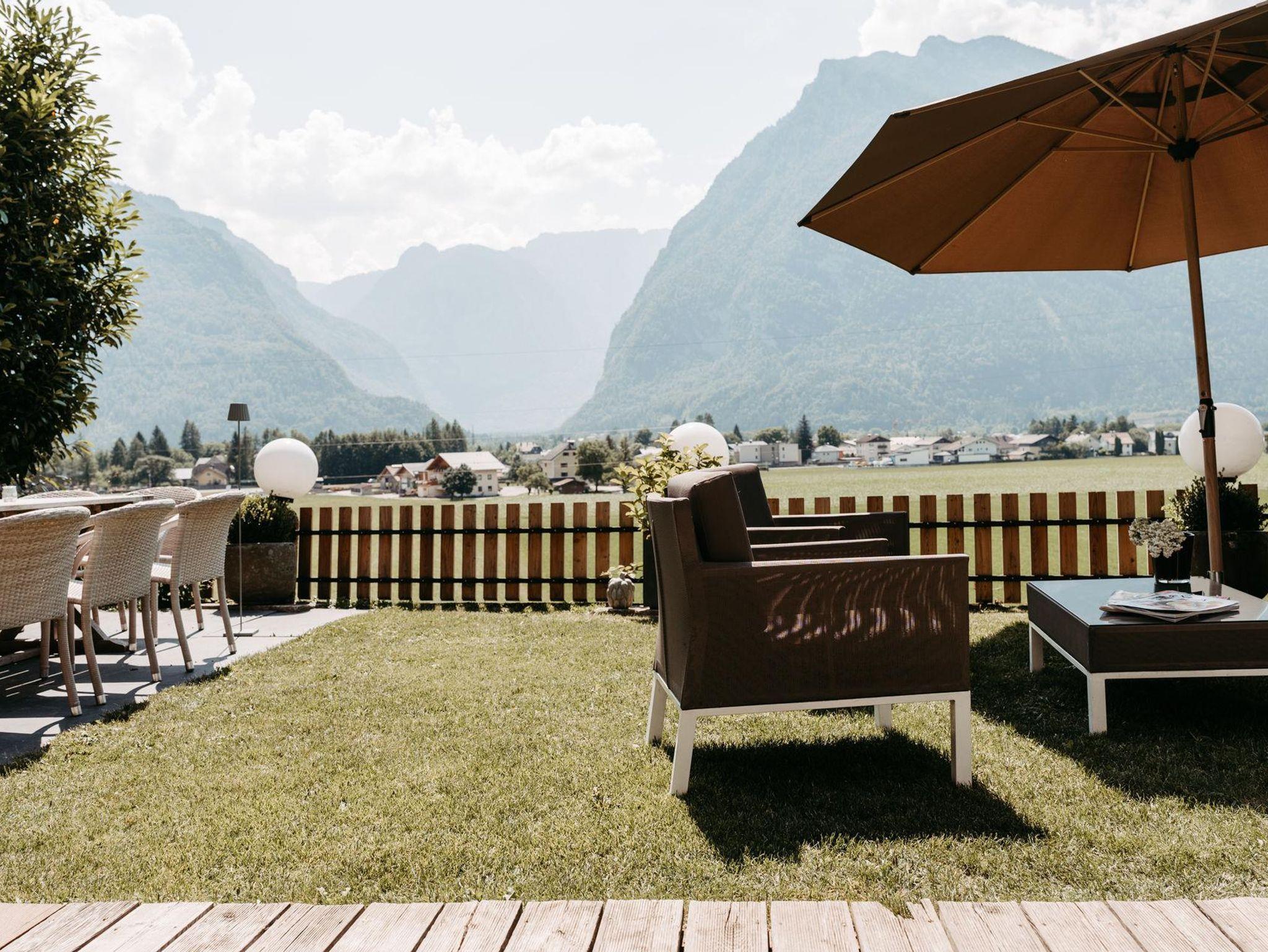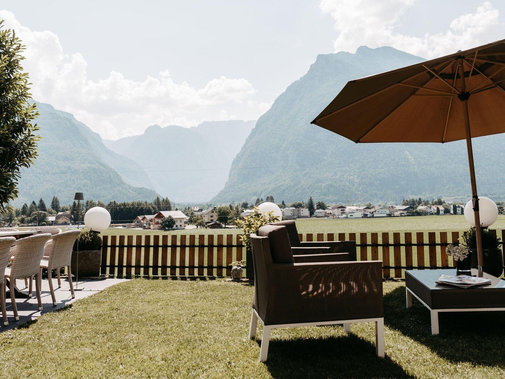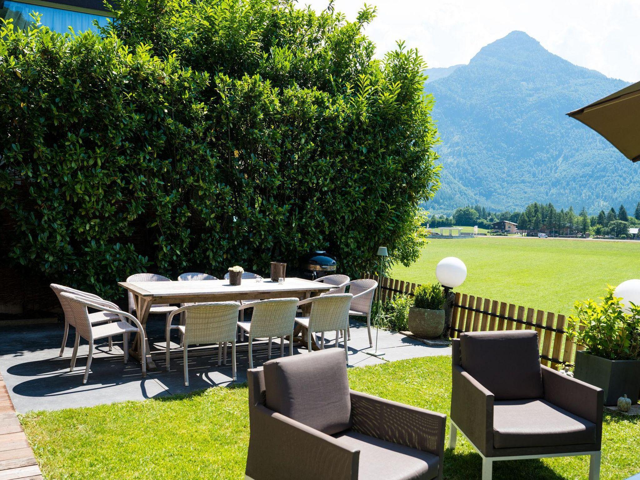 Der Garten und die Terrasse überzeugt mit einem einzigartigen Blick auf die Bergwelt des Göllmassivs, des Hagengebirges und des Tennengebirges. Ihnen vorgelagert sind die saftig grünen Wiesen des Salzachtales. Loungemöbel, ein großer Gartentisch mit Stühlen, Beschattungsmöglichkeiten oder ein Sonnenbett schaffen in dieser idyllischen Umgebung eine Oase, die nach einem erlebnisreichen Urlaubstag absolute Erholung bietet.
