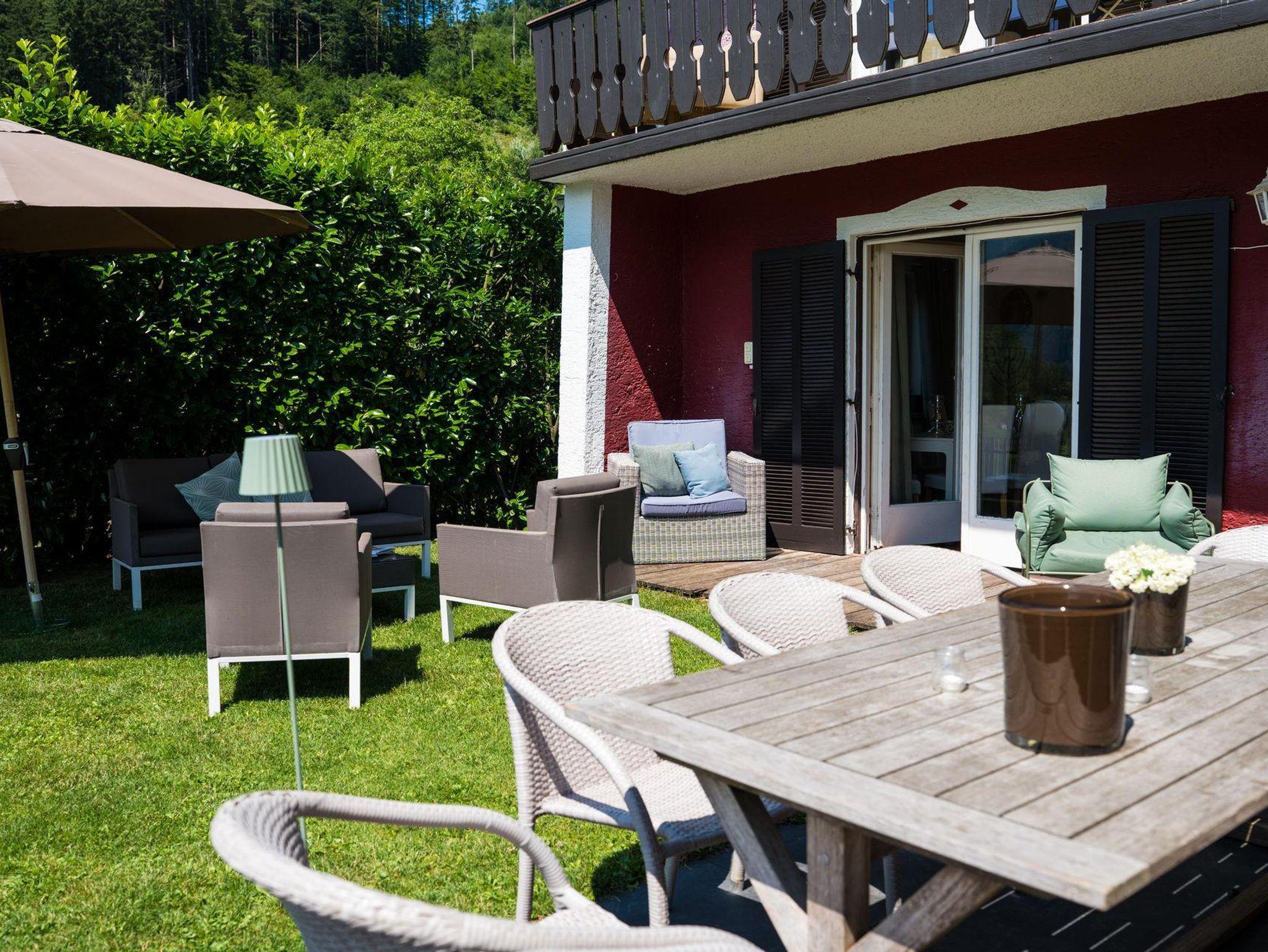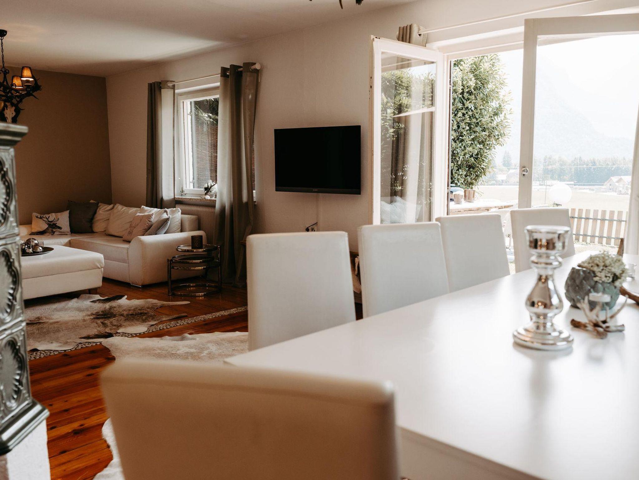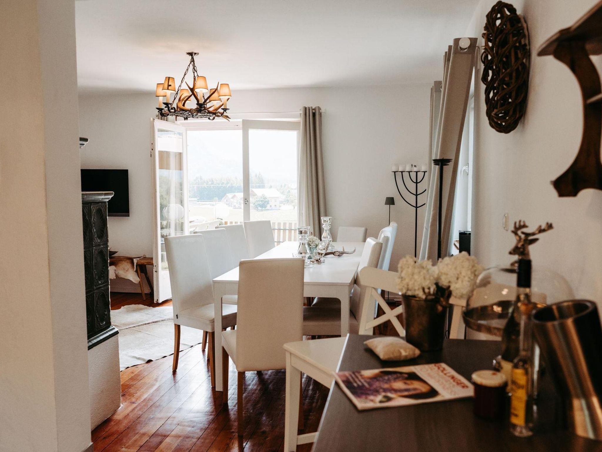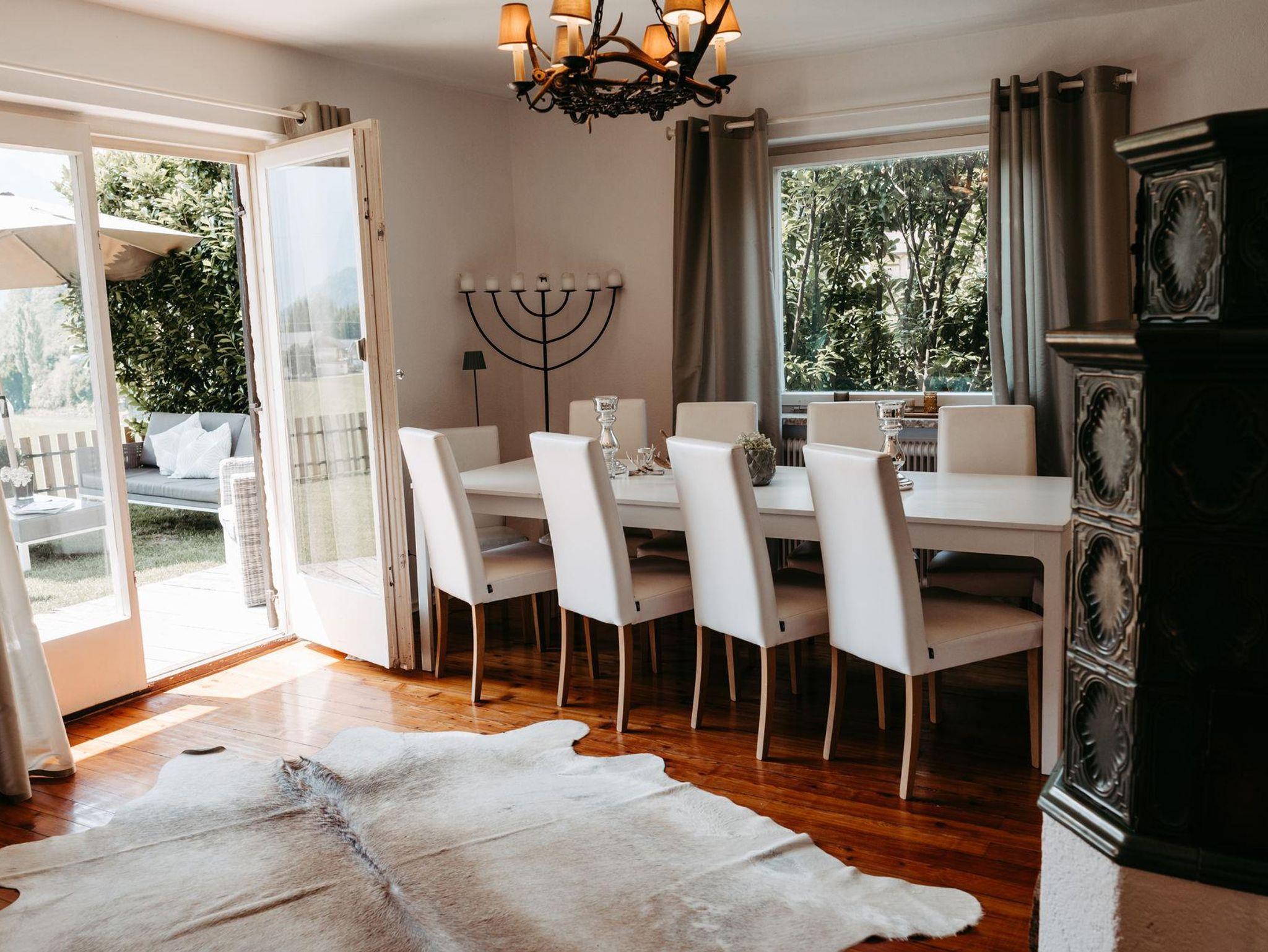 Für gemütliche Abende ist das charmante Wohnzimmer wie gemacht: ein Kamin schafft wohlige Atmosphäre und die großzügige Couchlandschaft bietet Platz zum Kuscheln und Spielen. Direkt an das Wohnzimmer schließt die elegante Küche mit moderner Ausstattung (Geschirrspüler, Mikrowelle, Kaffee-und Teemaschine, E-Herd mit Backofen usw.). Das geräumige Esszimmer mit Flat TV besticht mit einem einmaligen Blick auf die Berge. Ein direkter Zugang vom Erdgeschoß in den Garten bzw. zu den beiden Terrassen stellt sie vor die Qual der Wahl: Frühstück in der Morgensonne oder am gemütlichen Küchentisch? Das kürzlich renovierte Bad mit Regendusche und die separate Toilette erfüllen alle Bedürfnisse für ein entspanntes Zusammensein im Kreise der Familie.