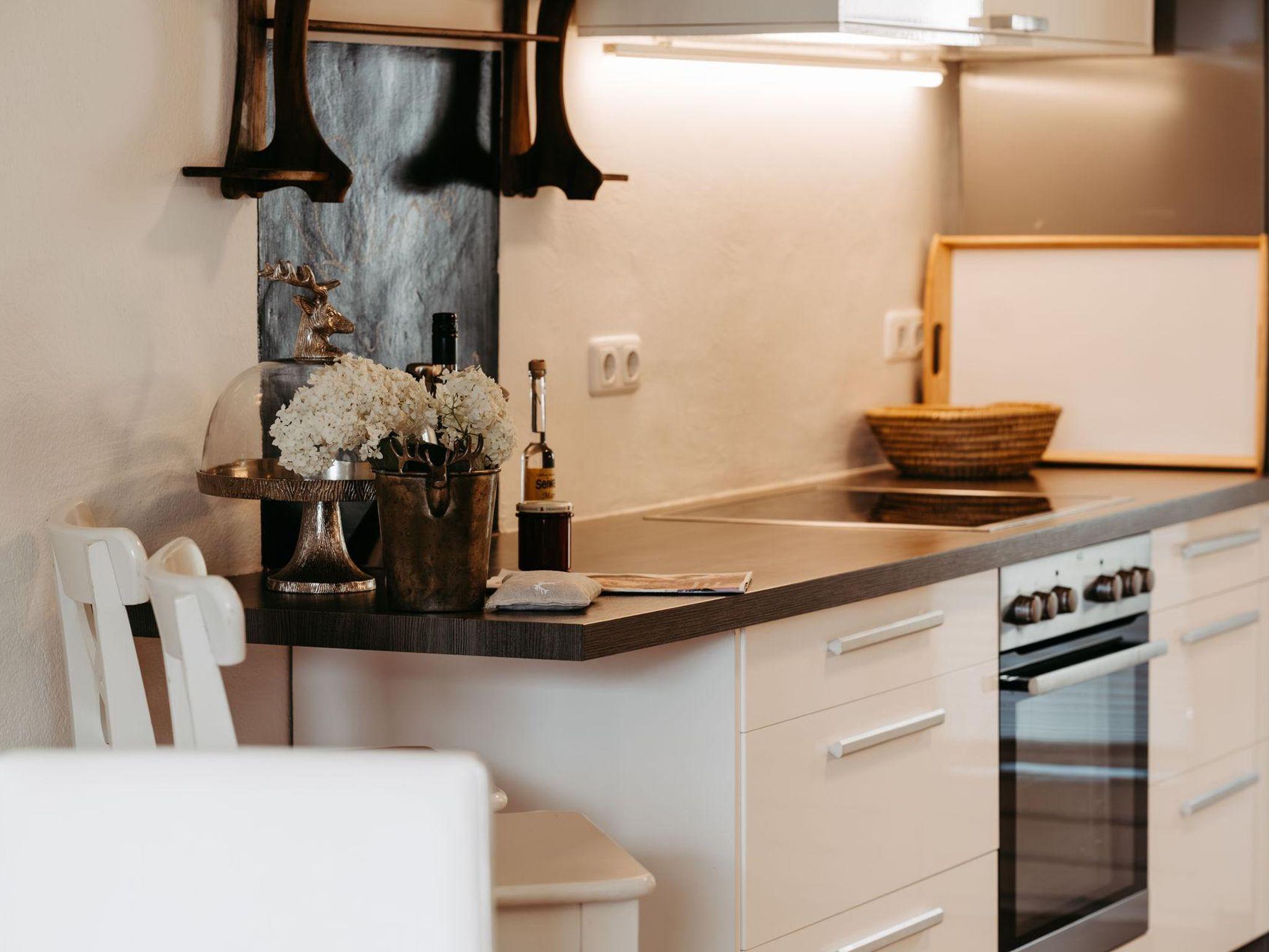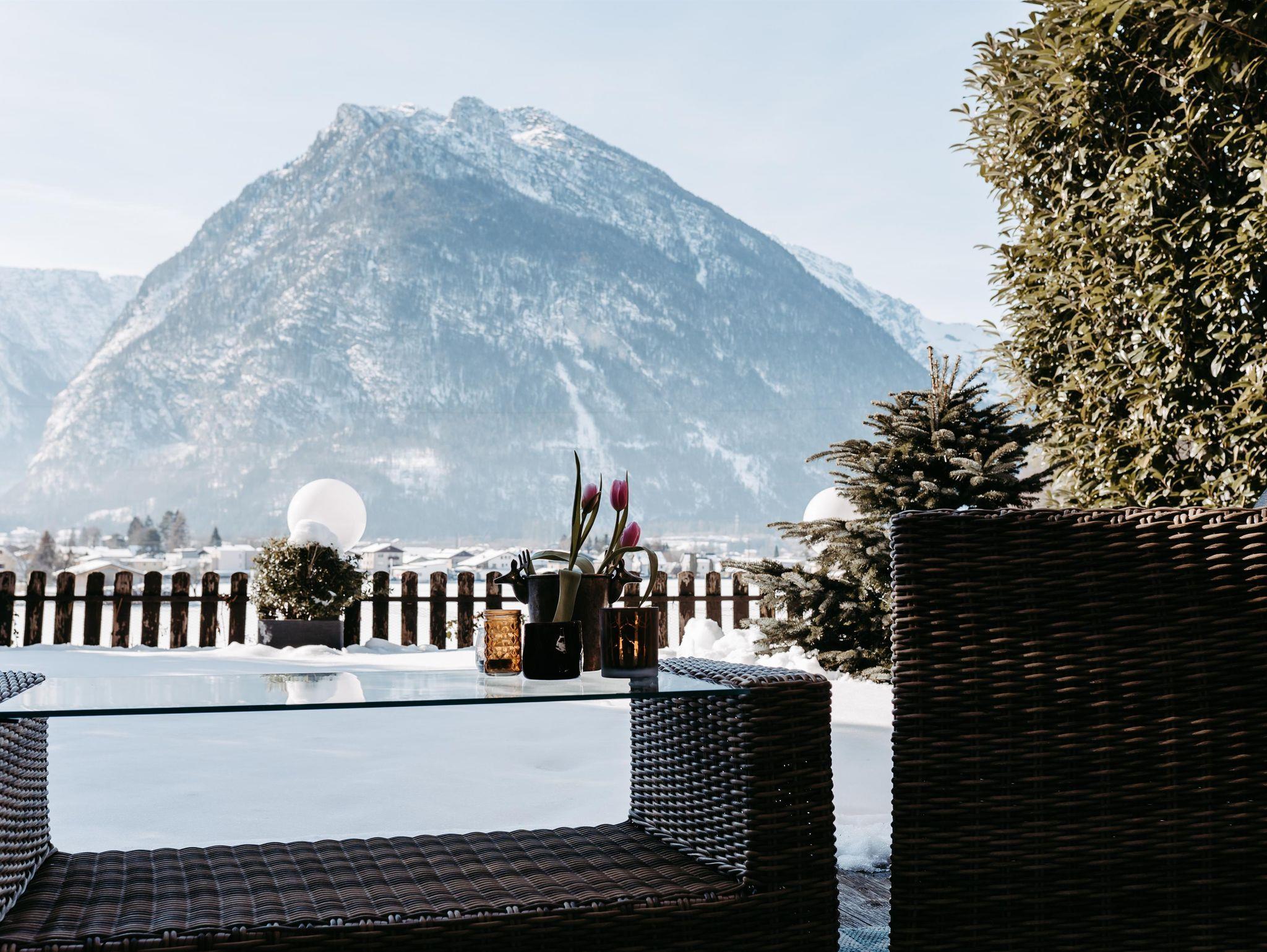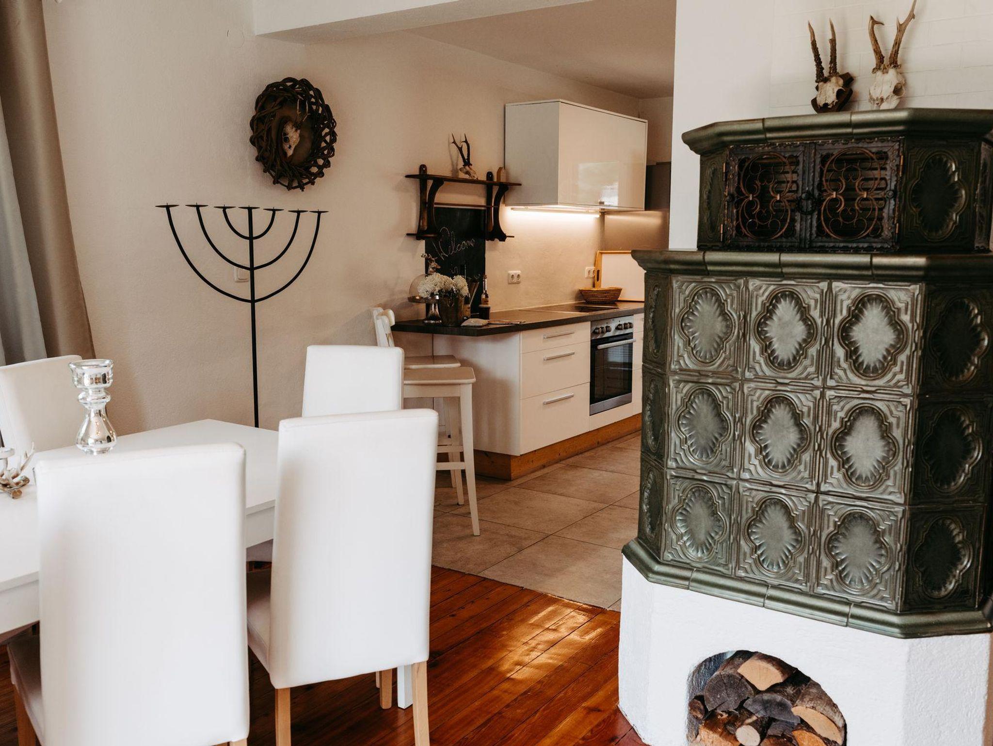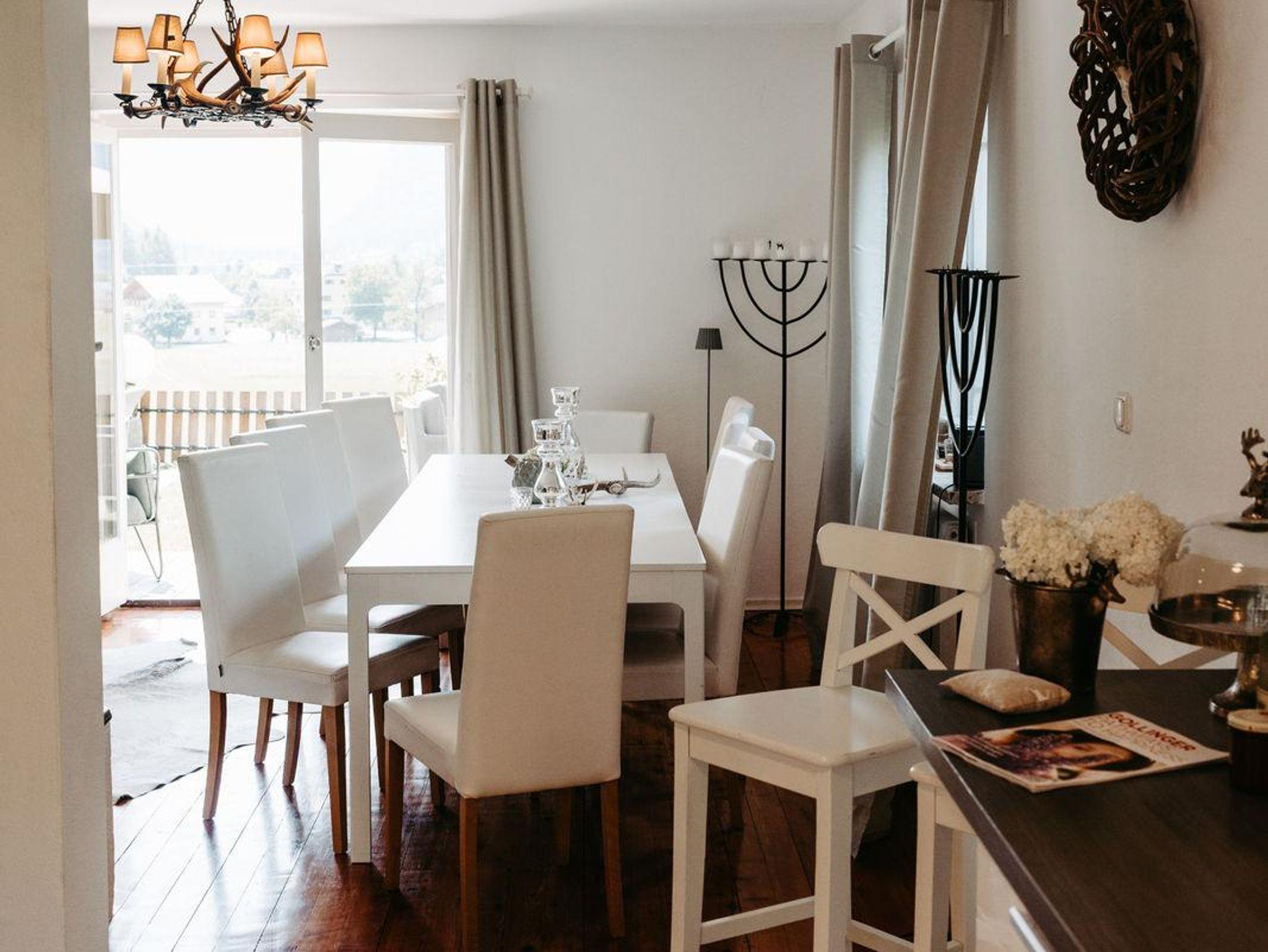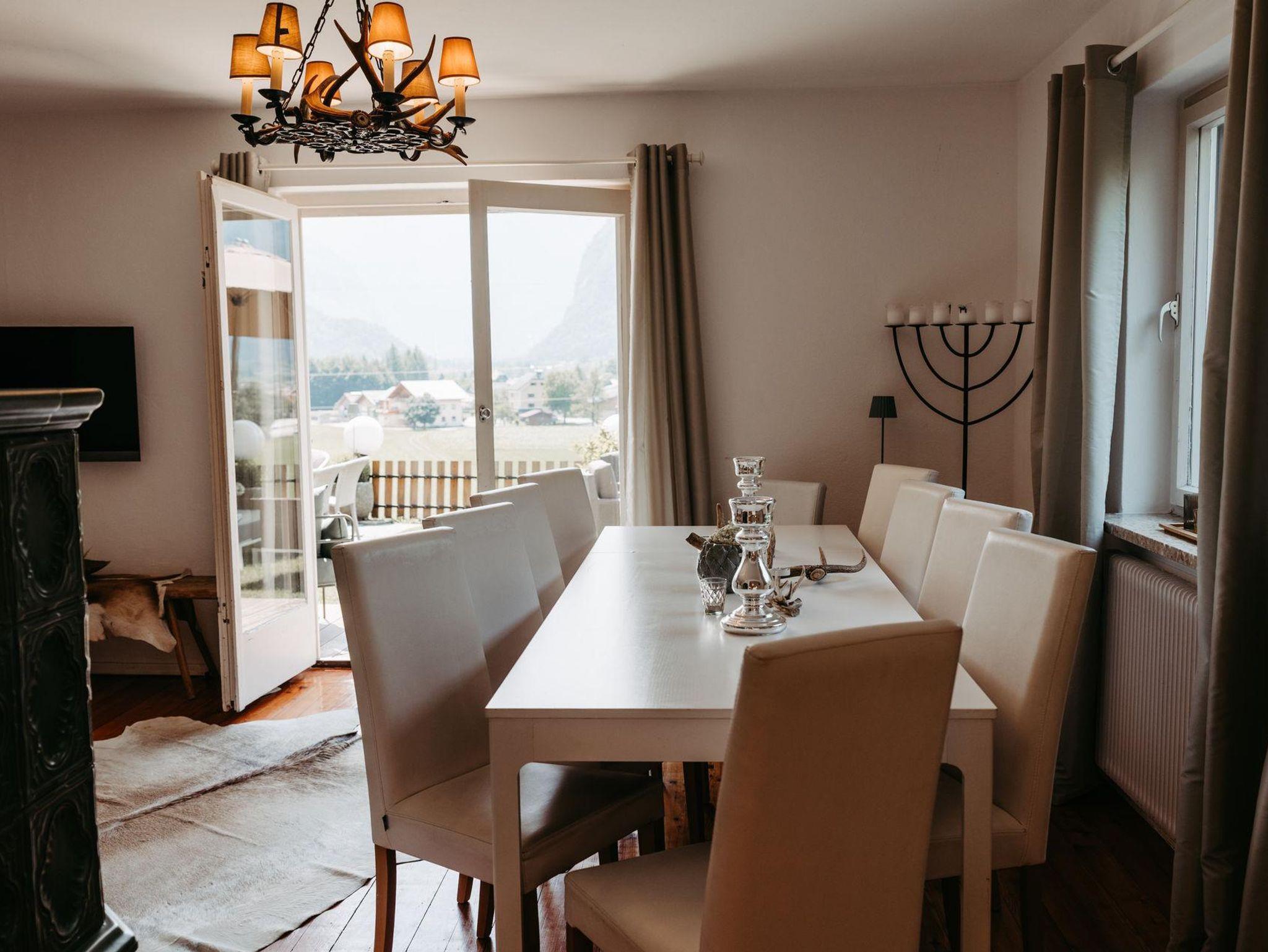 Für gemütliche Abende ist das charmante Wohnzimmer wie gemacht: ein Kamin schafft wohlige Atmosphäre und die großzügige Couchlandschaft bietet Platz zum Kuscheln und Spielen. Direkt an das Wohnzimmer schließt die elegante Küche mit moderner Ausstattung (Geschirrspüler, Mikrowelle, Kaffee-und Teemaschine, E-Herd mit Backofen usw.). Das geräumige Esszimmer mit Flat TV besticht mit einem einmaligen Blick auf die Berge. Ein direkter Zugang vom Erdgeschoß in den Garten bzw. zu den beiden Terrassen stellt sie vor die Qual der Wahl: Frühstück in der Morgensonne oder am gemütlichen Küchentisch? Das kürzlich renovierte Bad mit Regendusche und die separate Toilette erfüllen alle Bedürfnisse für ein entspanntes Zusammensein im Kreise der Familie.