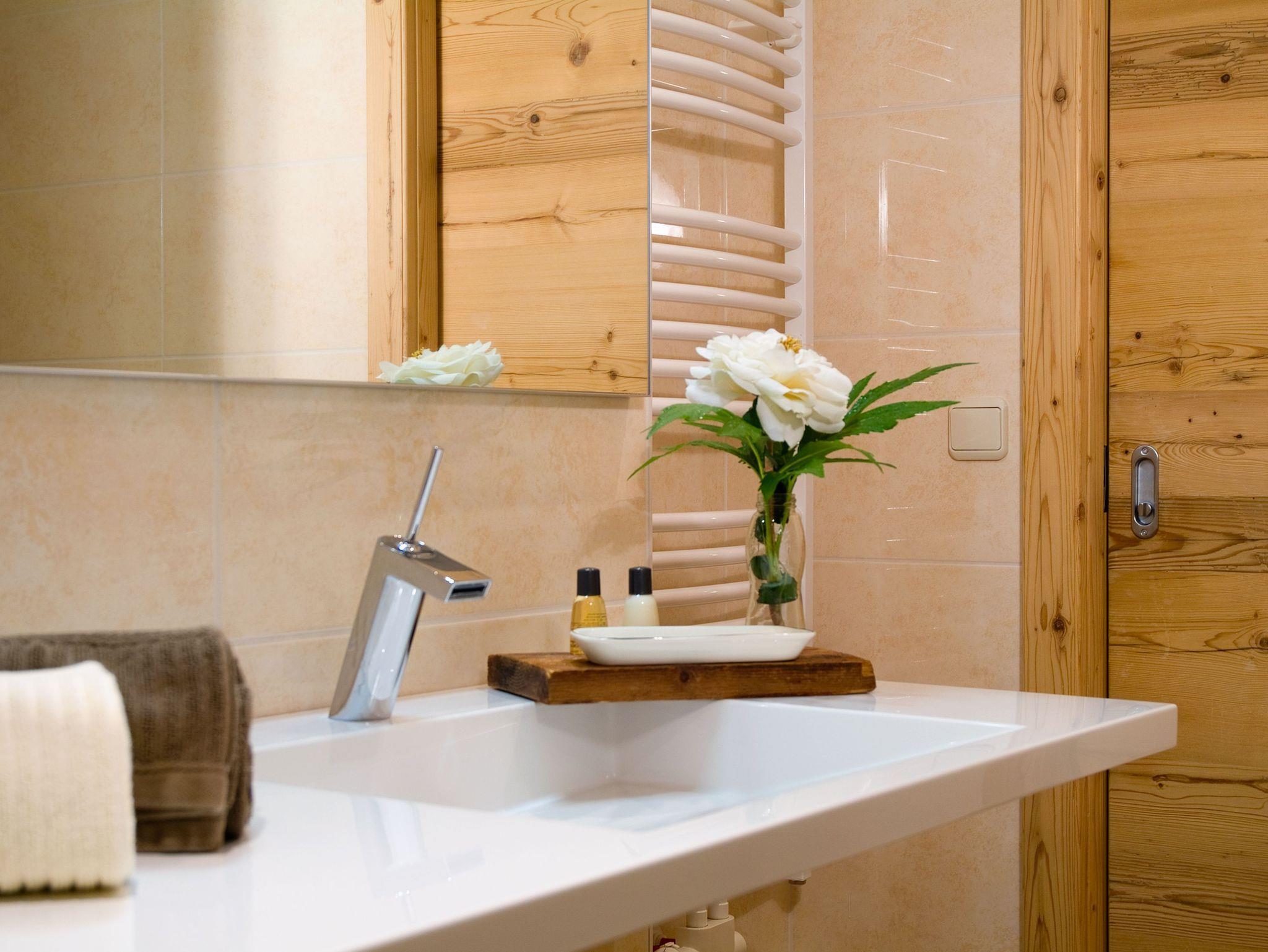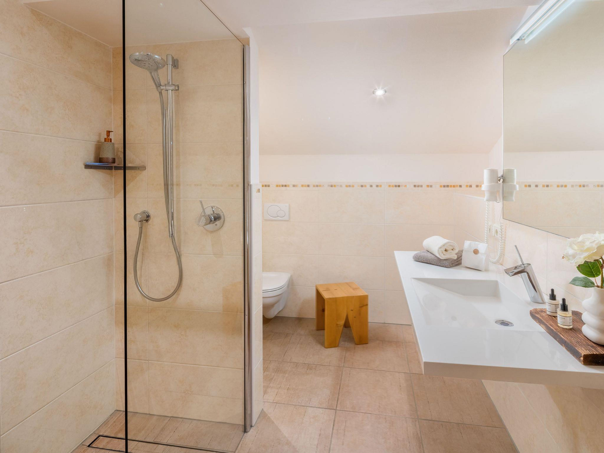 Ein wohlig zufriedenes Lächeln gibt es on-top. Nach dem Saunagang können Sie sich auf dem eigenen blickgeschützten Giebelbalkon an der frischen Luft abkühlen, im Winter im Schnee wälzen. Aus der Dusche kommt reinstes Alpenwasser und sorgt für ein vitales Körpergefühl und klare Frische. Es gibt nichts Schöneres, als sich anschließend zu entspannen und den Blick aus unseren Panoramafenstern zu genießen.