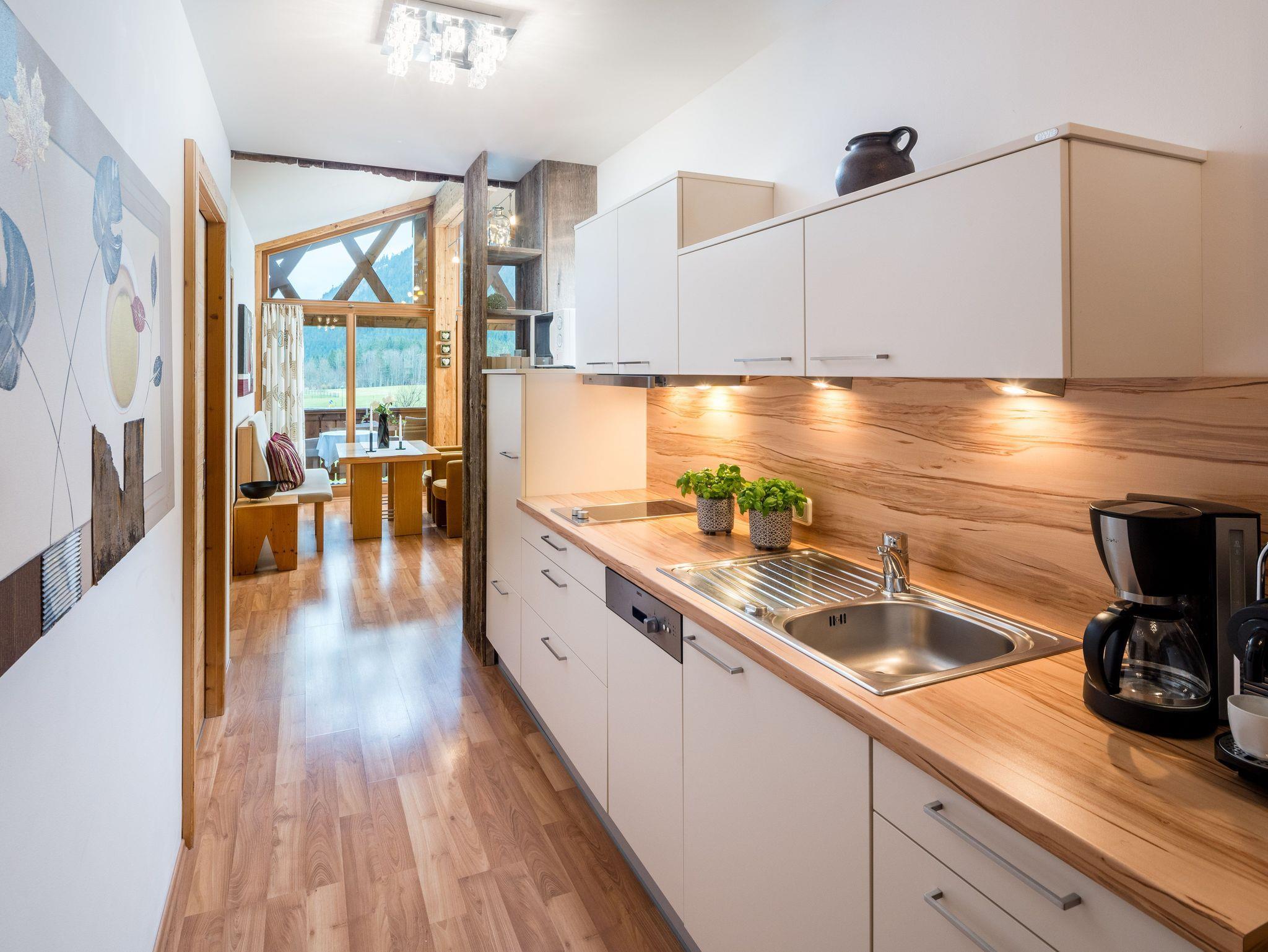 Imposantes Stadelholz und knorriges Schwemmholz schaffen Ursprünglichkeit. Die voll ausgestattete Küche lädt zu Kochabenteuern ein oder Sie genießen kulinarische Highlights in den nahegelegenen Restaurants.