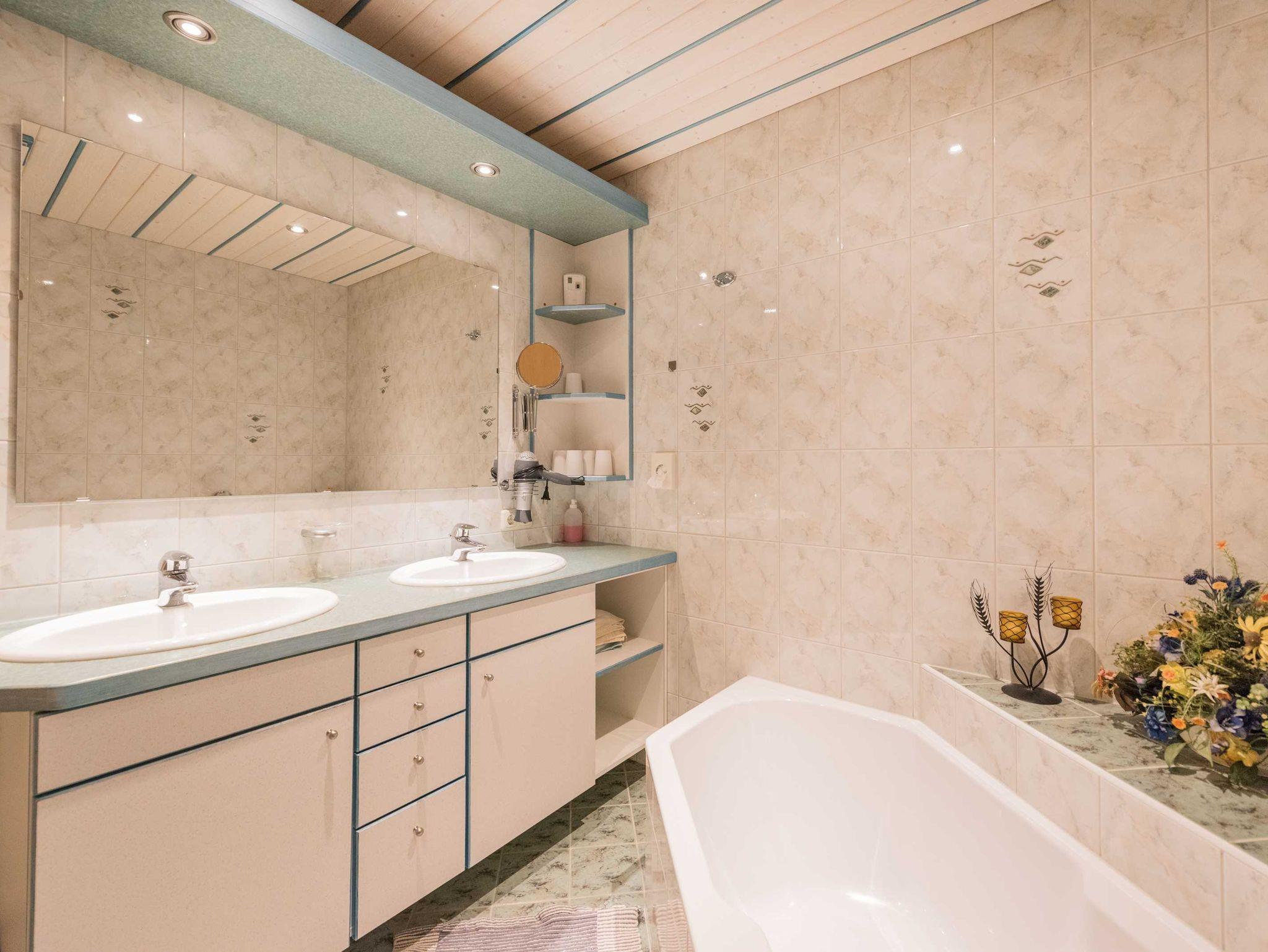Komfortables Badezimmer mit Dusche / WC, Waschbecken, großer Ablage und Spiegel sowie separates WC.