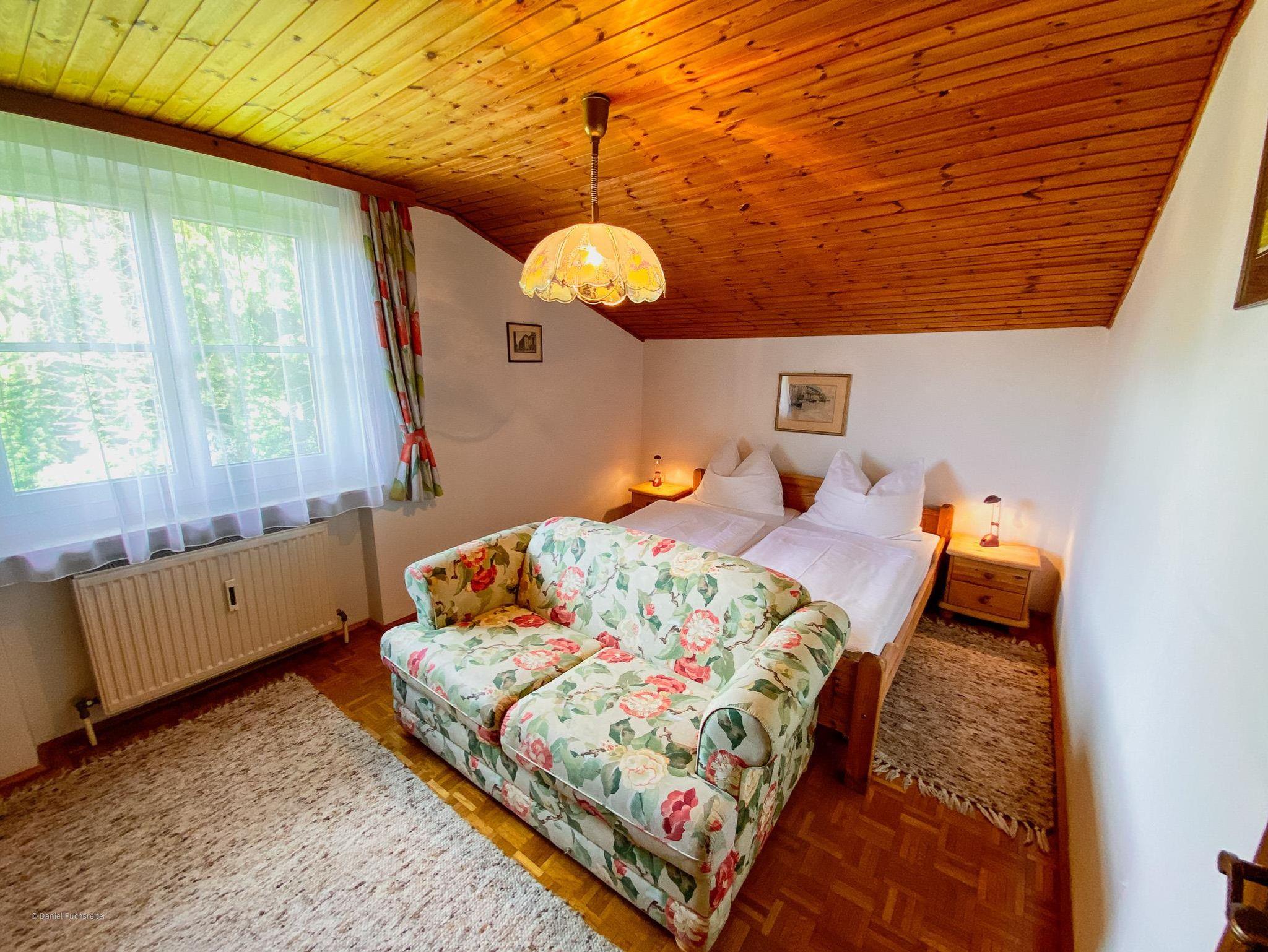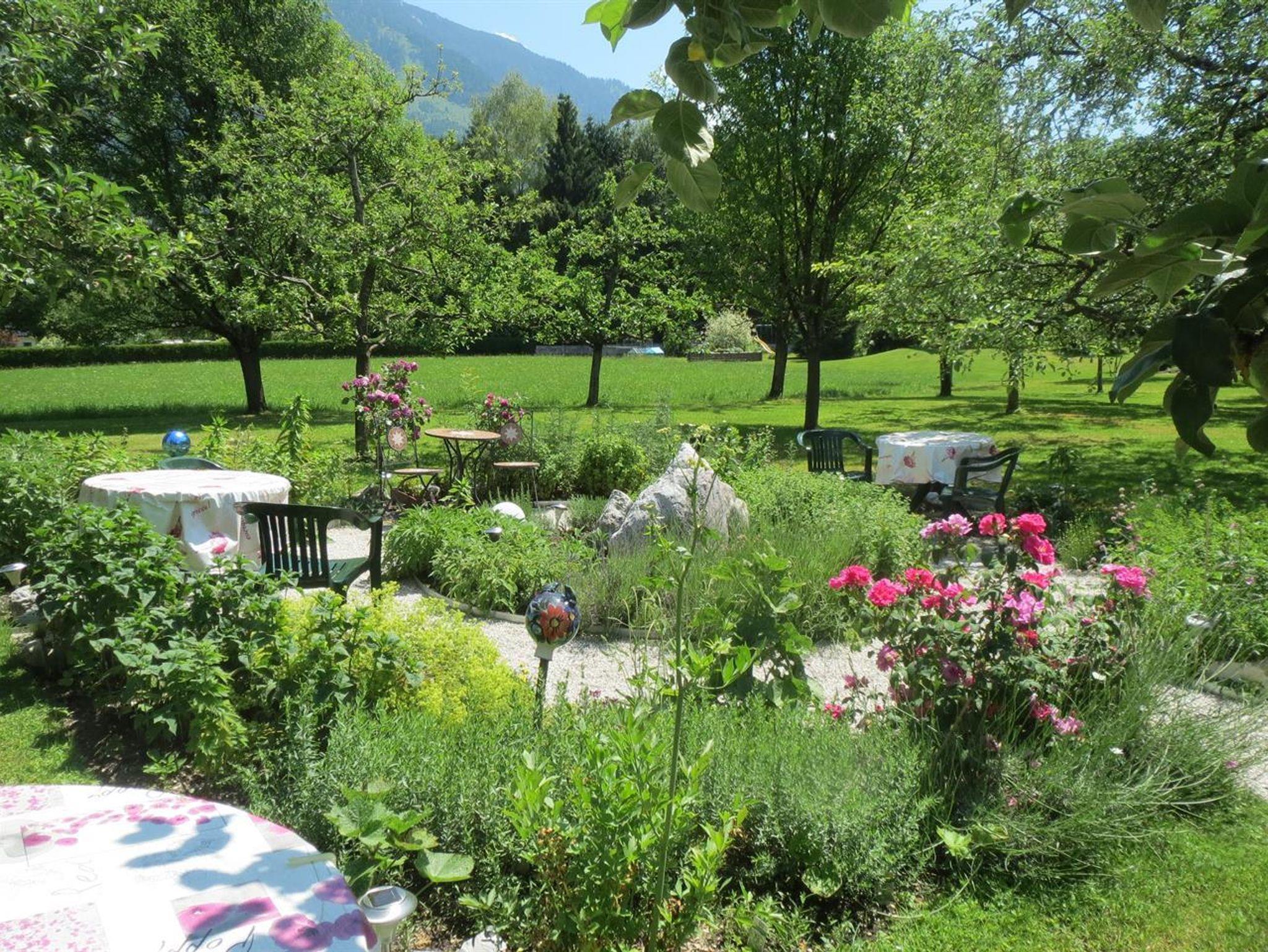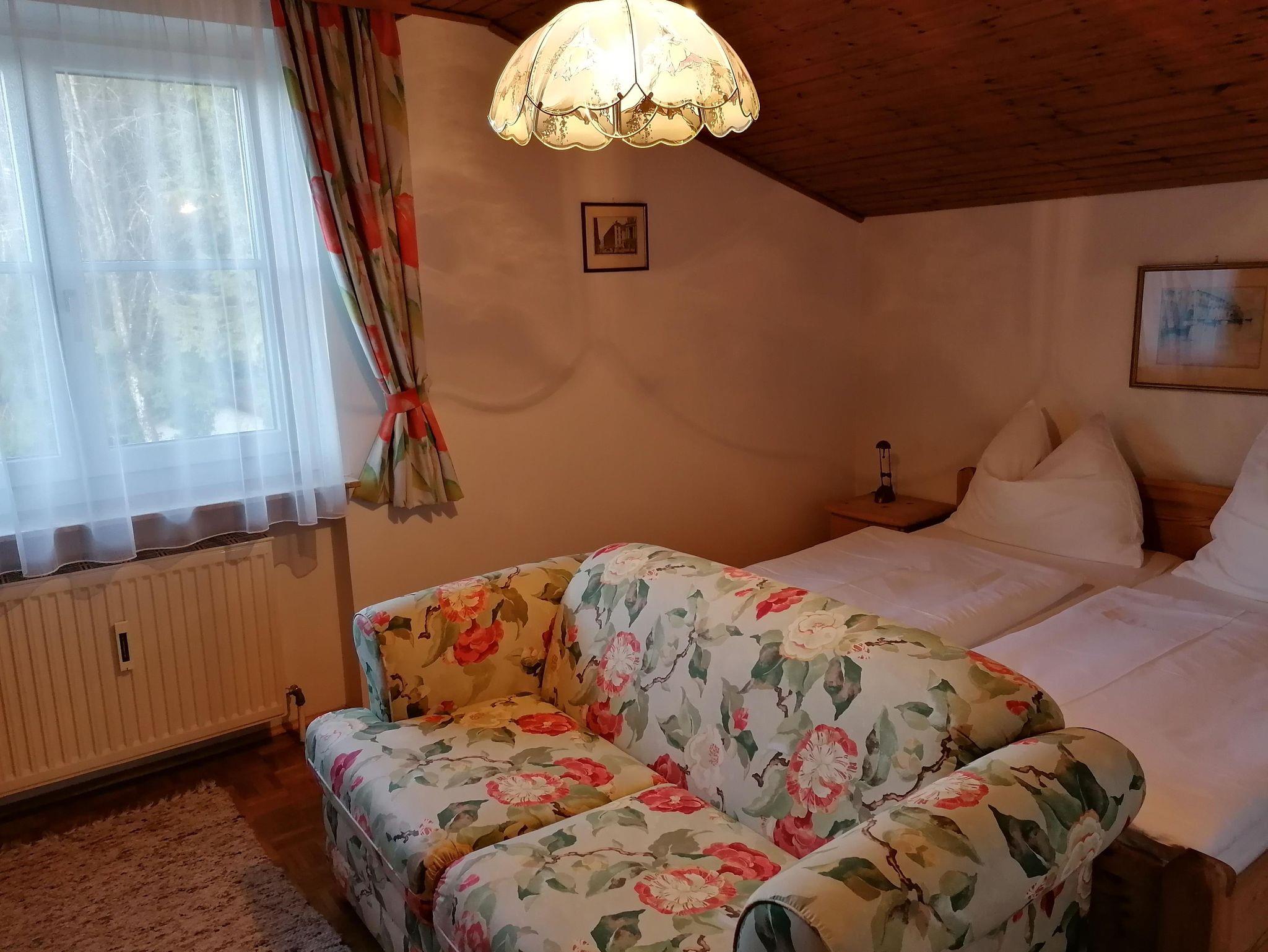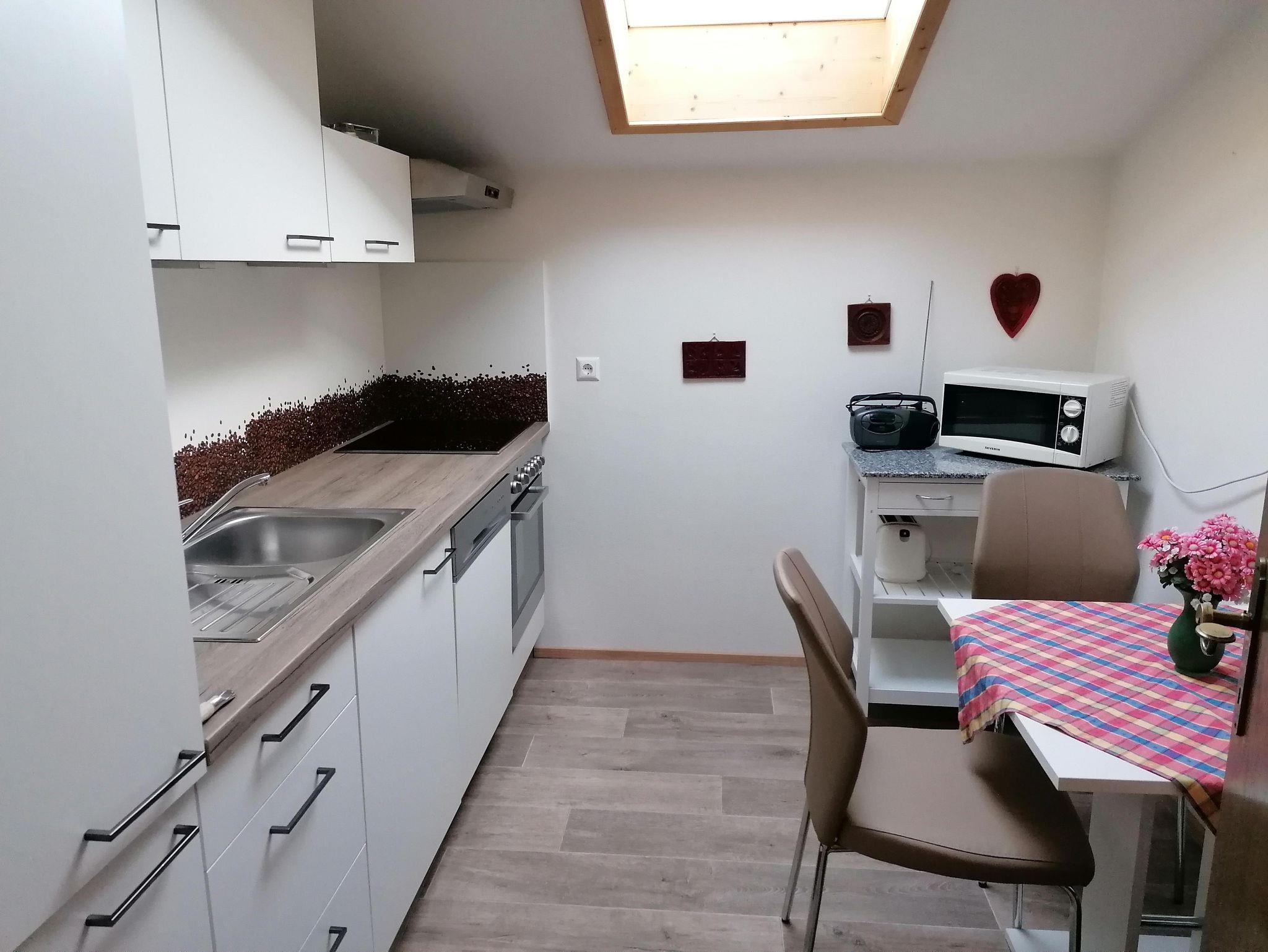 Ferienwohnung mit Schlafzimmer, Wohnzimmer, Küche mit Geschirrspüler, Micro, Backofen, Wasserkocher, Toaster, Filterkaffemaschine, Kabel-TV 2x, Bad und WC, WLAN, Vorraum, Fön, Kosmetikspiegel, Balkon mit traumhafter Aussicht auf die Berge und natürlich Benutzung unseres großen Gartens. Bettwäsche und Handtücher sind genügend vorhanden.