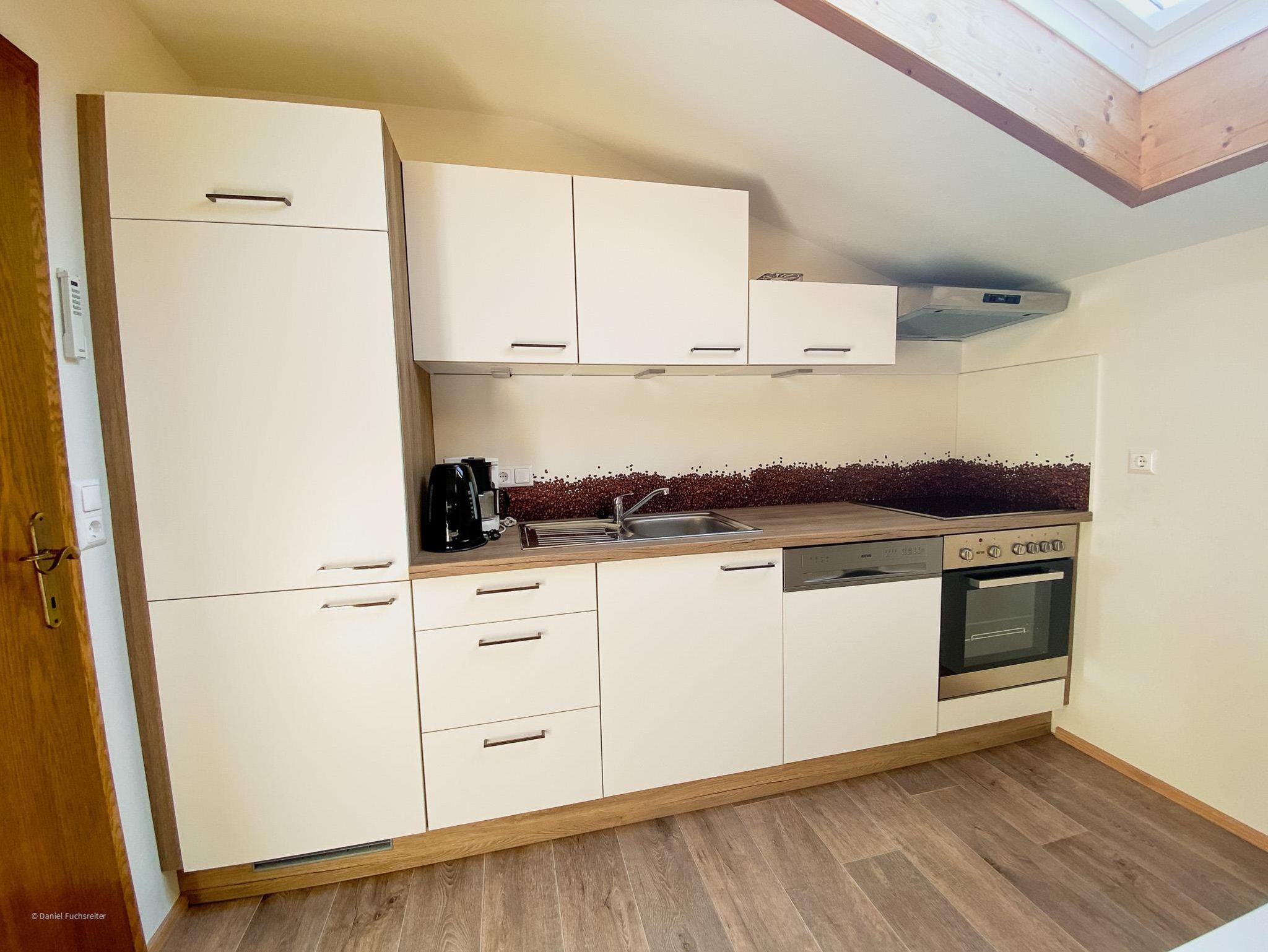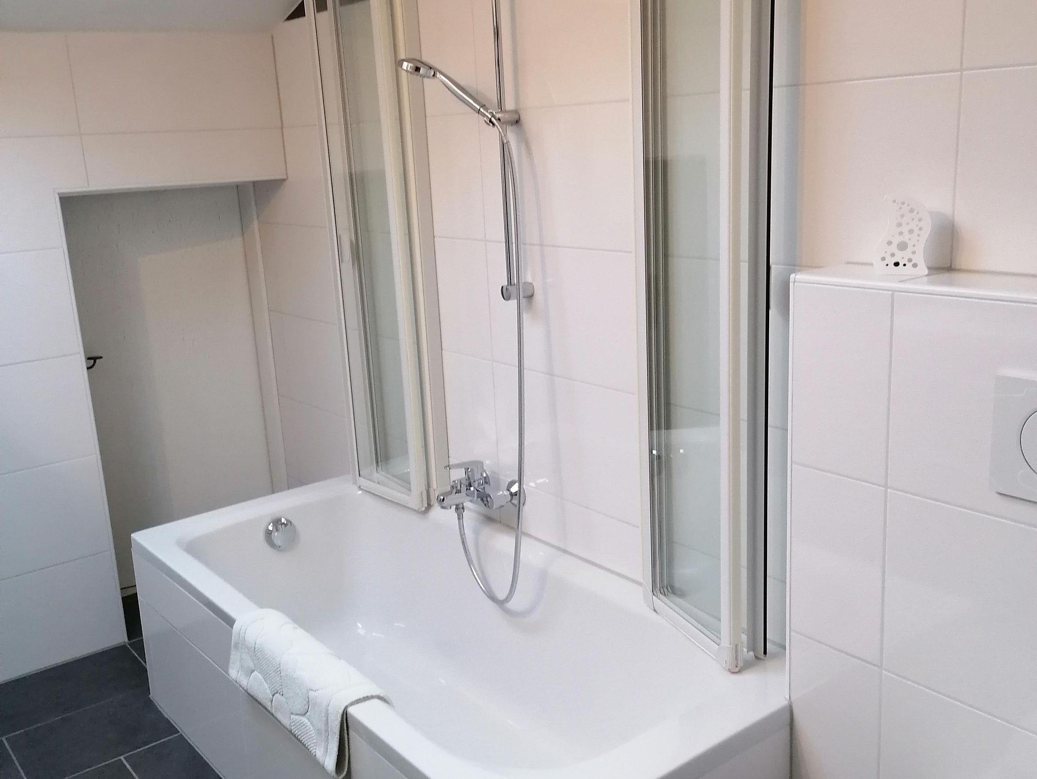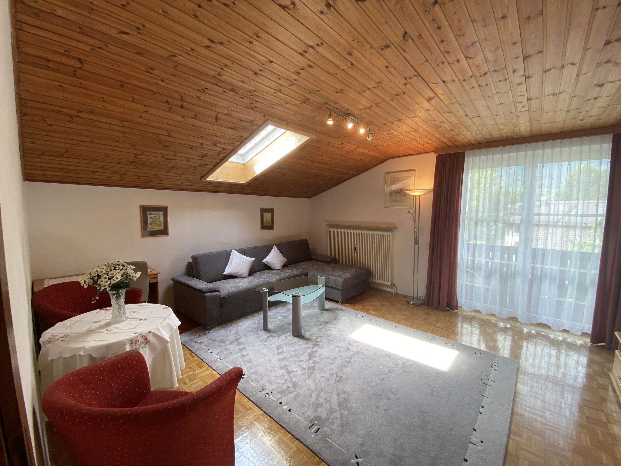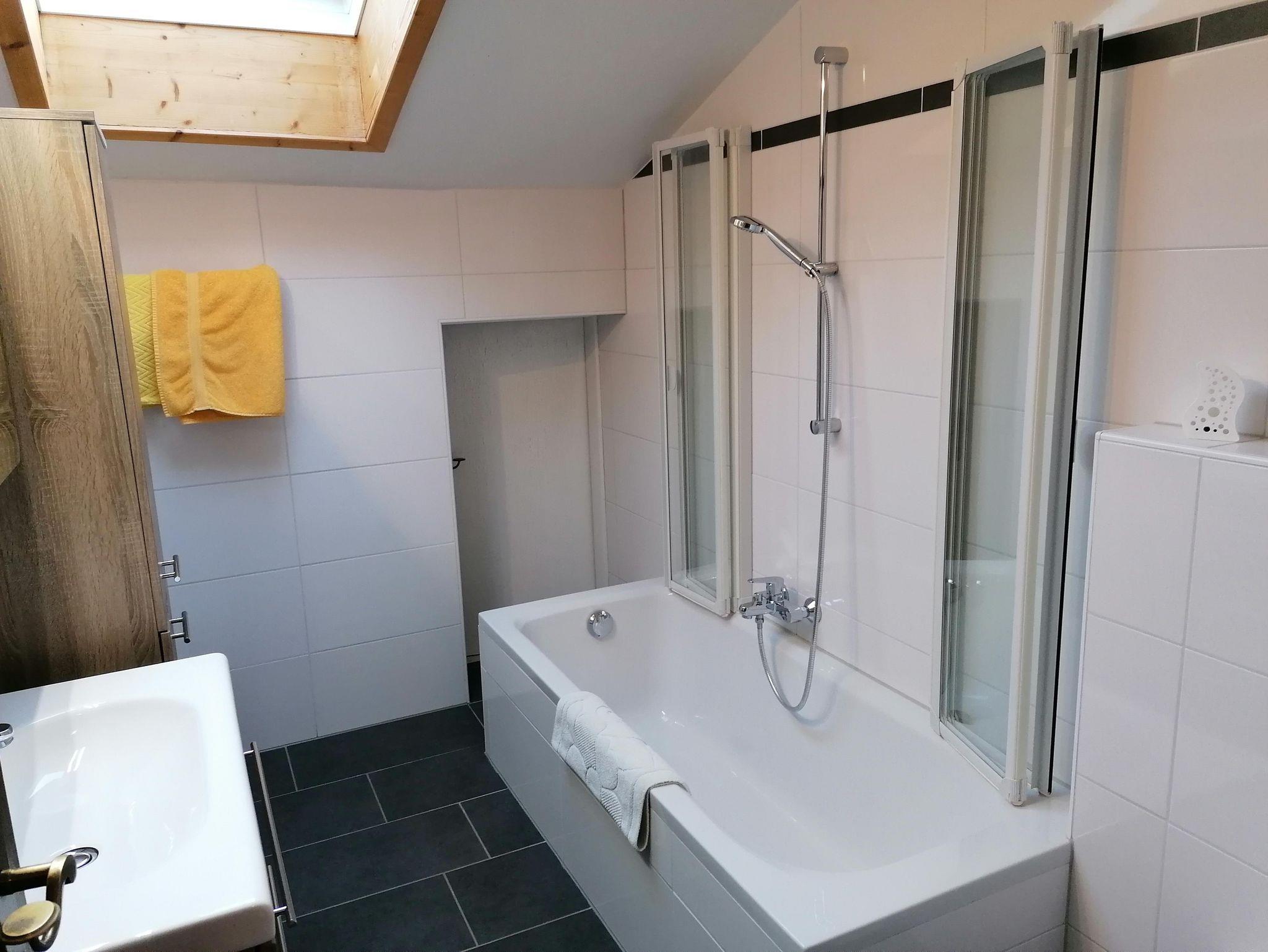 Ferienwohnung mit Schlafzimmer, Wohnzimmer, Küche mit Geschirrspüler, Micro, Backofen, Wasserkocher, Toaster, Filterkaffemaschine, Kabel-TV 2x, Bad und WC, WLAN, Vorraum, Fön, Kosmetikspiegel, Balkon mit traumhafter Aussicht auf die Berge und natürlich Benutzung unseres großen Gartens. Bettwäsche und Handtücher sind genügend vorhanden.
