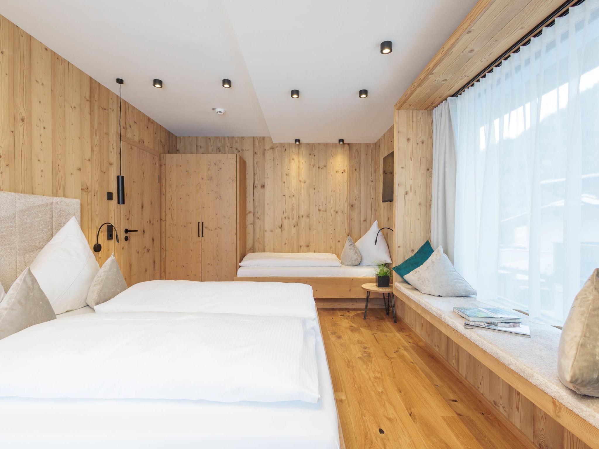 "Mountain Suite Nr 103", 4-room apartment 82 m2, on the upper ground floor. Tasteful and wooden furniture furnishings: living/dining room with dining nook, kitchen corner, satellite TV and international TV channels (flat screen). Exit to the balcony. 2 double bedrooms. Exit to the balcony. 1 room with 1 bed, 1 double bed, satellite TV and international TV channels (flat screen). Exit to the balcony. Open kitchen (dishwasher, 4 ceramic glass hob hotplates, toaster, kettle, microwave, electric coffee machine, Capsules for coffee machine (Nespresso) extra). Shower, shower/WC, sep. WC. Underfloor heating. Wooden floors. 2 balconies. Balcony furniture. Very beautiful panoramic view of the mountains and the resort. Facilities: safe, hair dryer. Internet (WiFi, free). Garage (1 car). E-charging station. Please note: non-smokers only. Suitable for allergy sufferers. Bed layout is flexible. There are more sleeping options available than the maximum number of people allowed which may, however, not be exceeded. 50411-008165-2024