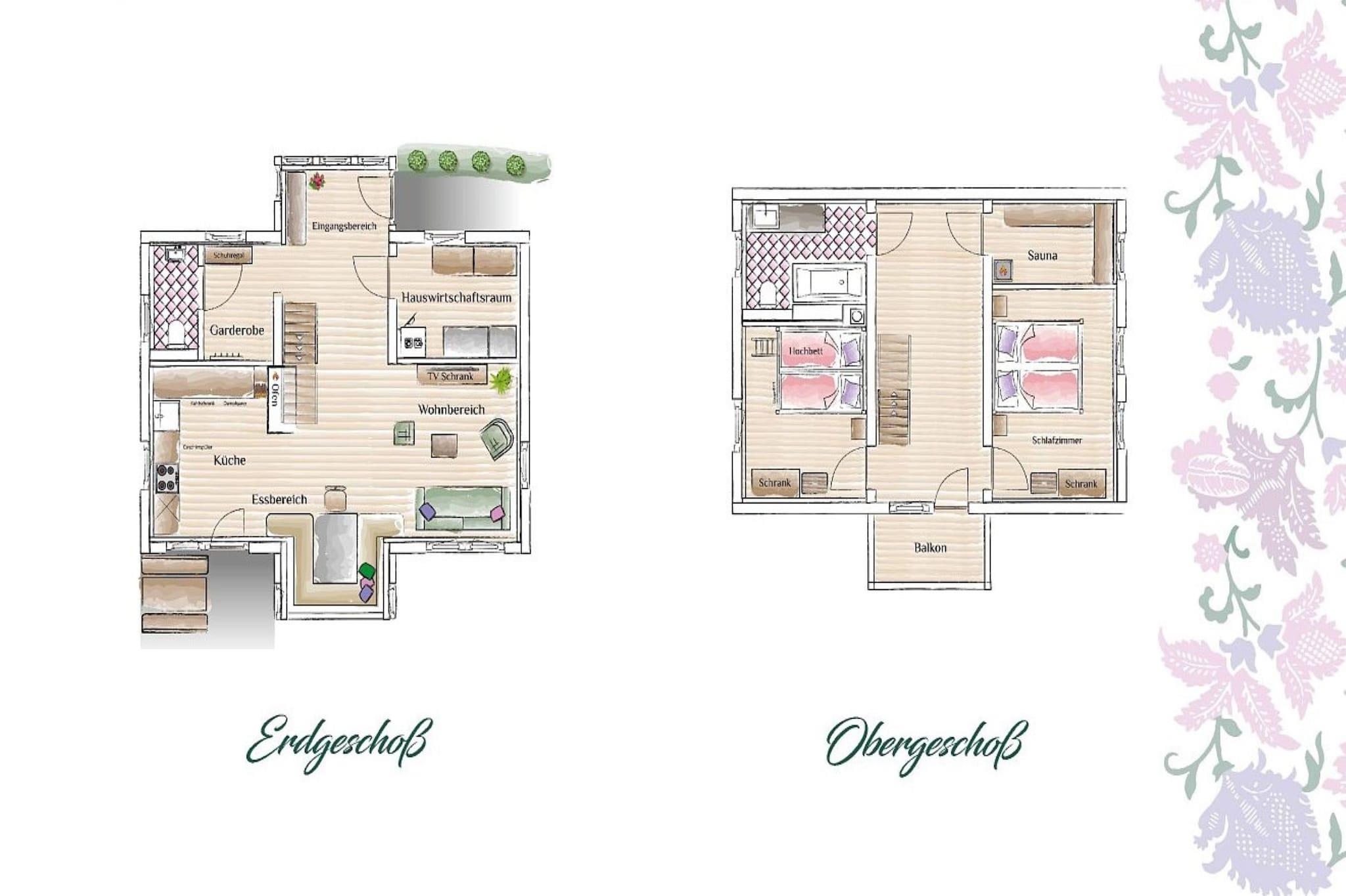 Ground floor: (Entrance, Living room(double sofa bed, TV, fireplace), open kitchen(dining table, hob, electric kettle, toaster, hood, coffee machine, oven, dishwasher, fridge-freezer, Wine glasses), toilet(washbasin, toilet), storage(tumble dryer, washing machine), balcony or terrace, garden furniture) On the 1st floor: (bedroom(double bed), bedroom(single loft bed, double bed), bathroom(bathtub or shower, washbasin, toilet, hairdryer), sauna(private)(sauna), balcony) recreation room(shared with other guests), ski storage(shared with other guests), stables, meetings, parties, receptions, garden, garden furniture, parking, deckchairs, swimming pool(shared with other guests, natural swimming pond), tennis court, sand pit, play equipment, slide, football goal, lounge set, party games, Sunscreen, Swing set, Mountain view, Village
