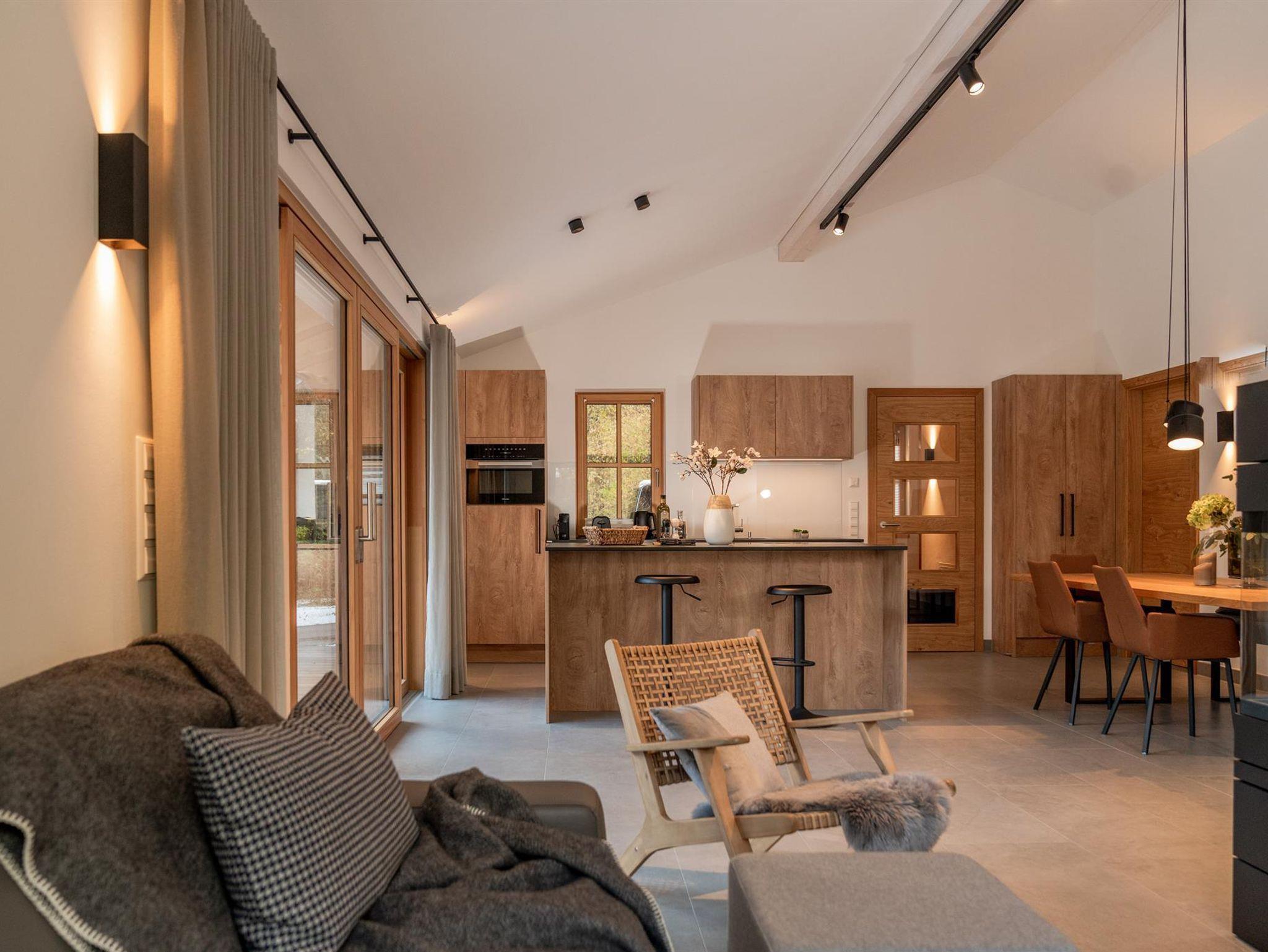 Alle Chalets sind nach SÜDEN ausgerichtet und tauchen dadurch in warmes Tageslicht ein. Die großzügigen Glasfronten und die luftigen Raumhöhen bis zu 5m verbinden alpin-moderne Interieur mit modernster Technologie.