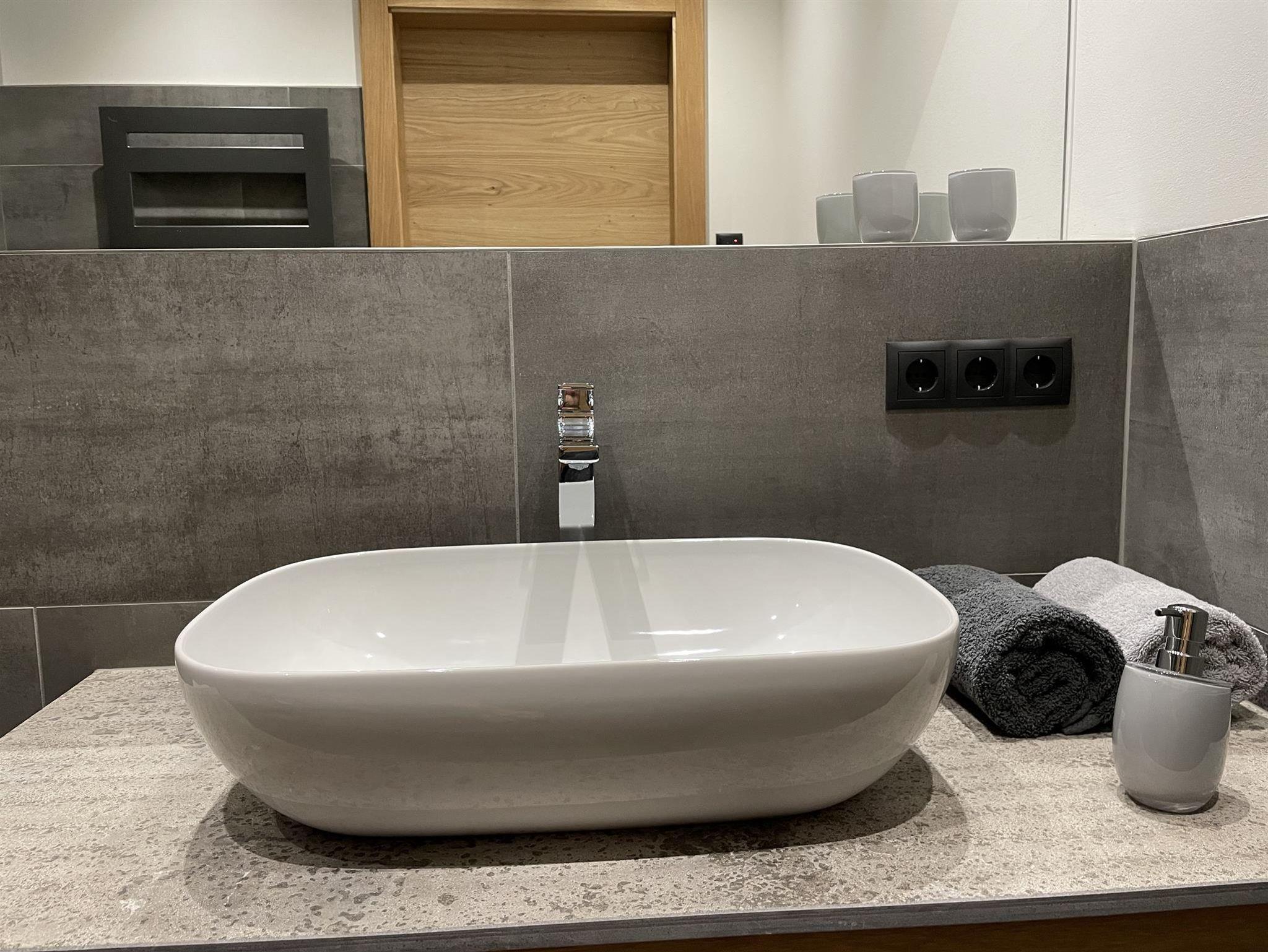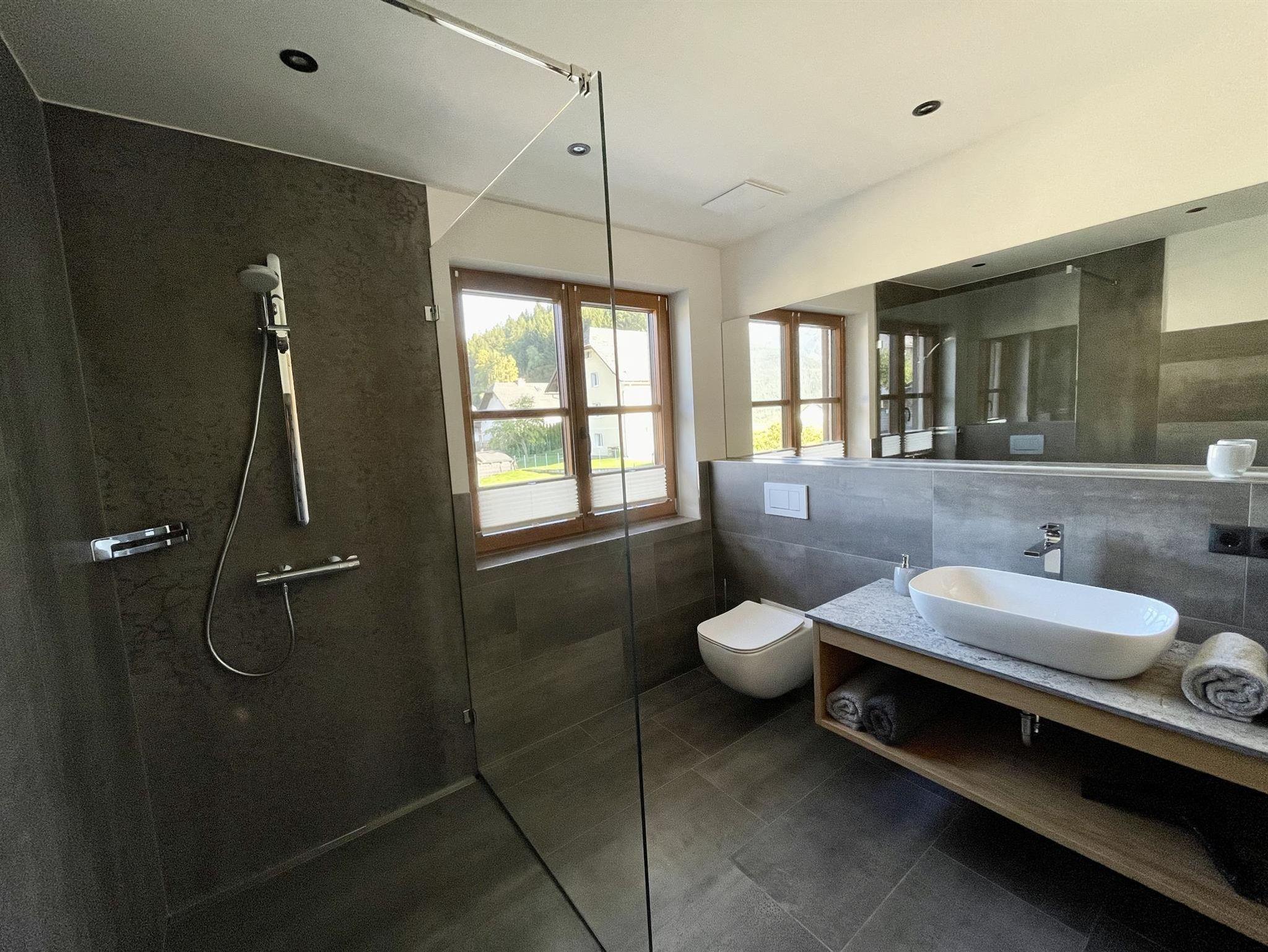 -Badezimmer: Dusche, WC, Handtuchtrockner, Föhn, Handtücher