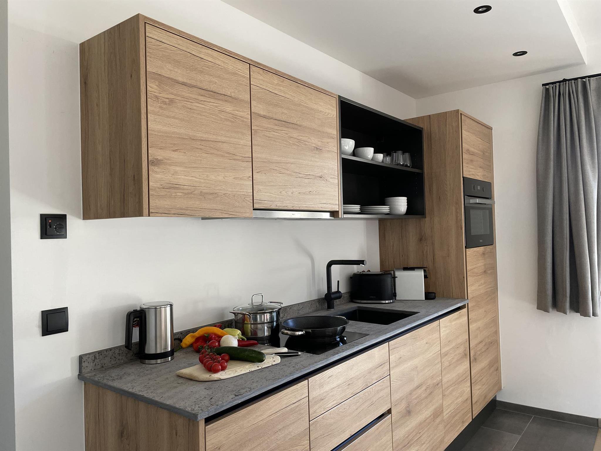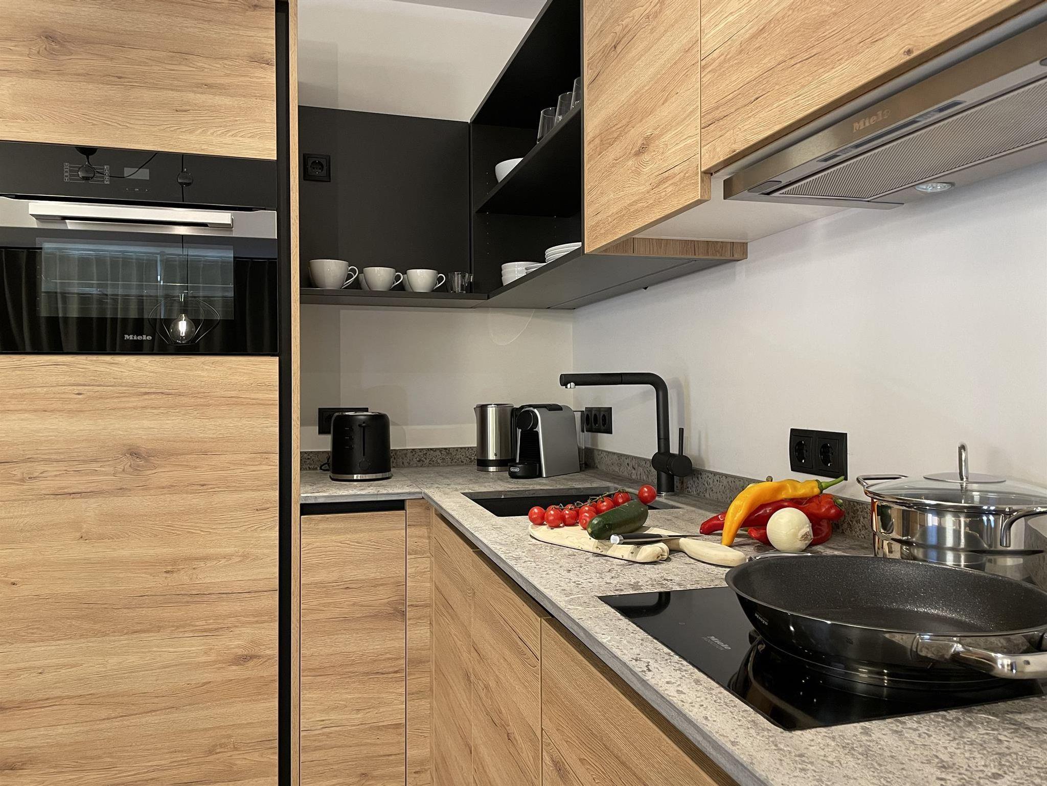 -Küche: Induktionsherd, Backofen Kühlschrank mit Gefrierfach, Geschirrspüler, Toaster, Wasserkocher, Kochgeschirr, Nespresso Kaffeemaschine