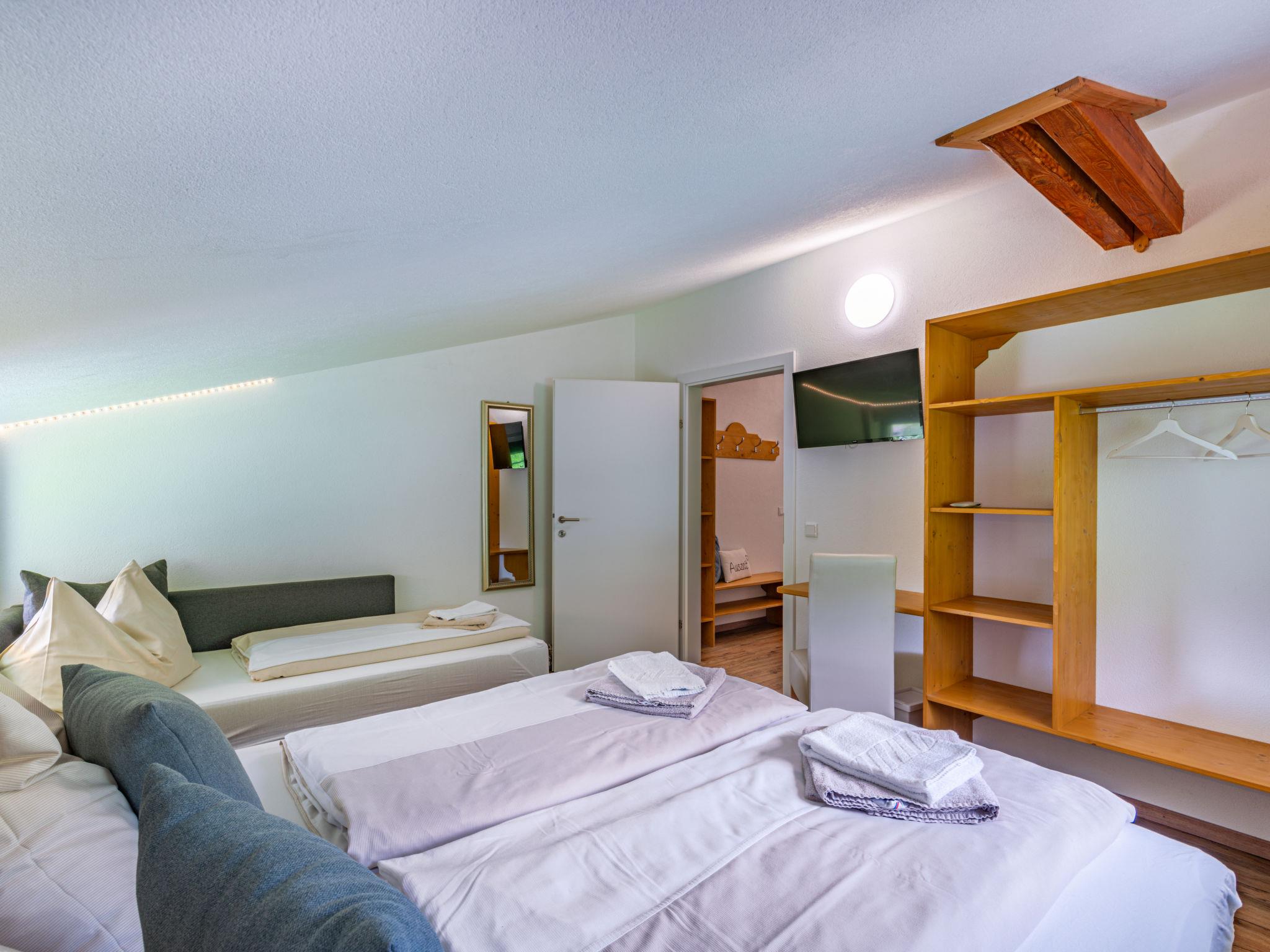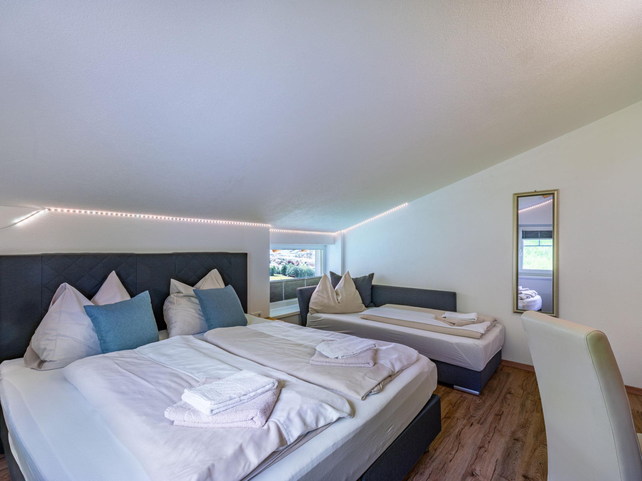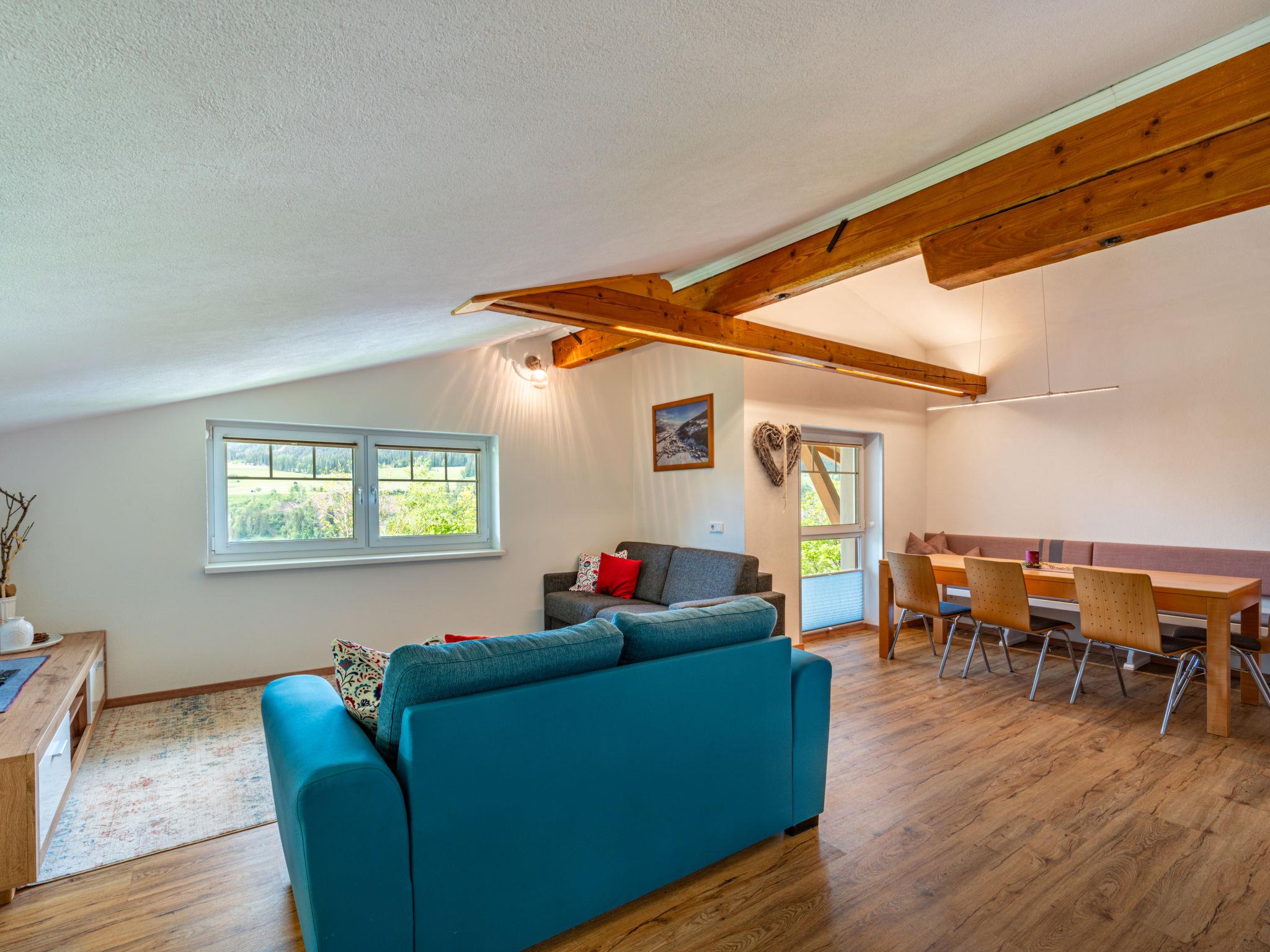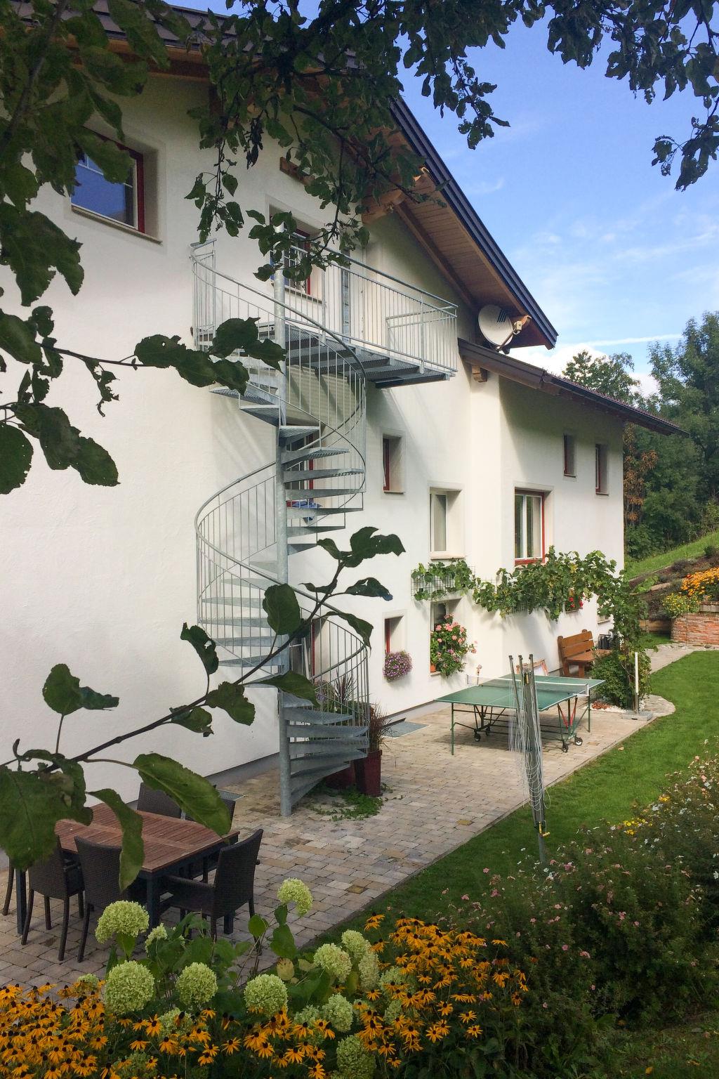 "Mawa", 3-room apartment 106 m2, on the top floor. Object suitable for 6 adults + 2 children. Partly with sloping ceilings, cosy furnishings: living/sleeping room with 1 double sofabed, dining table, satellite TV and international TV channels (flat screen). 2 rooms, each room with 1 sofabed, 1 double bed, satellite TV and international TV channels (flat screen). Open kitchen (oven, dishwasher, 4 ceramic glass hob hotplates, toaster, kettle, electric coffee machine). Shower, sep. WC, double hand-basin. Heating. Parquet floors. Beautiful panoramic view of the mountains and the valley. Facilities: Internet (WiFi, free). Please note: non-smokers only. Note: Access via external spiral staircase or internal entrance. The hot tub is only available during the summer months between May 1st and October 31st and remains closed during the winter.