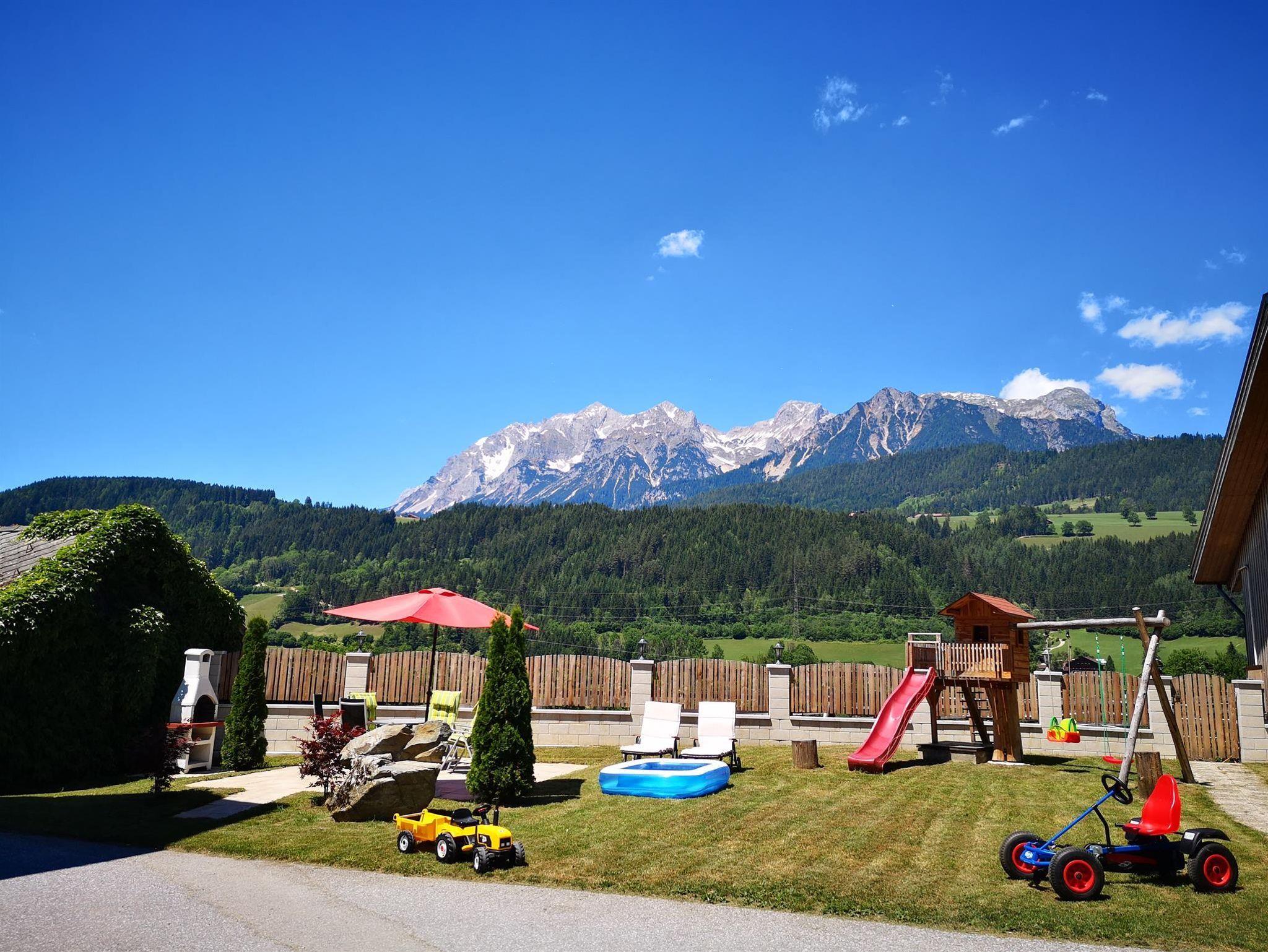 Im Sommer direkt im Wandergebiet mit unzähligen Wanderstrecken, Familienerlebniswegen, Bäder und Seen, Radtouren und anderen Aktivitäten und im Winter nur wenige Minuten entfernt von den Skibergen, direkt an einer Bushaltestelle liegt dieser Bauernhof. Nah an Ortschaften Schladming und Haus im Ennstal. Das Bauernhaus bietet 4 Ferienwohnungen die 2-7 Personen beherbergen können und jeglichem Komfort bieten. So gehören in etwa eine Fußbodenheizung, Ausstattung in Zirbenholz, traumhafter Ausblick auf den Dachstein und freies Wlan zu den Annehmlichkeiten des Hauses. Besonders viel Wert wurde auf die Einrichtung gelegt - durch Verwendung von viel Holz wirkt diese sehr gemütlich und freundlich. Der große Garten mit Grill lädt Sie zum verweilen ein. Kinder können in der Zwischenzeit herumtoben. Täglich können Sie sich frische Frühstückseier aus dem Hühnerstall holen. Die Planai Bergbahen sind nur 5 Autominuten vom Haus entfernt. Direkt vor dem Haus befindet sich eine Bushaltestelle. Restaurants, Lebensmittelgeschäfte, Shops, Bars etc. finden Sie ebenfalls in ca. 5 Autominuten.