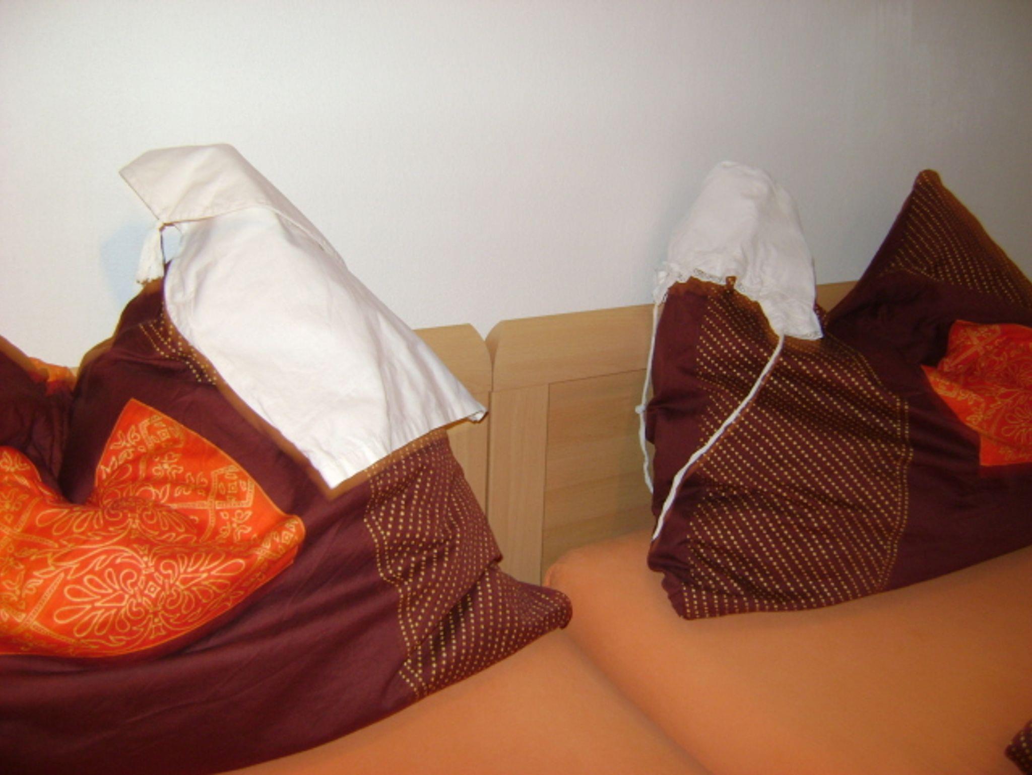 Betten mit Überlänge (210cm) als Doppelbett und zwei Einzelbetten verwendbar, Balkon im Innenhof, gemütlich und groß mit kleiner Kochnische auch für Selbstversorger geeignet