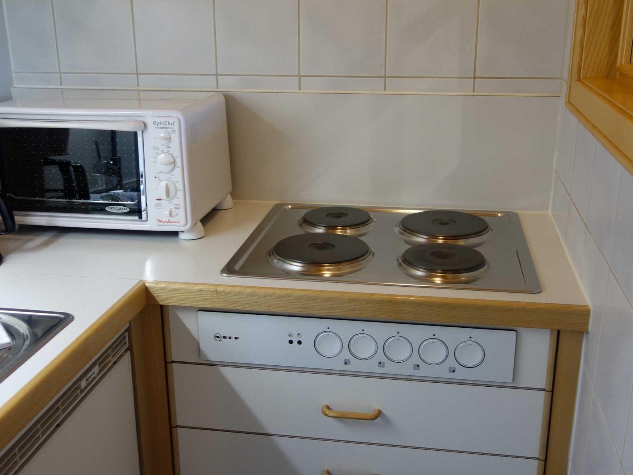 Wohnzimmer mit Essecke, kleine Küche, Schlafzimmer mit Doppelbett, Dusche und WC.