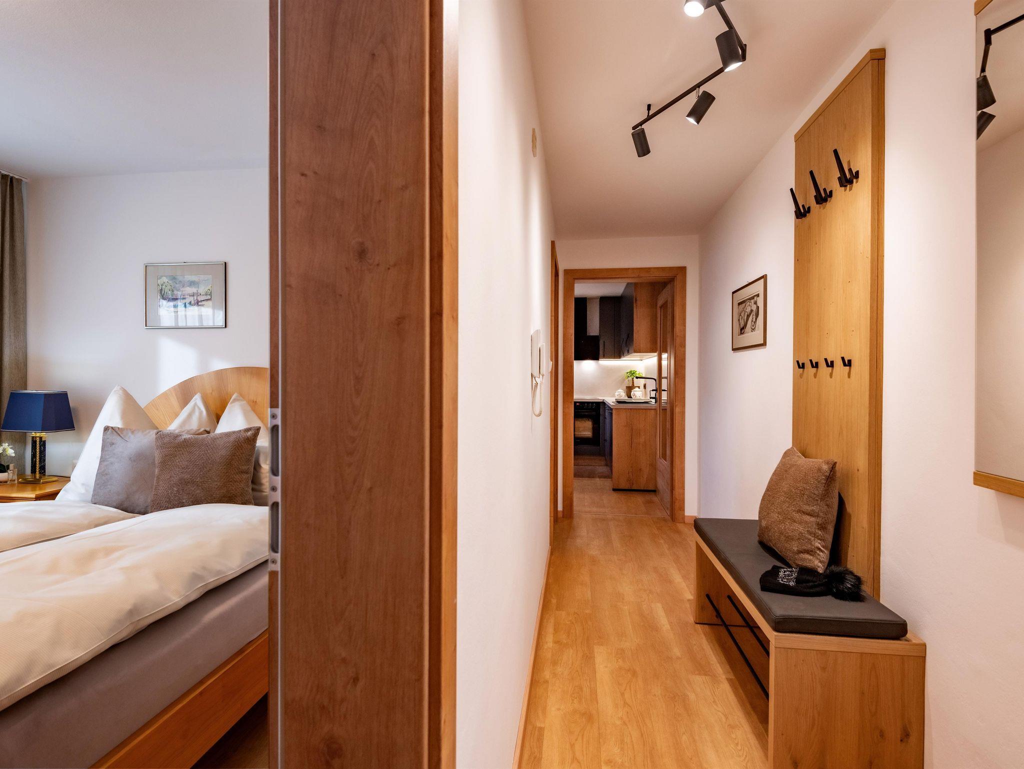 Das 50m2 große Appartement für 4 Personen liegt im Erdgeschoss und besteht aus einer Wohnküche mit direktem Terrassenzugang, Dusche/WC, Flur mit Garderobe und zwei Schlafzimmern. Die neuen Möbel sind in einem modern/ländlichen Stil gehalten.