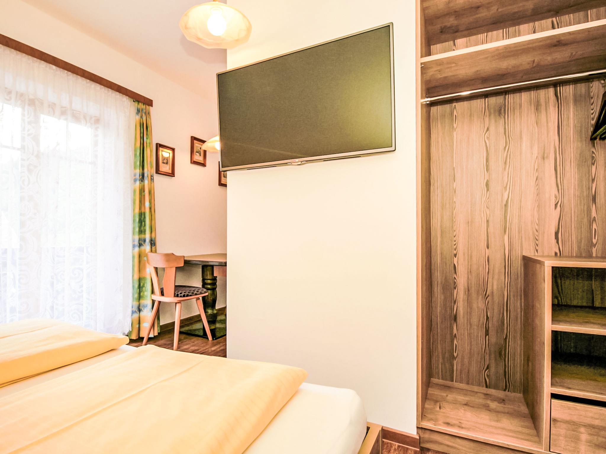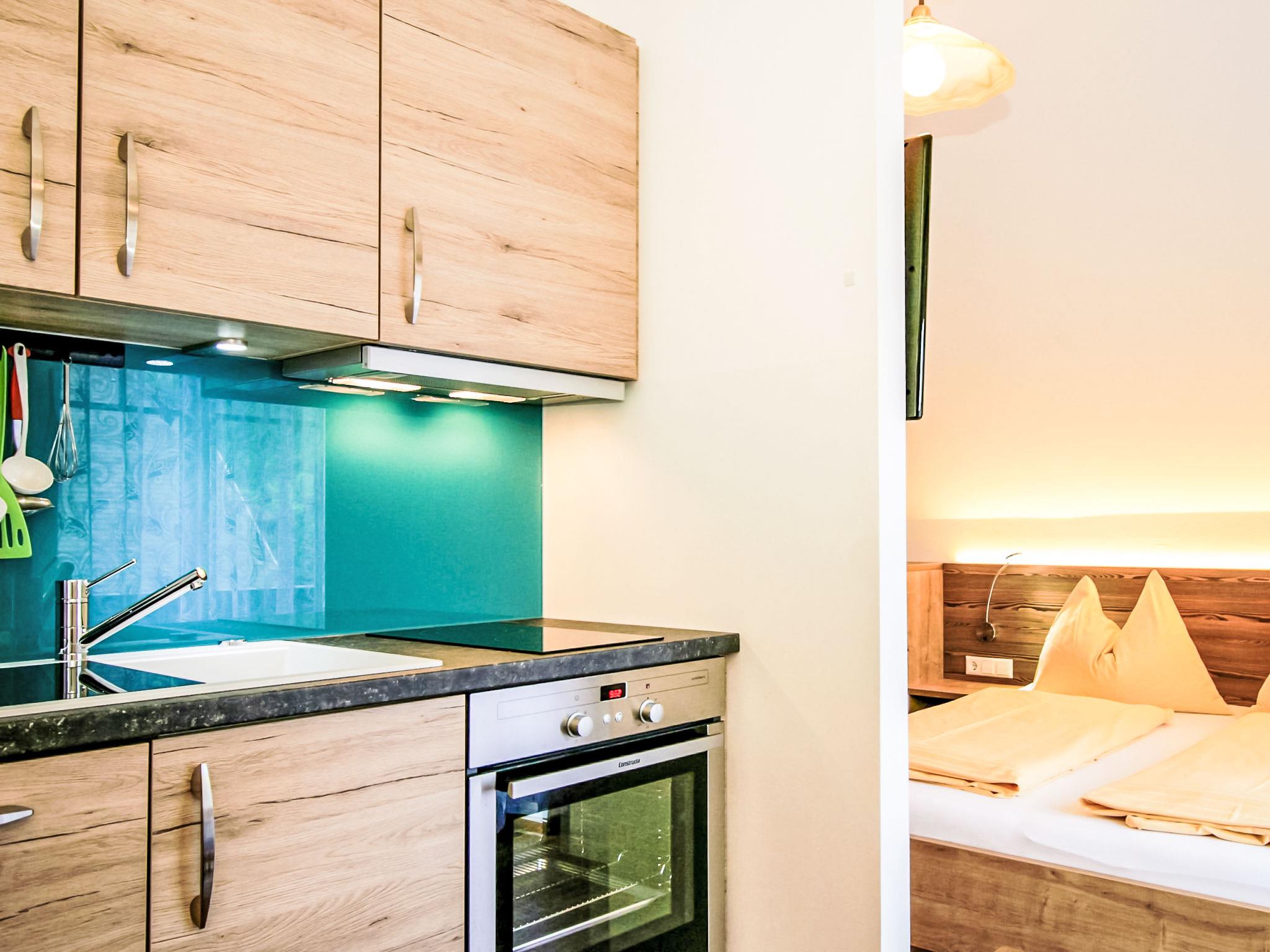 "Dirndl und Bua", 1-room studio 30 m2, on the top floor. Fully renovated, comfortable and tasteful furnishings: entrance hall. 1 open room with 1 double bed and cable TV. Exit to the balcony. Small kitchenette (oven, dishwasher, 2 ceramic glass hob hotplates, microwave, electric coffee machine) with dining table. Shower/WC. Balcony. Balcony furniture. View of the mountains and the resort. Facilities: safe, hair dryer. Internet (WiFi, free). Please note: non-smokers only. Smoke alarm, fire extinguisher, no lift.