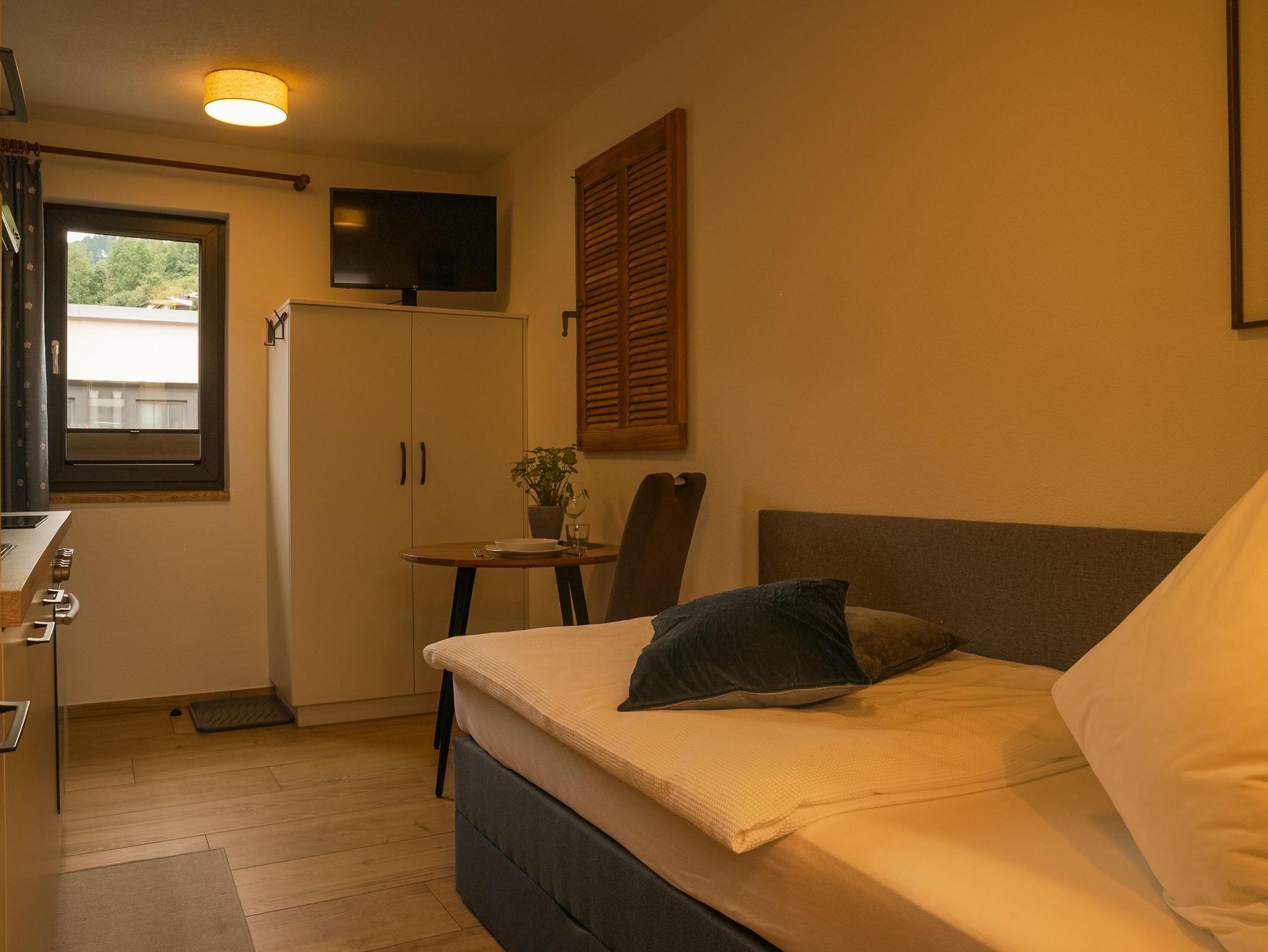 Klein, aber fein ist unser Studio Leiten mit nur ca. 18 m² im 1. Obergeschoß. Diese kleine Wohnung ist für 1 Person gedacht und verfügt über ein Boxspringbett, einen Küchenblock mit E-Herd und Backrohr, Dunstabzug, Wasserkocher, Kaffeemaschine, Toaster, Esstisch und Sat-TV. Das neue Bad befindet sich gleich anschließend an den Wohnbereich.