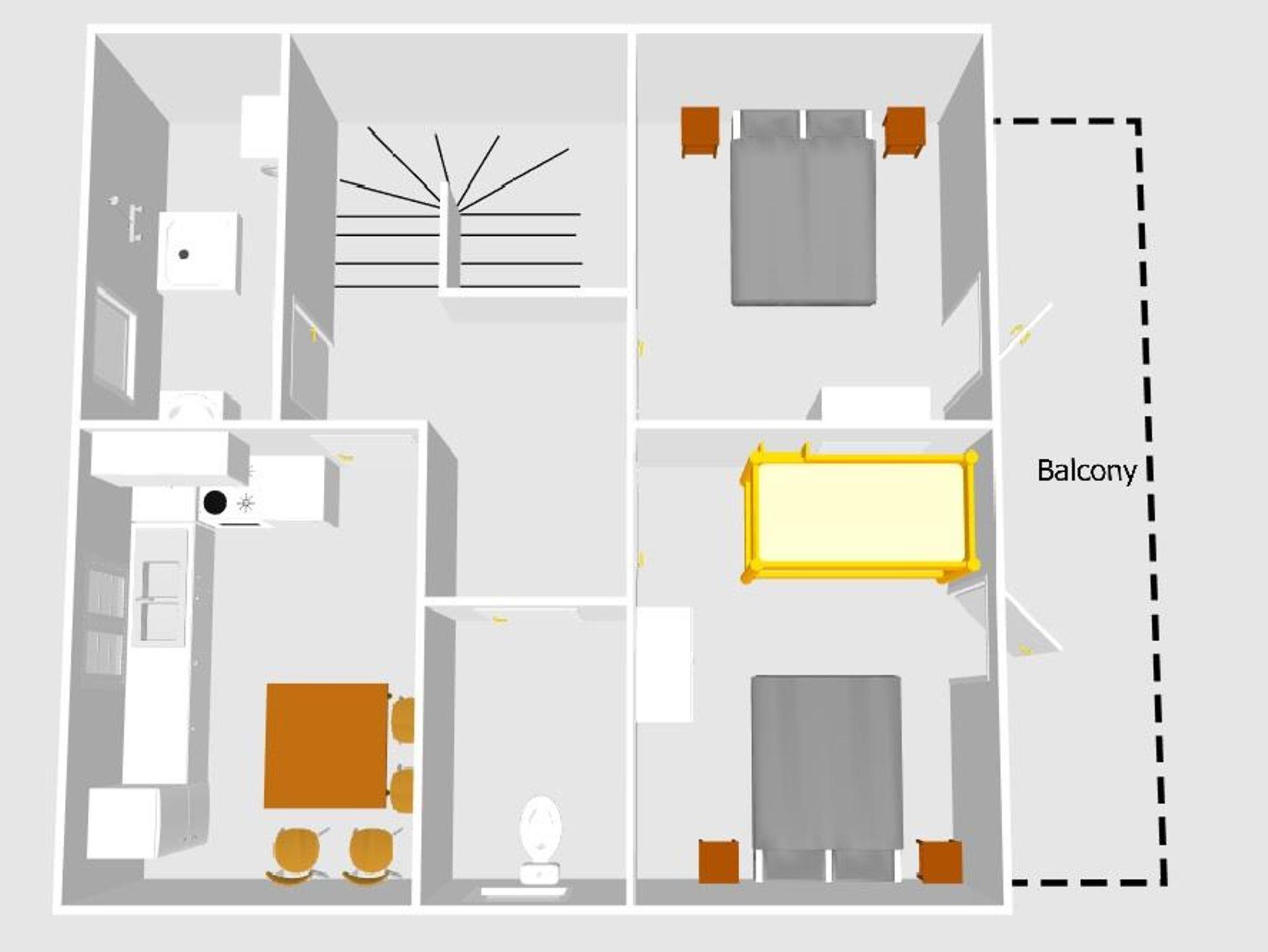 Das Ferienhaus bietet Platz für sechs Personen. Die Unterkunft hat zwei Schlafzimmer mit einem geräumigen Balkon, einem modernen Badezimmer mit Waschmaschine und einer offenen Küche mit Essbereich. Die Küche ist komplett eingerichtet mit Backoffen, Mikrowelle und Geschirrspüler. Eines der Schlafzimmer hat ein zusätzliches Stockbett.
