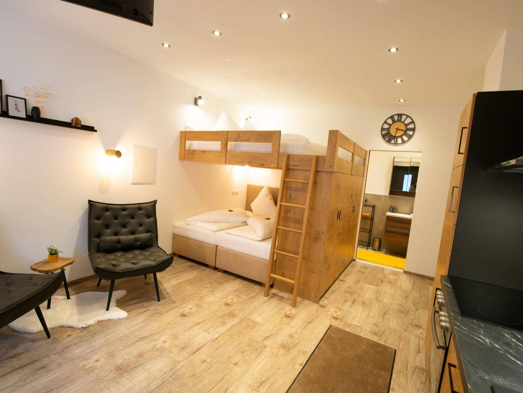 Unser W- Spirit Apartment 2 ist 30m2 groß und bietet Platz für 4 Personen. Die Wohnung verfügt über eine Küche, einen Essbereich, ein Doppelbett, ein Doppelhochbett und ein Badezimmer. Außerdem verfügt unsere Wohnung 2 über eine 8m2 große, überdachte Terrasse. Kostenloses W-Lan und ein Sat-TV sind ebenfalls für Sie verfügbar.