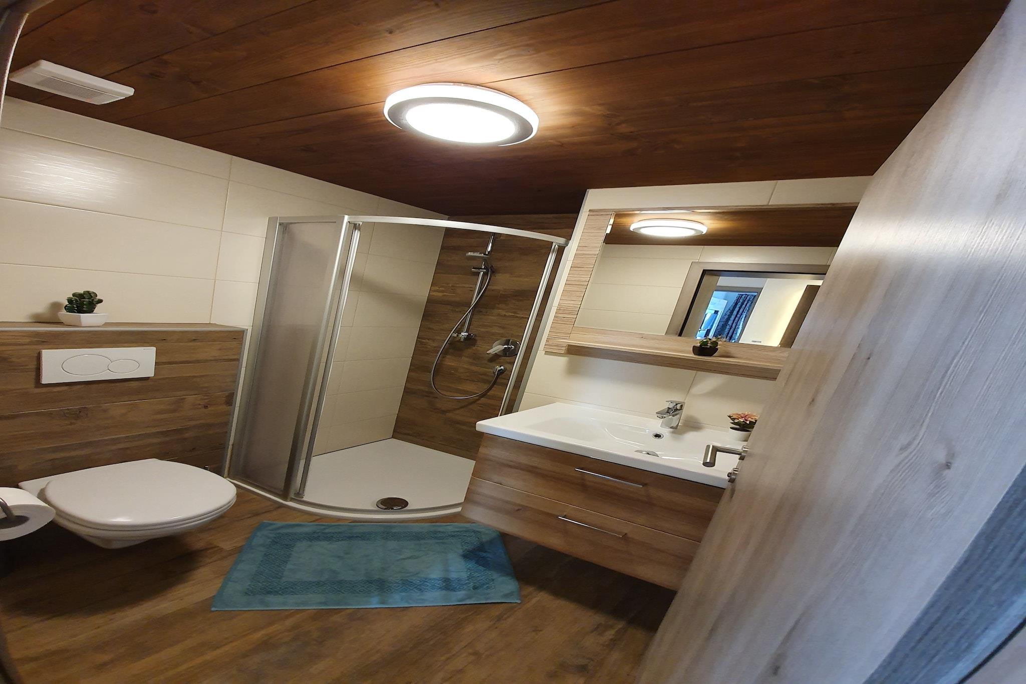 Ground floor: (hall, Living room(TV(satellite)), open kitchen(cooker, coffee machine, oven, microwave, dishwasher), bedroom(double bed, TV), bedroom(bunk bed, TV), bedroom(double bed, TV), bedroom(double bed, bunk bed), bathroom(shower, washbasin, toilet), bathroom(shower, washbasin, toilet), bathroom(shower, washbasin, toilet)) washing room(washing machine(shared with other guests, paid)), ski storage, carport, balcony, heating(central), parking, children's bed, high chair